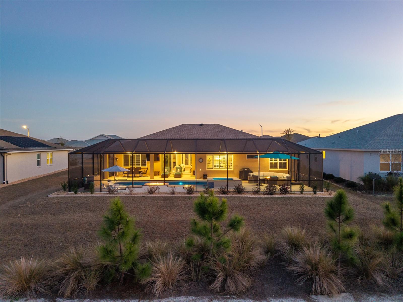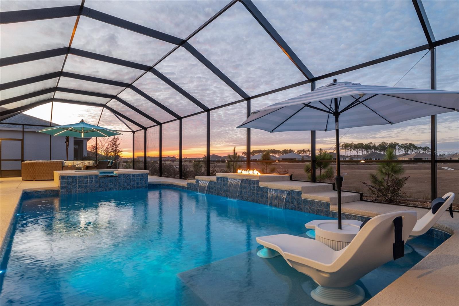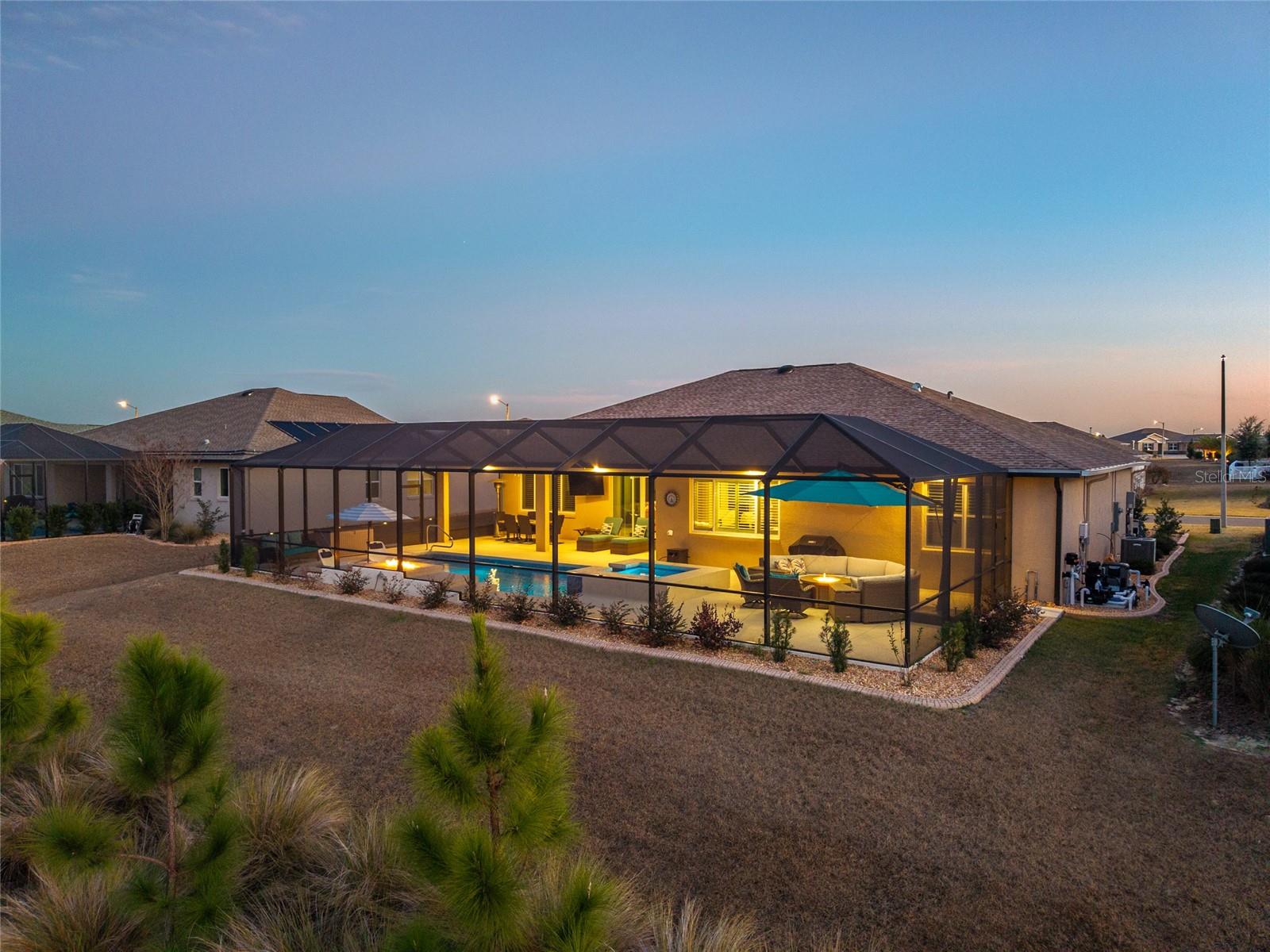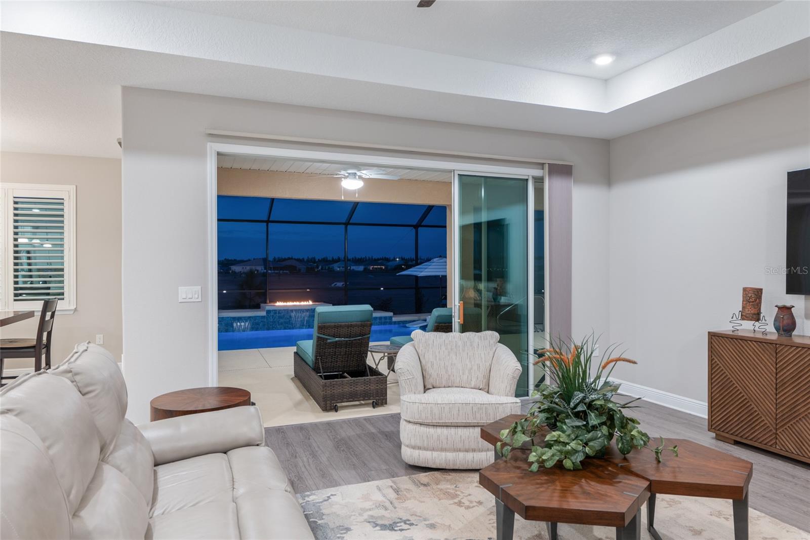 This exceptional Dunbar model showcases refined design, high-end finishes, and resort-style outdoor living, anchored by a one-year-old pool and spa with fire feature, full screen enclosure, and retention pond–front privacy. The chef’s kitchen is both elegant and functional, highlighted by quartz countertops with a full slab backsplash, upgraded tile flooring, and custom cabinetry with soft-close doors, drawers, and pull-out storage. Recessed lighting and cabinetry on both sides of the oversized island elevate the space, while a walk-in pantry with newer wood shelving adds a tailored, custom feel. Plantation shutters throughout complete the clean, upscale aesthetic. Designed for comfort and privacy, the split-bedroom layout offers two private suites and an additional bedroom with a full bath. The primary suite is a true retreat, featuring a tray ceiling, dual-sink vanity, spa-inspired finishes with floor-to-ceiling tile, and a walk-through closet with direct access to the laundry room. Entertaining is effortless with a built-in bar area, while thoughtful details such as owner’s entry cabinetry, crown molding on cabinetry, tray ceilings in the living area and entry, and dual sidelights at the front door enhance the home’s architectural appeal and natural light. The garage space is equally impressive, offering epoxy-coated floors, an extra-wide bay accommodating two golf carts, plus a separate two-car garage. A new washer, dryer, and refrigerator are included, and select furnishings may be available outside of contract. A rare blend of luxury, privacy, and thoughtful design—this retention pond–front home delivers elevated living at its finest.