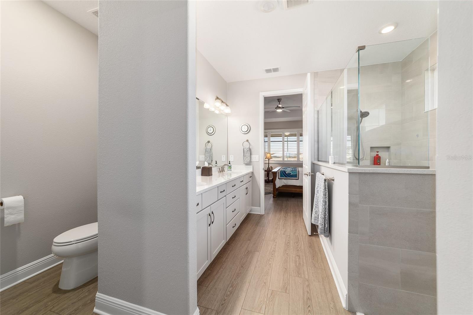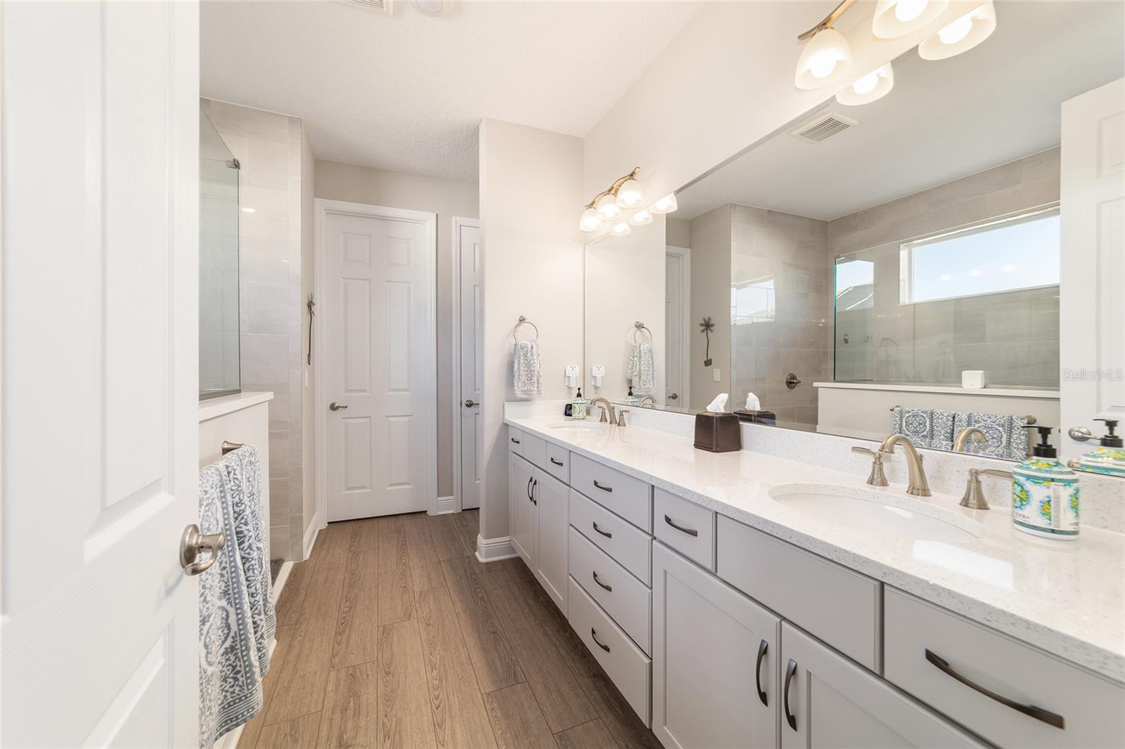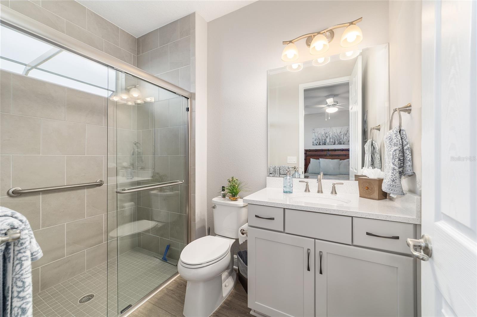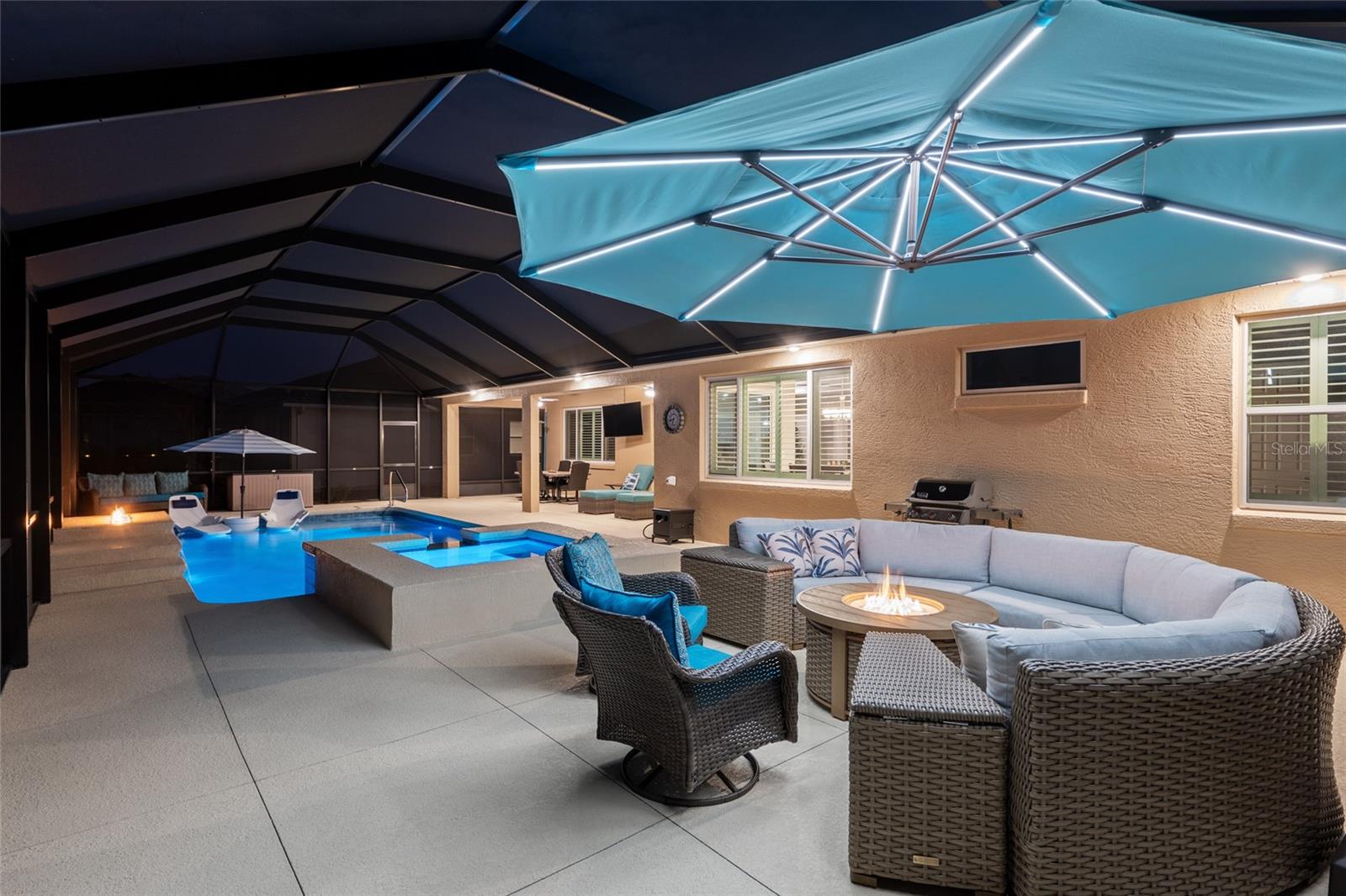 This exceptional Dunbar model showcases refined design, high-end finishes, and resort-style outdoor living, anchored by a one-year-old pool and spa with fire feature, full screen enclosure, and retention pond–front privacy. The chef’s kitchen is both elegant and functional, highlighted by quartz countertops with a full slab backsplash, upgraded tile flooring, and custom cabinetry with soft-close doors, drawers, and pull-out storage. Recessed lighting and cabinetry on both sides of the oversized island elevate the space, while a walk-in pantry with newer wood shelving adds a tailored, custom feel. Plantation shutters throughout complete the clean, upscale aesthetic. Designed for comfort and privacy, the split-bedroom layout offers two private suites and an additional bedroom with a full bath. The primary suite is a true retreat, featuring a tray ceiling, dual-sink vanity, spa-inspired finishes with floor-to-ceiling tile, and a walk-through closet with direct access to the laundry room. Entertaining is effortless with a built-in bar area, while thoughtful details such as owner’s entry cabinetry, crown molding on cabinetry, tray ceilings in the living area and entry, and dual sidelights at the front door enhance the home’s architectural appeal and natural light. The garage space is equally impressive, offering epoxy-coated floors, an extra-wide bay accommodating two golf carts, plus a separate two-car garage. A new washer, dryer, and refrigerator are included, and select furnishings may be available outside of contract. A rare blend of luxury, privacy, and thoughtful design—this retention pond–front home delivers elevated living at its finest.