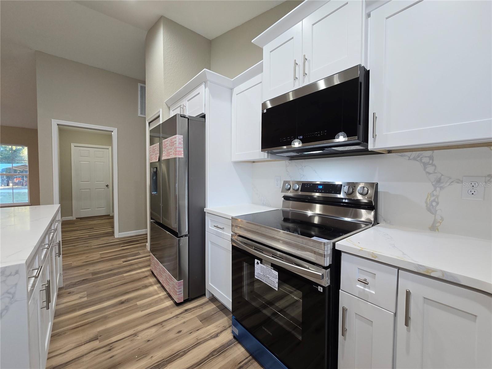 Come see this wonderfully styled, 3 bedroom, 2 bath, 2 car garage on a OVERSIZED .27 AC LOT in the very popular Silver Springs Shores area. This home features a split plan, high ceilings & QUARTZ STONE counters in the KITCHEN, BATHROOMS & WINDOW LEDGES! When you step in side, you will notice the open design with tall ceilings and a split floor plan. The primary bedroom features an oversized closet & en suite bathroom with A FULLY TILED, EZ ENTRY SHOWER & linen closet. The kitchen, has whisper quiet drawers & UPGRADED cabinets with stylish knobs. Gorgeous sink with a beautiful open view. DELUXE SMART APPLIANCE PACKAGE INCLUDES Stainless steel Fridge, Dishwasher, Stove & Microwave comes with the home. A beautifully patterned Quartz counter island comes with room for chairs. Nearby, you have access to the laundry room & garage via a handy pocket door. Across the house, the secondary rooms share the bathroom and will have good space for a full size bedroom set, office, or a game room. The choices are endless! Ample closet space has been supplied as well for all of their storage needs. The .27 acre OVERSIZED LOT gives you plenty of room for all of your toys! NOT IN AN HOA so you are free to build a fence, add a pool, do what you want, how you want! On a well and septic system so NO UTILITY BILLS is also a great plus! If you install back up power in preparation for any possible outage, you will still have use of water and sewer as long as you have electric! Close enough to give you access to Belleview, Summerfield, The Villages, The Interstate and beyond. Less than 10 min to Wal-Mart, Publix, Aldi & Save a Lot, The post office, 3 auto parts stores & car washes as well as many food & medical offices nearby for ease. A short drive in either direction will lead to Ocala's downtown square or to our famous Lake Weir, where you can boat, kayak, jet ski, or enjoy a meal on the lake over looking the sunset. USDA, First Time Homebuyer & Veteran friendly! Almost completed, you can be in QUICKLY!