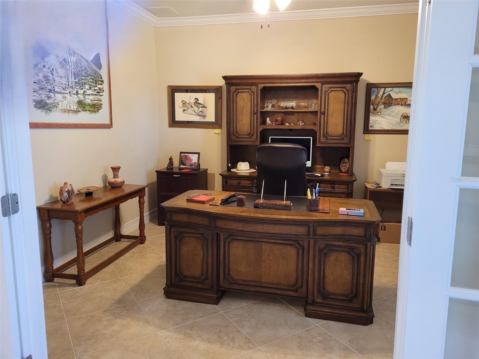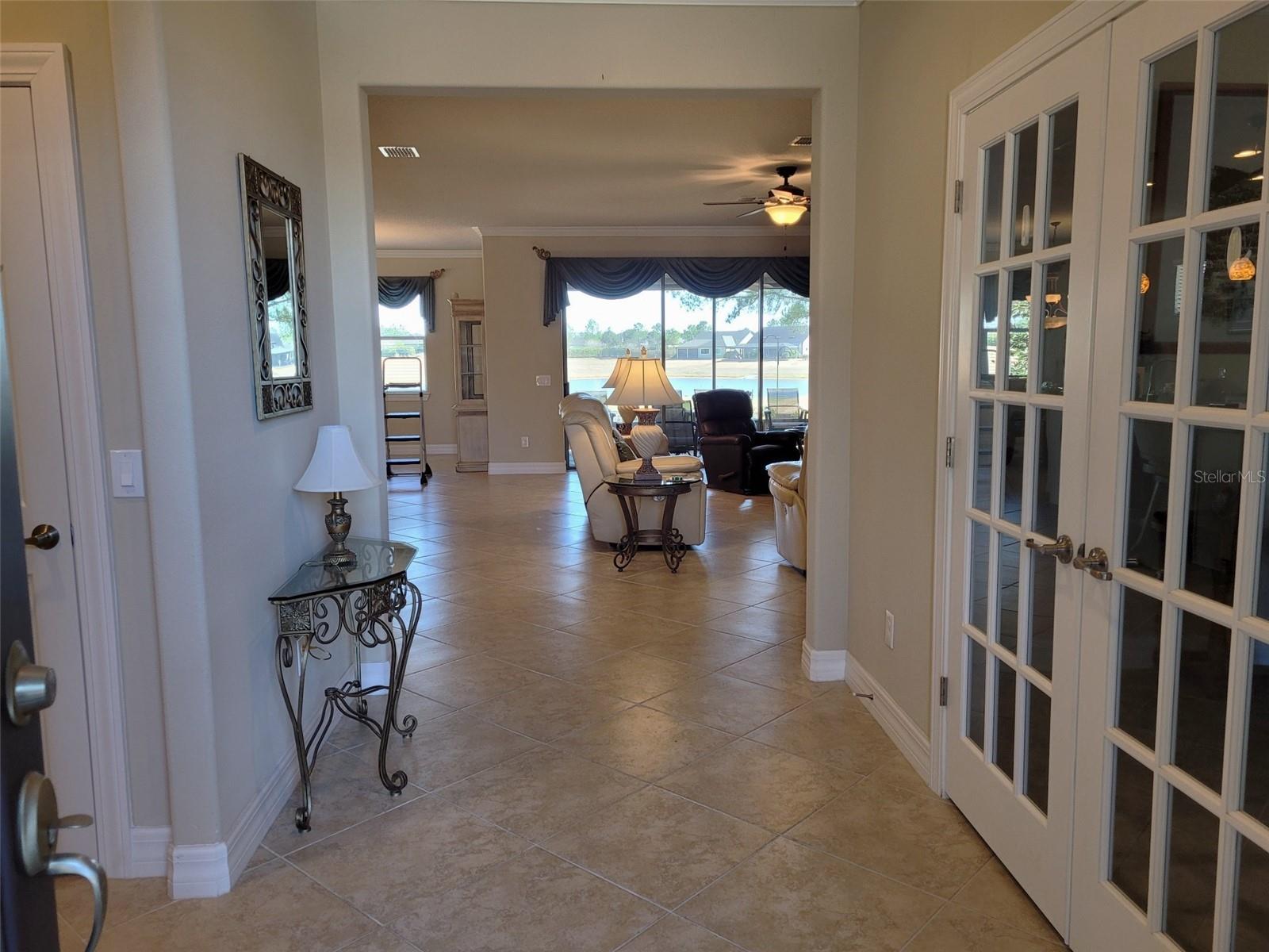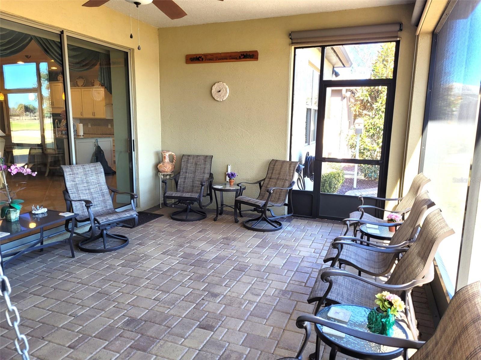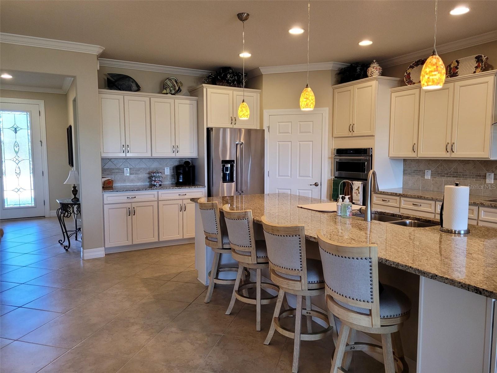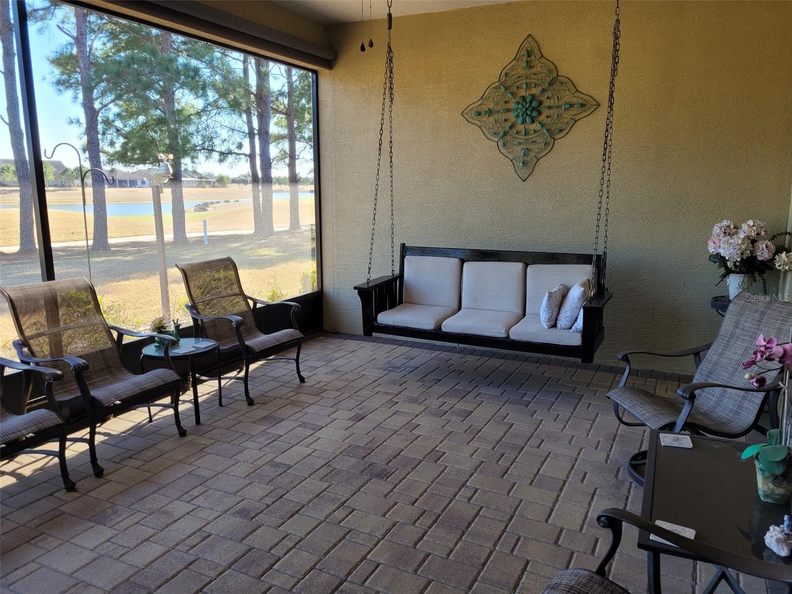 Stunning Pinnacle model overlooking the golf course and lake. 3 bedrooms, 3 baths, with bonus room for an office, 4 foot extended garage, inside laundry room with utility sink, comfort height granite countertops in all bathrooms and kitchen, roman style walk-in shower and double sinks in master bath, pavers on driveway- front walkway and front porch- and rear lanai, kitchen under cabinet lighting, upgraded kitchen appliances, 3-door refrigerator-freezer, built-in microwave & oven, cook top with chrome exhaust hood, ceiling fans, leaf filter gutters, redesigned front walk, Ceiling is 9' 3", all 3 bedrooms have walk-in closets with master bedroom closet being 118 sq. ft., custom landscaping, stone accents on house front, garden hose w/reels front & back, open floor plan, all new smoke detectors, championship golf course, resort style pools (indoor & outdoor), professional gym with classes, dozens of clubs, live entertainment. Lanai swing does not stay.