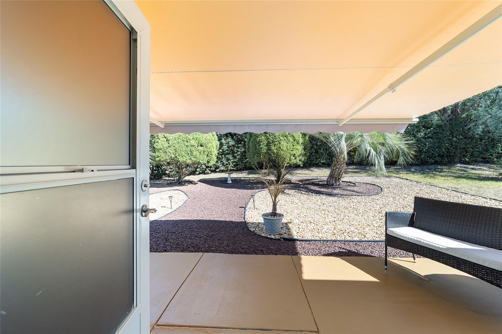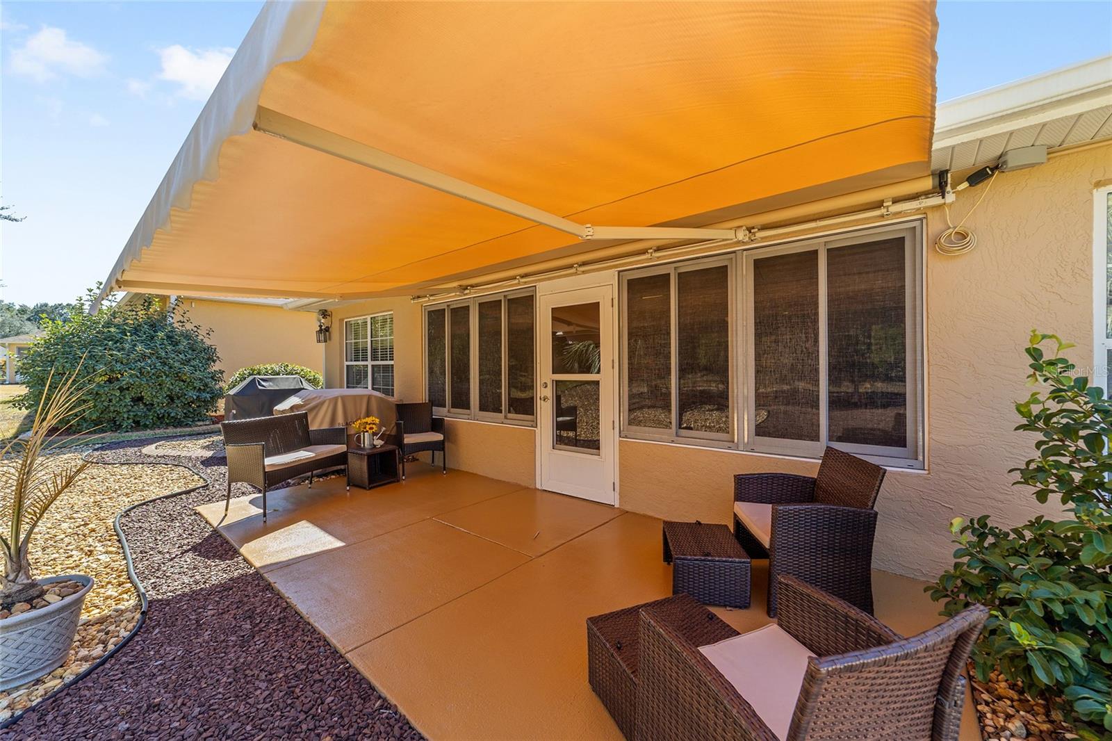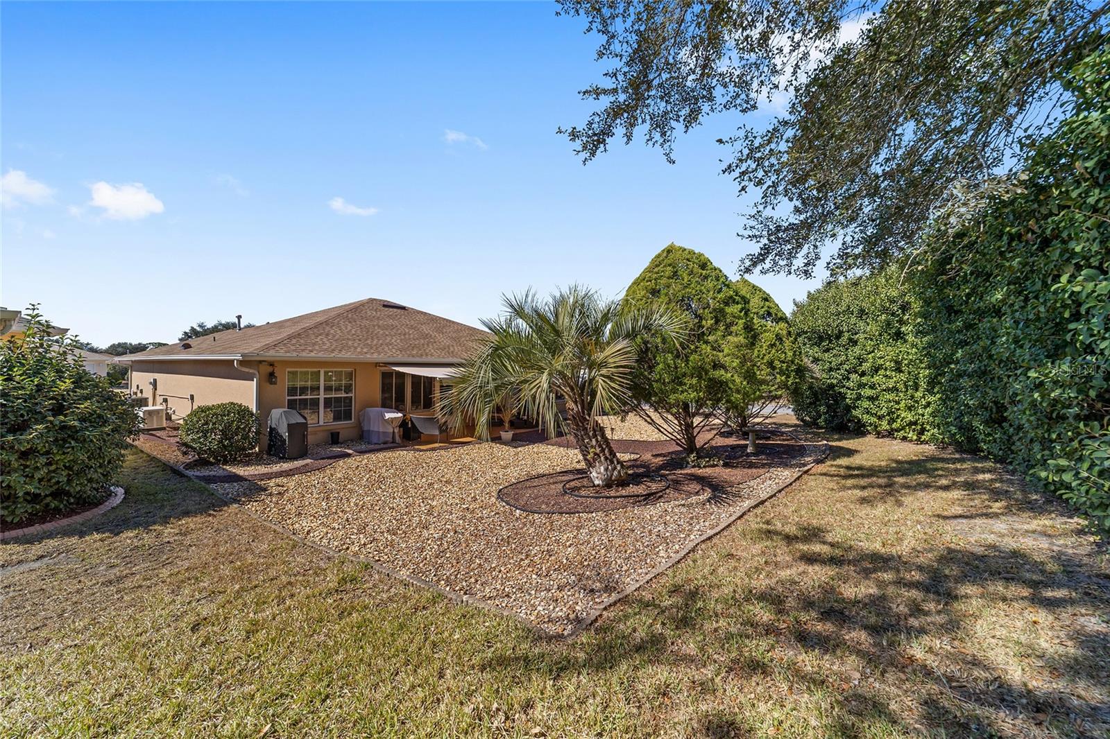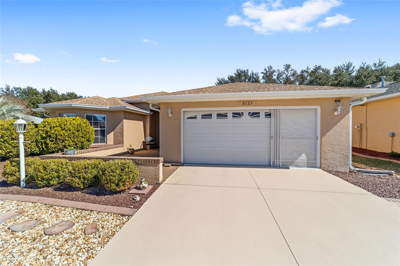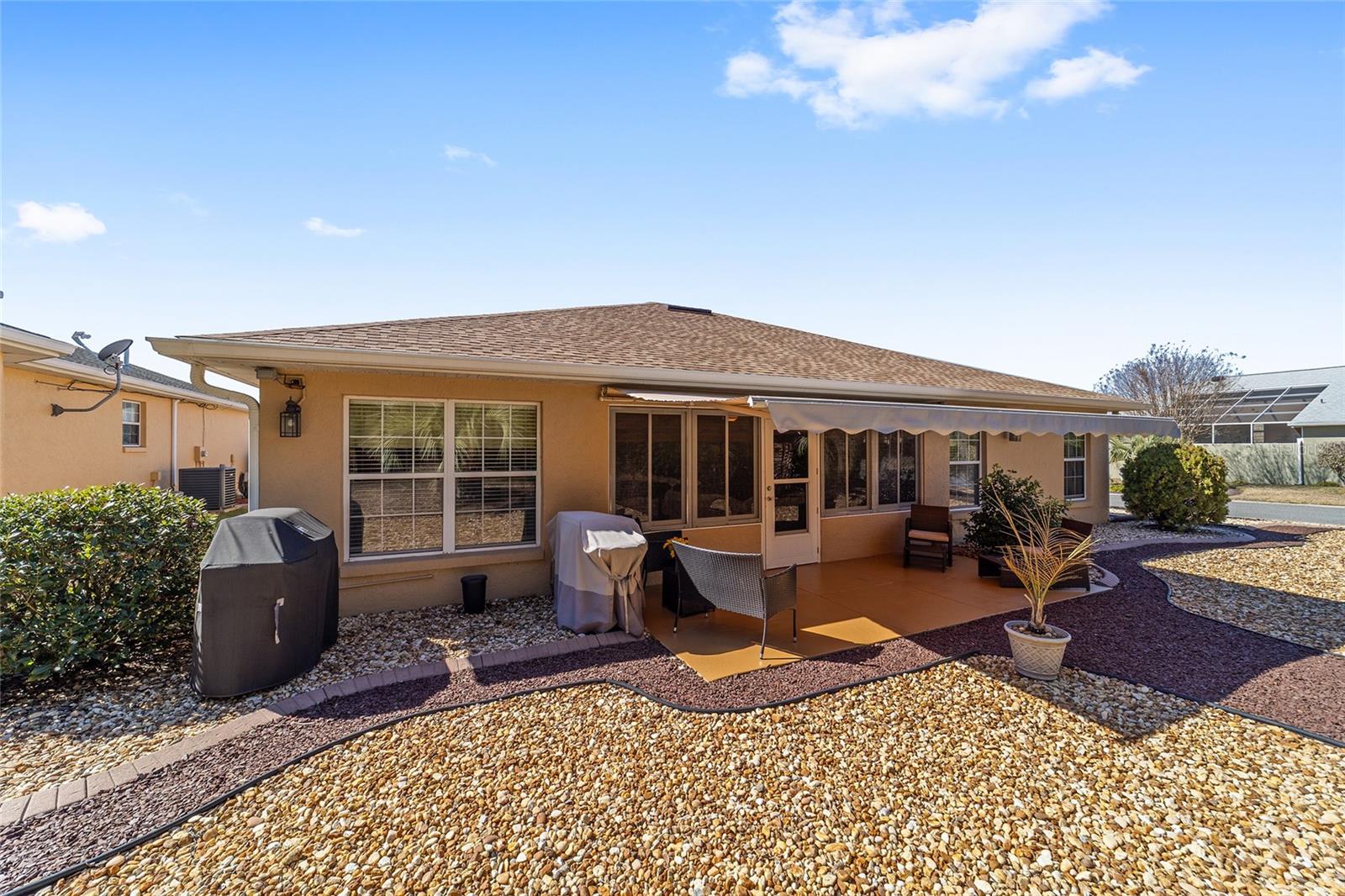 PRIVATE CORNER LOT | NEW ROOF | WHOLE-HOUSE GENERATOR | 1-YEAR HOME WARRANTY: Located on a private corner lot in the desirable gated Indigo East community, this beautifully maintained "snowbird" Pennyroyal Gold model offers over 1,700 square feet of stylish, move-in-ready living. With a brand-new roof (2025), a whole-house generator, and a 1-year home warranty, this home delivers comfort, quality, and peace of mind. A welcoming courtyard entrance invites you inside to a soothing gray-and-white palette, tile flooring throughout (carpet only in the guest bedroom), crown molding, specialty millwork, recessed lighting, and solar tubes that fill the home with natural light. The spacious great room has been freshly painted and is ideal for both everyday living and entertaining. The updated kitchen features granite countertops, solid oak cabinets with pull-out shelving and crown molding, a pantry, and a breakfast bar overlooking the great room. The primary suite serves as a relaxing retreat with a coffered ceiling, crown molding, chair-rail detail, dual walk-in closets, and an en-suite bath offering double vanities, a large walk-in tiled shower with bench seating, and a soaking garden tub perfect after a day on the nearby Candler Hills golf course. The guest bedroom is equally generous in size. Enjoy Florida living year-round in the enclosed lanai, complete with a dry bar, roll-down room-darkening shades, and eastern exposure. Outside, the brick-paver rear lanai offers specialty lighting, a retractable awning, and no rear neighbors, creating a private outdoor retreat with the community garden nearby. The two-car garage impresses with epoxy flooring, pull-down attic access, an insulated door, sliding garage screens, and a dedicated panel box for the generator. The home's zero-scape landscaping with sculpted earth-tone stone enhances curb appeal while keeping maintenance to a minimum. For added convenience, the like-new furniture is available for purchase. Residents of Indigo East enjoy private amenities including two pools, a hot tub, clubhouse, fitness center, dog park, and miles of walking trails, along with curbside mail and waste collection. As part of the On Top of the World community, homeowners also enjoy access to OTOW'S Square and Master the Possibilities. On Top of the World is Ocala's premier 55+ golf-resort community, offering golf-cart access to shopping, dining, entertainment, health, and beauty services.