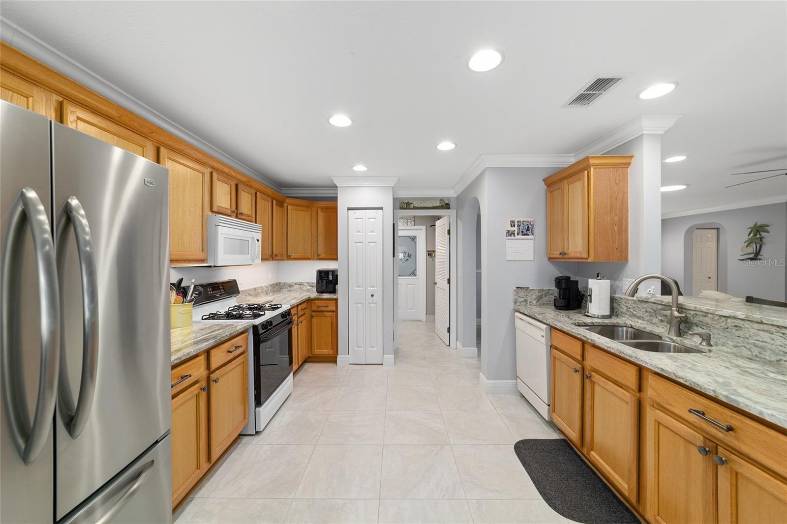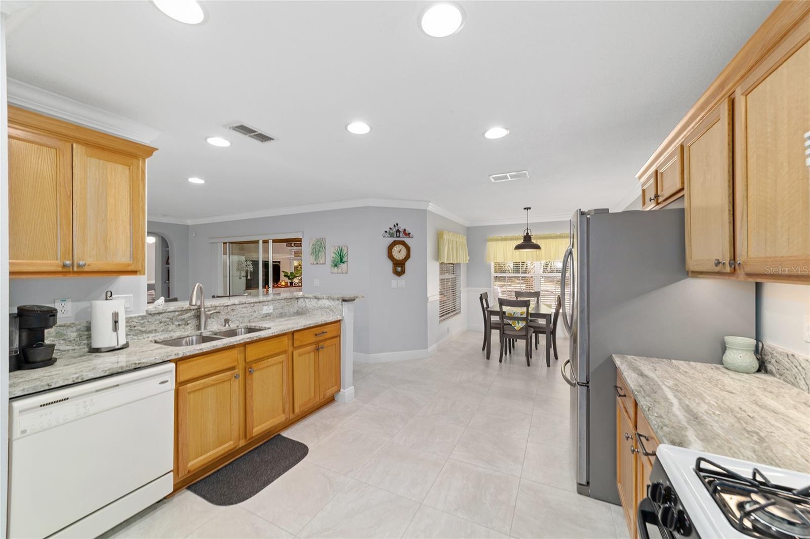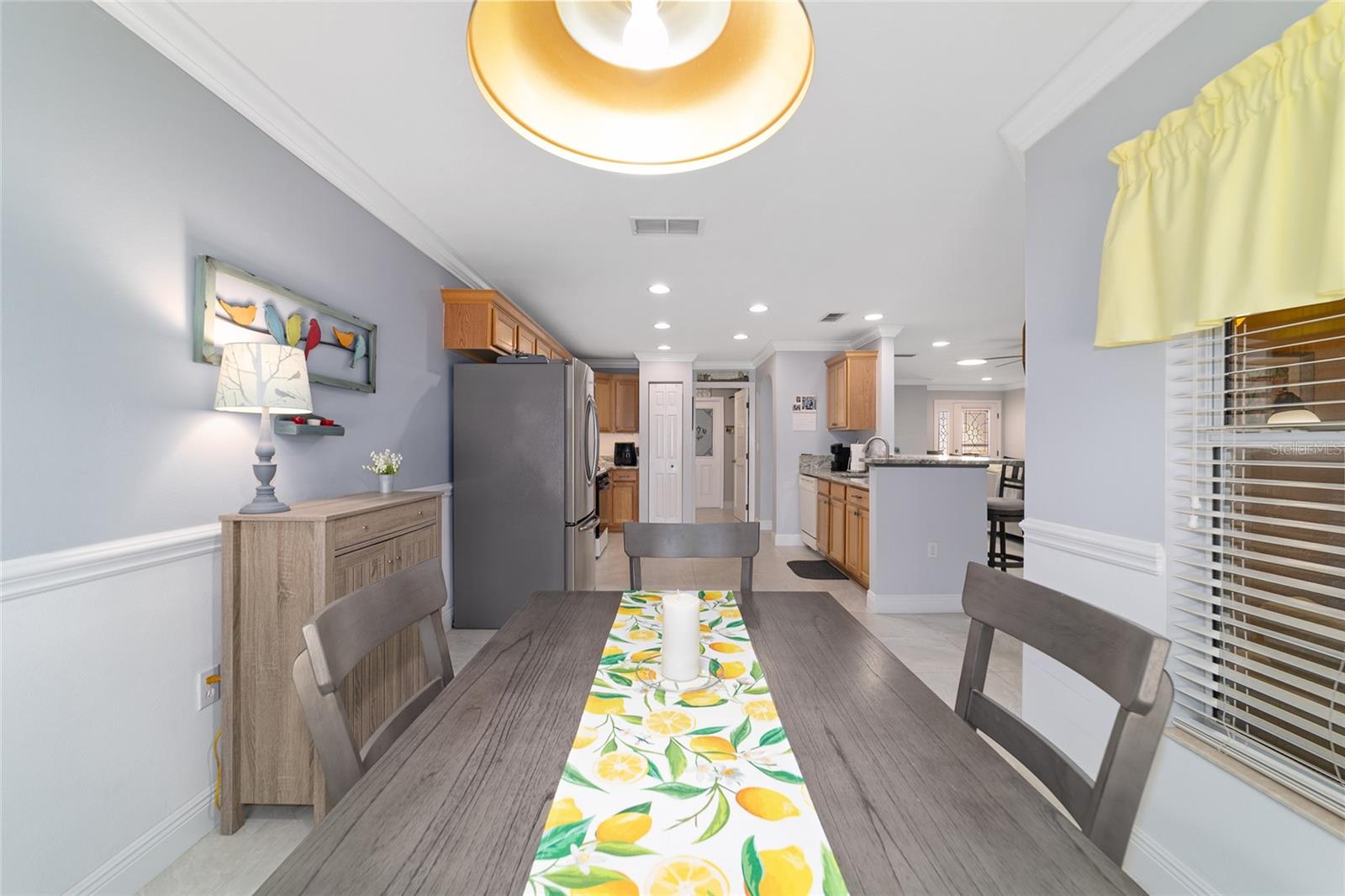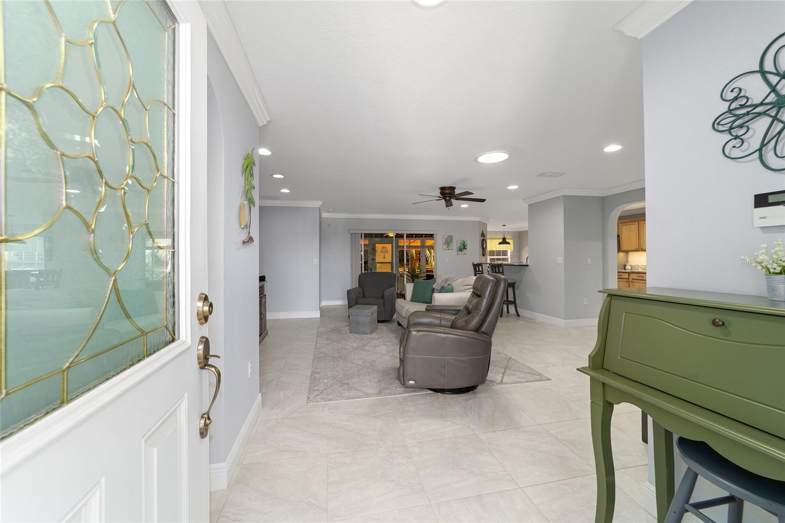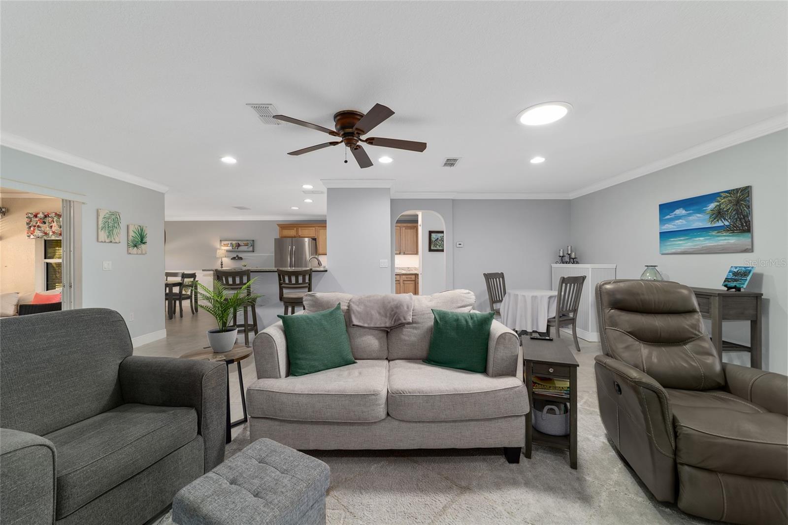 PRIVATE CORNER LOT | NEW ROOF | WHOLE-HOUSE GENERATOR | 1-YEAR HOME WARRANTY: Located on a private corner lot in the desirable gated Indigo East community, this beautifully maintained "snowbird" Pennyroyal Gold model offers over 1,700 square feet of stylish, move-in-ready living. With a brand-new roof (2025), a whole-house generator, and a 1-year home warranty, this home delivers comfort, quality, and peace of mind. A welcoming courtyard entrance invites you inside to a soothing gray-and-white palette, tile flooring throughout (carpet only in the guest bedroom), crown molding, specialty millwork, recessed lighting, and solar tubes that fill the home with natural light. The spacious great room has been freshly painted and is ideal for both everyday living and entertaining. The updated kitchen features granite countertops, solid oak cabinets with pull-out shelving and crown molding, a pantry, and a breakfast bar overlooking the great room. The primary suite serves as a relaxing retreat with a coffered ceiling, crown molding, chair-rail detail, dual walk-in closets, and an en-suite bath offering double vanities, a large walk-in tiled shower with bench seating, and a soaking garden tub perfect after a day on the nearby Candler Hills golf course. The guest bedroom is equally generous in size. Enjoy Florida living year-round in the enclosed lanai, complete with a dry bar, roll-down room-darkening shades, and eastern exposure. Outside, the brick-paver rear lanai offers specialty lighting, a retractable awning, and no rear neighbors, creating a private outdoor retreat with the community garden nearby. The two-car garage impresses with epoxy flooring, pull-down attic access, an insulated door, sliding garage screens, and a dedicated panel box for the generator. The home's zero-scape landscaping with sculpted earth-tone stone enhances curb appeal while keeping maintenance to a minimum. For added convenience, the like-new furniture is available for purchase. Residents of Indigo East enjoy private amenities including two pools, a hot tub, clubhouse, fitness center, dog park, and miles of walking trails, along with curbside mail and waste collection. As part of the On Top of the World community, homeowners also enjoy access to OTOW'S Square and Master the Possibilities. On Top of the World is Ocala's premier 55+ golf-resort community, offering golf-cart access to shopping, dining, entertainment, health, and beauty services.