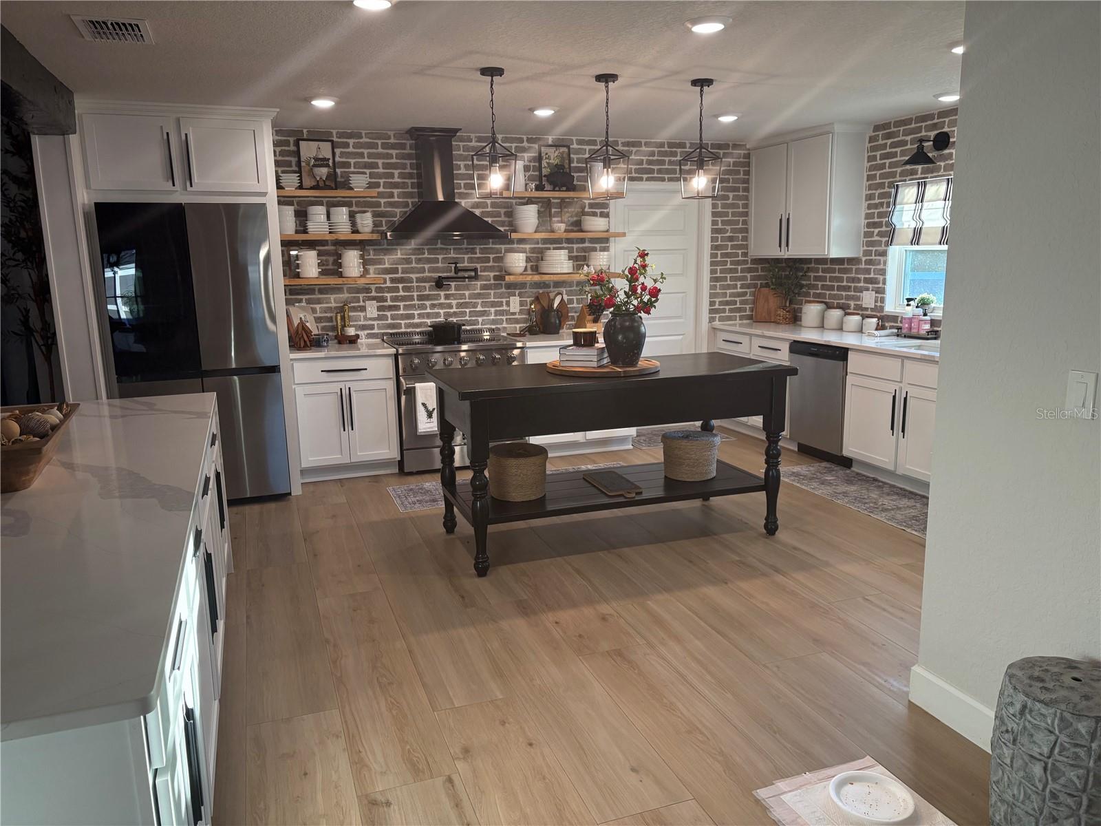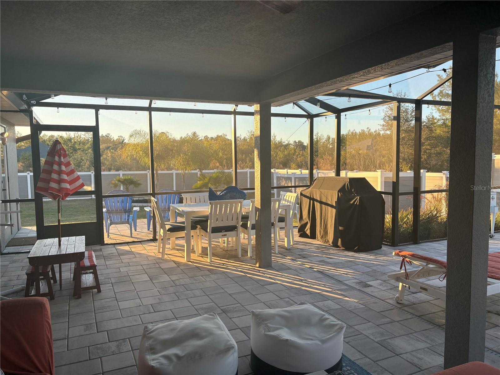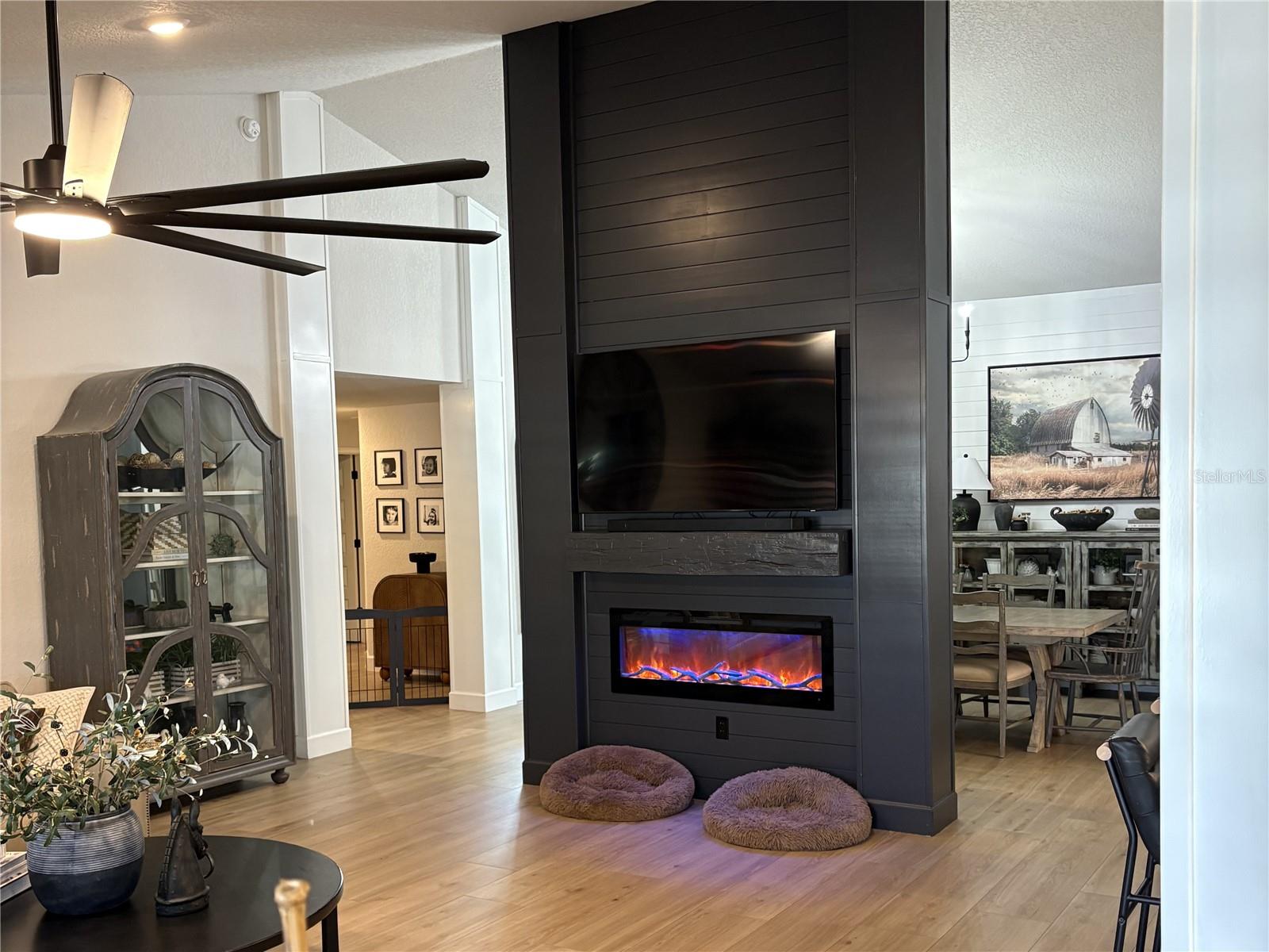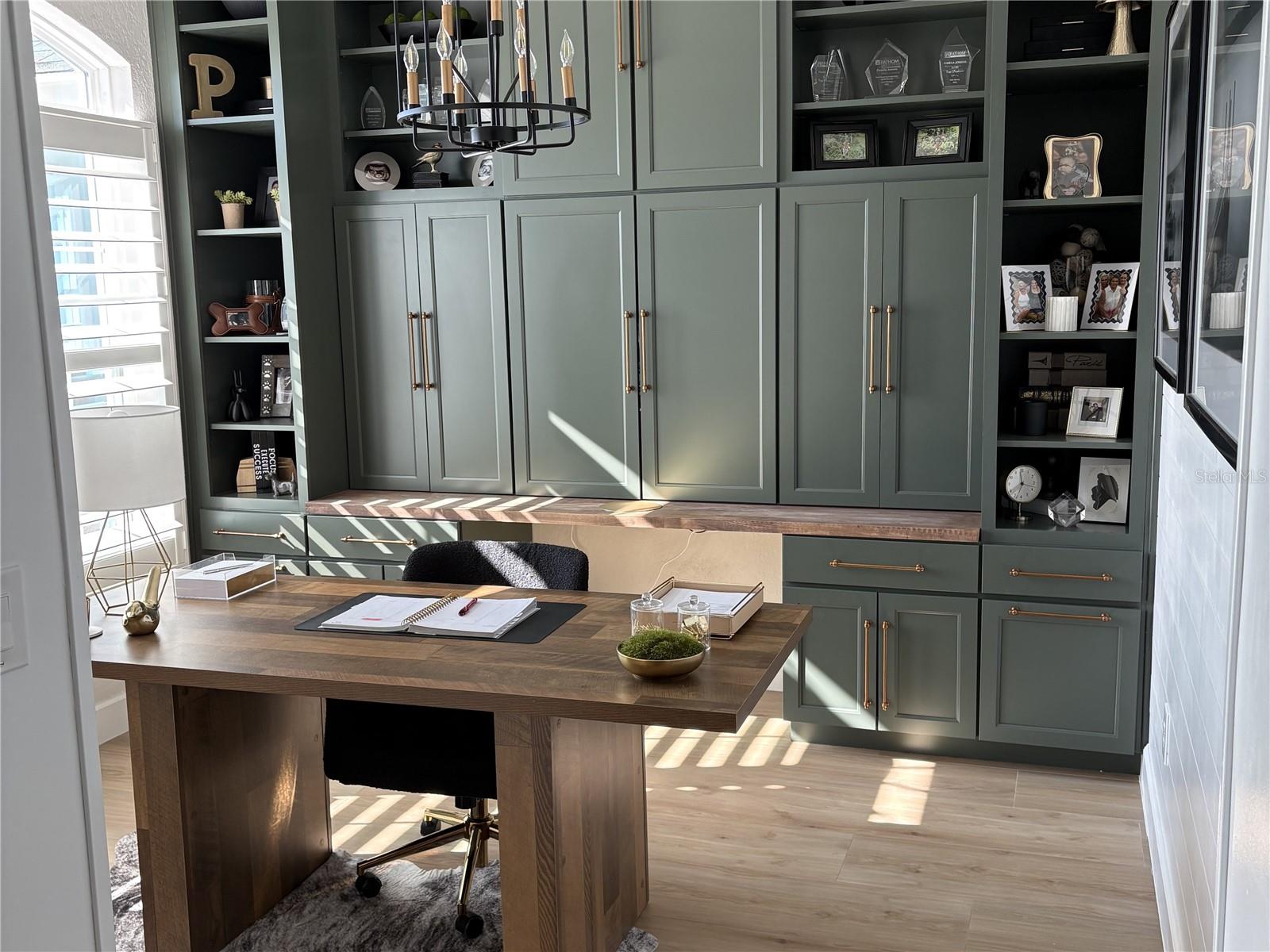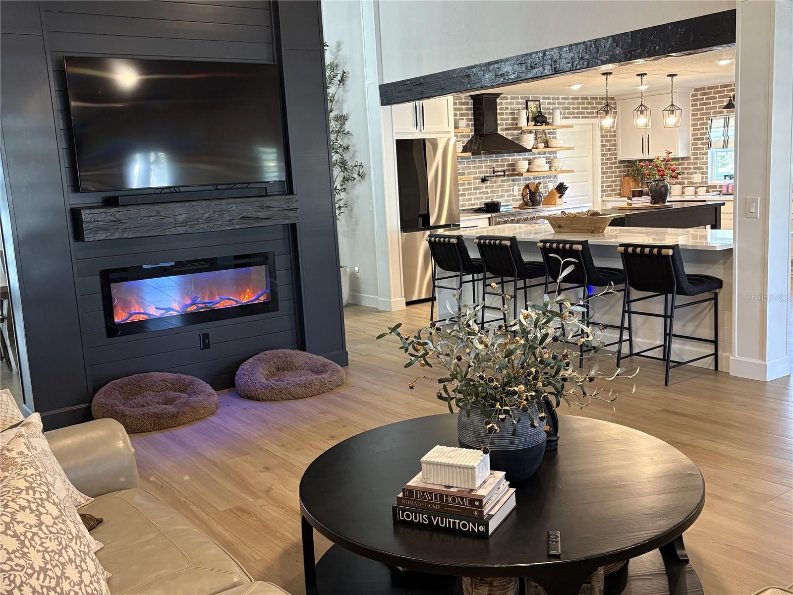 Absolutely spectacular 2-year-new pool home with extensive custom upgrades! This stunning residence offers approximately 3,000 sq ft of living space with 4 bedrooms plus an office, 3 full bathrooms, and a 2-car garage, all situated on over a half-acre lot with NO HOA or CDD fees. Luxury finishes abound, including 12x60 wood-look tile flooring throughout and custom window treatments on every window. The family and dining rooms feature soaring 13-foot vaulted ceilings and an electric fireplace, creating a dramatic yet inviting living space. The open-concept kitchen is a showstopper, showcasing quartz countertops, black hardware, brick backsplash, floating shelves, a 36” freestanding stove, and a pot filler. Adjacent to the kitchen is a large walk-in pantry with added cabinetry, providing additional storage. The spacious primary suite offers a true retreat with multiple walk-in closets, an electric fireplace, and a coffered ceiling. The ensuite bathroom features a soaking tub, separate shower, dual sinks, and a dedicated vanity area. The office boasts 10-foot ceilings and beautiful green cabinetry, perfect for working from home. Three additional generously sized bedrooms and two additional full bathrooms complete the interior. Outdoor living is just as impressive, featuring a 15x30 screened-in pool surrounded by pavers and a covered lanai ideal for outdoor dining and entertaining. The fully fenced and landscaped backyard, offering privacy and tranquility. This exceptional home combines modern luxury, thoughtful design, and outdoor living - a rare opportunity with no HOA or CDD.