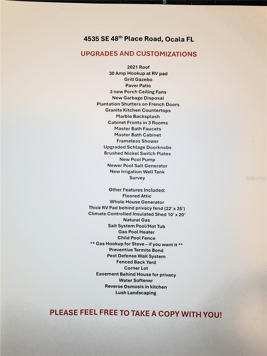 Welcome to your own private slice of Ocala! This gorgeous POOL HOME is nestled on a spacious .60-acre lot in a desirable southeast Ocala location. Come see this beautifully maintained 4-bedroom Three way Split Floorplan, 2 1/2-bath home in a family-friendly, active community. Large Master suite w/2 Closets, soaker tub, dual split sinks with in-mirror lighting, and a beautiful updated glass shower enclosure. In the master bedroom you will enjoy the wall mounted TV, access to the pool area with slider doors, wood floors and a high tray ceiling. The other 2 beds & Bath in one section & 4th Bedroom w/Half bath in separate area Ideal for a Guest suite. Salt System Pool with brand new pump, Deck refinished in 2020, Jacuzzi heater large enough to heat pool as well if desired, 2021 ROOF, 20x35 concrete slab (8" to 12" thick) for private RV parking or boat parking. Convenient 30 amp RV power hookup, 5 Ton 16 Seer A/C in 2013, separate 12x20 Insulated air conditioned workroom/building with electric was set in 2016, Whole house Generator 2017, 2016 Separate Well for Irrigation with brand new holding tank, Reverse osmosis in Kitchen, Water Softener, Newer Security System, Engineered Wood floors, Lush Landscaping and fence for Privacy, Large Corner Lot w/ Lush Landscaping, Huge Open Kitchen w/Tons of Storage and updated granite counters. From the moment you arrive, you’ll love the peaceful setting and the screened in-ground pool—perfect for relaxing and entertaining year-round. Enjoy the rare bonus of distant rear neighbors and no future construction behind you—just a quiet, natural backdrop. It’s the ideal blend of privacy and connection, located in a close-knit neighborhood. Inside, the home offers a spacious layout with plenty of natural light. Step outside to your fully fenced backyard and enjoy the Florida sunshine poolside. Love the outdoors? A new grille gazebo built for protection from the elements while you grill. You’re a short walk away from the Florida Trail and nearby nature spots. If you're looking for a move-in ready home with privacy, space, and access to nature—all in a quiet, established neighborhood—this one checks every box. Seller is offering a 1 YEAR HOME WARRANTY at closing.