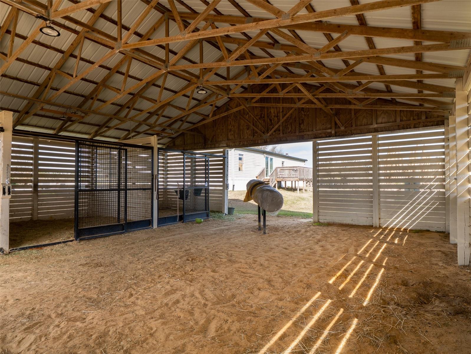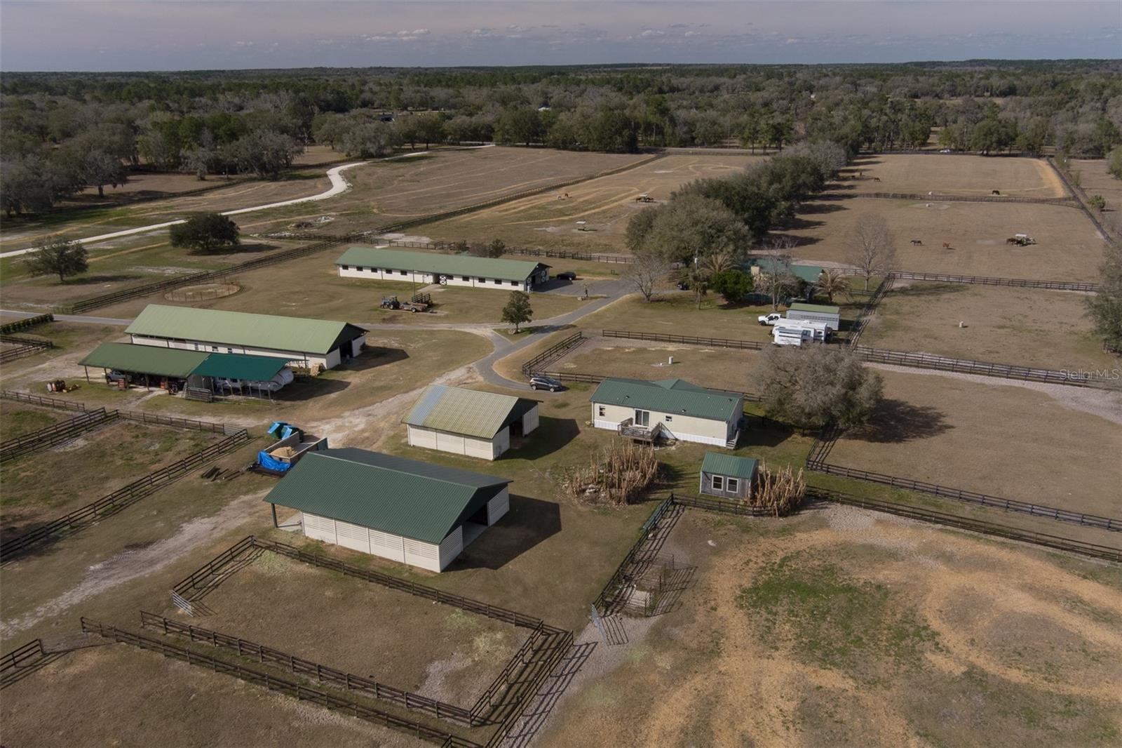 Spanning 64.76 acres, this property is ideally located just 10 minutes from the World Equestrian Center and 5 minutes from HITS, offering a prime setting for equestrian enthusiasts. Currently operating as a full-service equine reproduction and foaling center, the property is fully fenced and thoughtfully laid out with multiple paddocks, providing abundant space for your horses. The main residence features 4 bedrooms and 4 full bathrooms with an open floor plan. High ceilings and expansive windows fill the home with natural light, while the breakfast nook and separate formal dining room offer flexibility for casual meals or hosting guests. French doors open to a spacious screened-in patio complete with a heated pool and spa, perfect for relaxing after a day at the barn. In addition to the main home, the property includes a 3-bedroom, 2-bathroom guest house featuring a cobblestone fireplace, porcelain tile flooring, a screened-in porch, and its own screened-in pool, ideal for extended family, guests, or staff. Equestrian amenities include multiple barns totaling 40 stalls, wash racks, a barn office and bathroom, a round pen, designated feeding stations, and ample storage. The property also features a mobile home for additional guests or employees, as well as two RV hookups. Combining the tranquility of expansive country living with close proximity to premier equestrian venues, this property offers an outstanding blend of space, functionality, and location, ready for you to continue its operation or make it your own equestrian retreat.