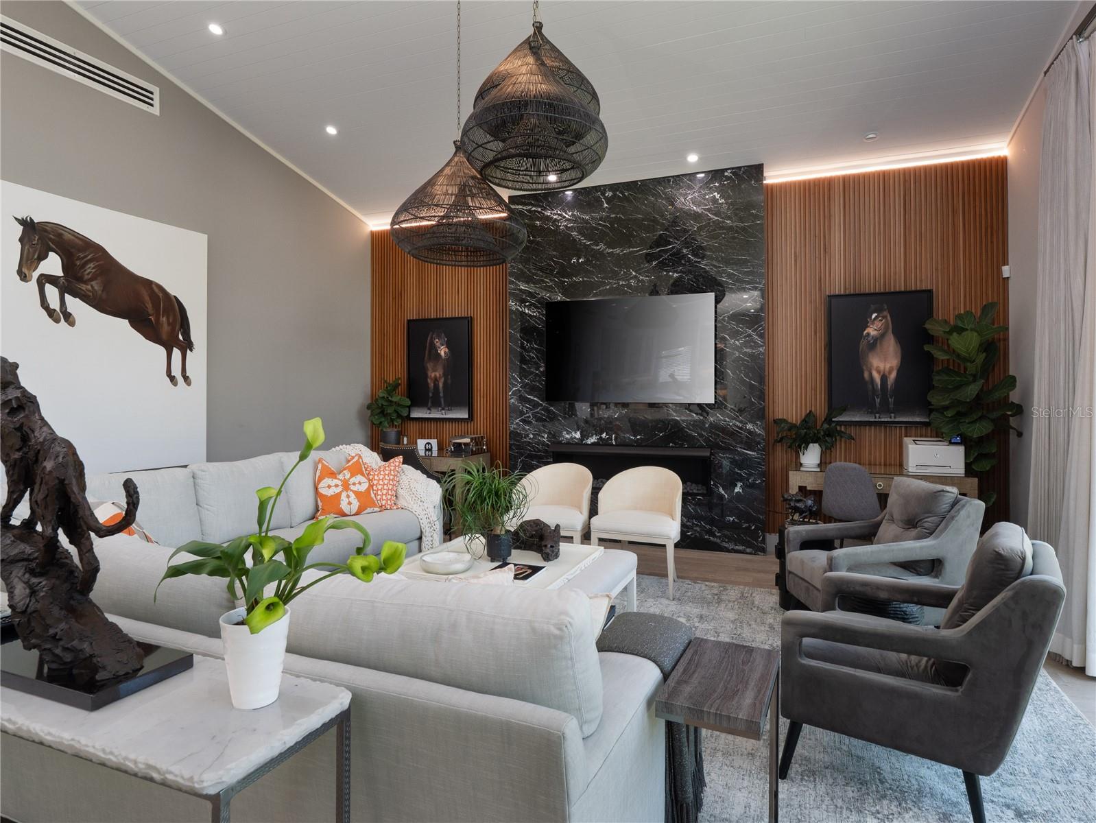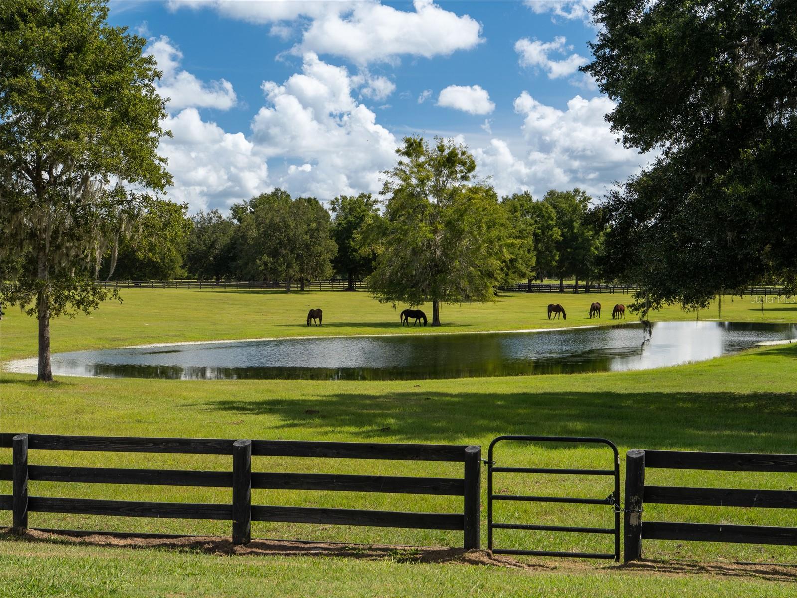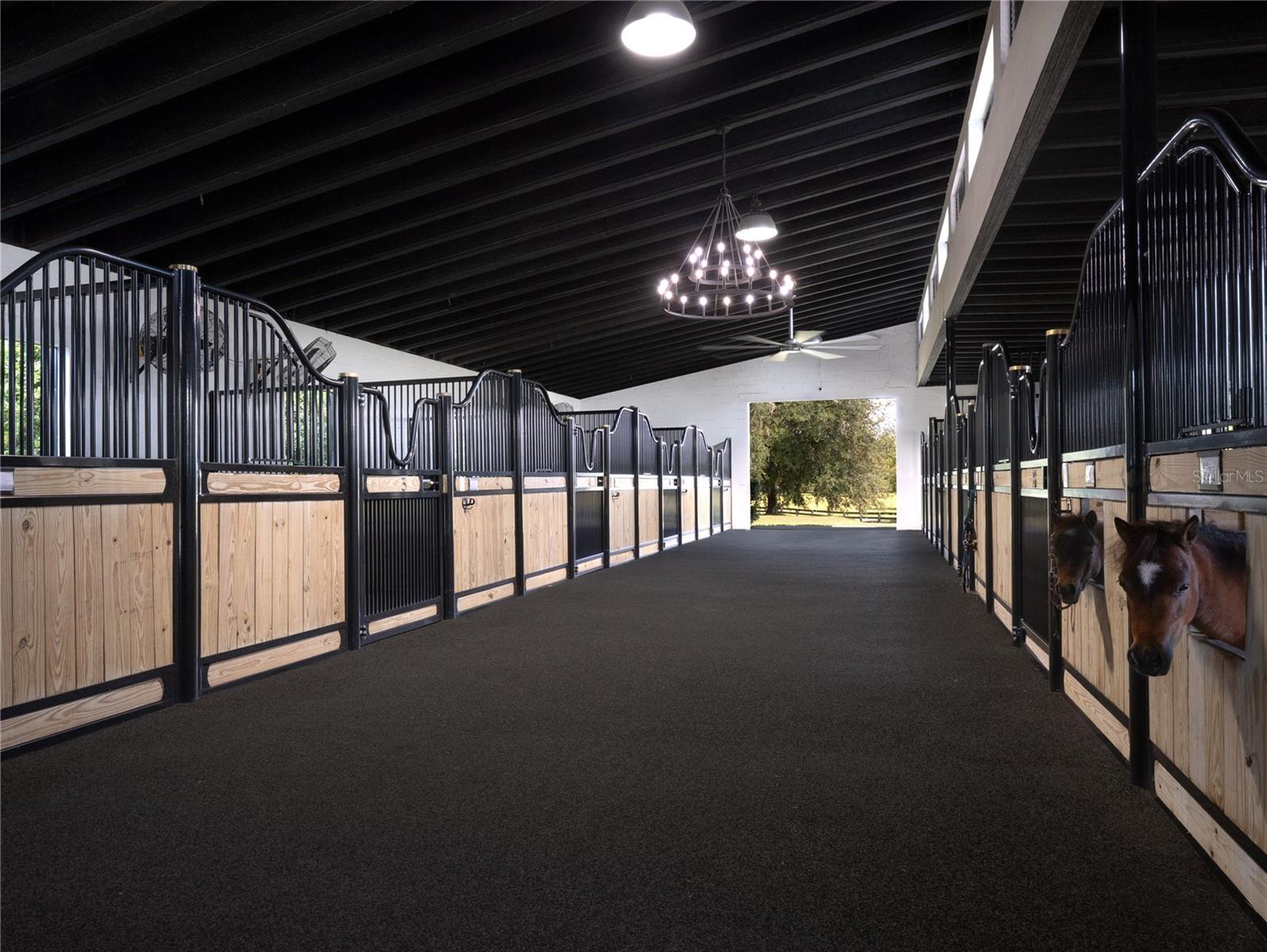 Tucked away on approximately 131 acres and just 10 minutes from HITS and 15 minutes from the World Equestrian Center, this private horse farm offers a refined equestrian setting with thoughtful design and timeless character. Fully fenced and framed by mature oak canopies, the property is enhanced by manicured landscaping, elegant palm trees, rolling green pastures, and a small pond, all introduced by a striking gated entrance that sets the tone upon arrival. The residence sits at the heart of the farm, flanked by barns on either side, creating a balanced and functional layout. A European-style barn includes 12 stalls, a tack room, and a wash bay, while the second barn serves as an equipment barn and features a feed room, dedicated office space, kitchenette, full bathroom, and laundry area, providing excellent support for daily farm operations. Surrounding paddocks are thoughtfully arranged and fully fenced, equipped with run-in sheds, offering comfort and convenience for horses throughout the property. Inside the home, the living room flows seamlessly into a wine and bar area, enhancing the home’s natural flow and social spaces. The open kitchen offers updated appliances and abundant cabinetry, while the two-bedroom, two-bathroom layout includes walk-in closets and sliding glass doors in each room, allowing natural light to pour in and creating a seamless connection between the indoors and the surrounding landscape. A distinctive open back porch with a seating area provides the perfect vantage point to unwind and take in the peaceful farm views, making this property a rare opportunity to own a serene equestrian retreat.