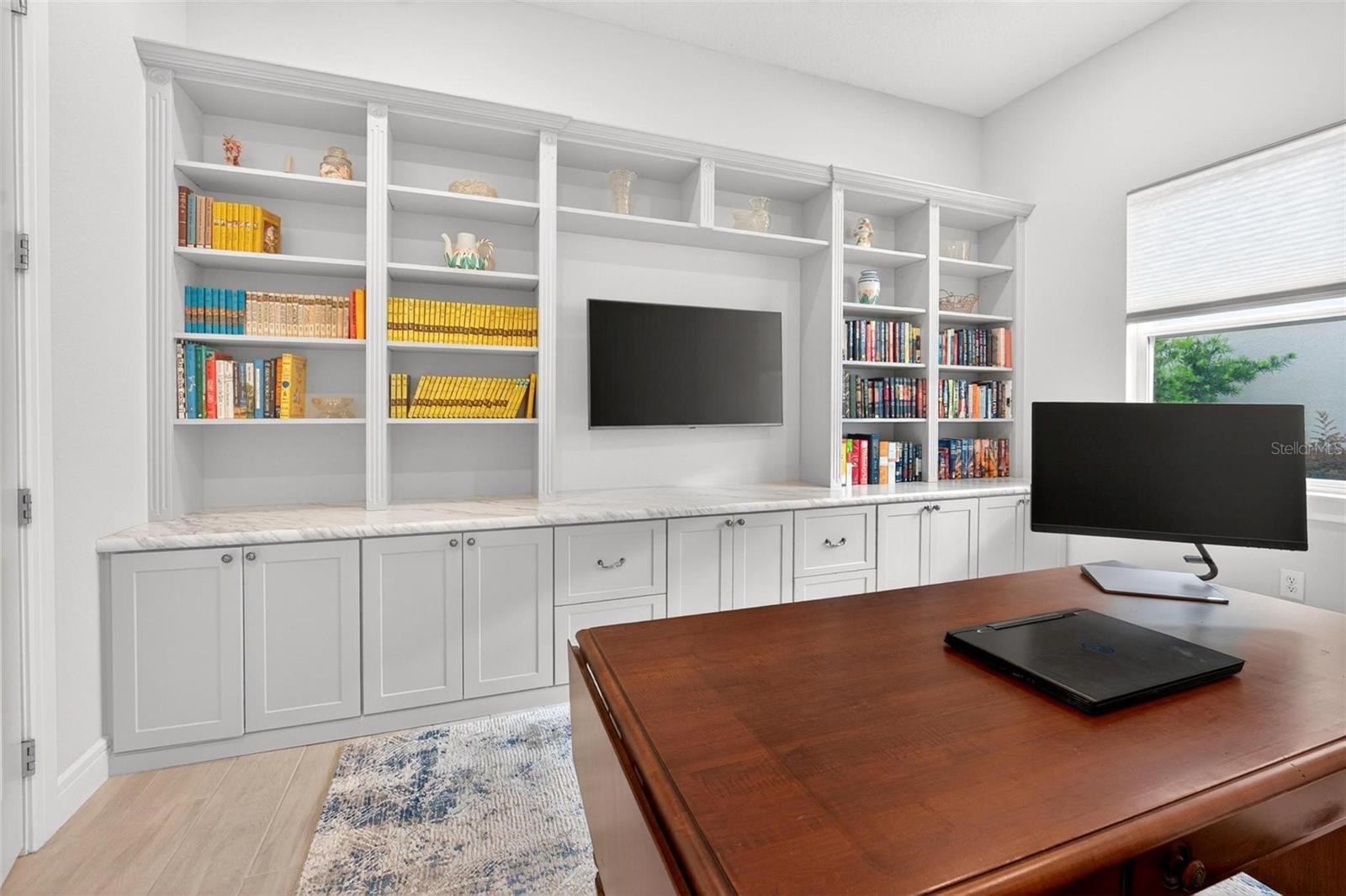 Welcome to this exceptional Renown model located in the highly sought-after 55+ community of Del Webb Stone Creek! This beautifully designed home offers a perfect blend of comfort, style, and modern living, featuring an open-concept layout ideal for both everyday living and entertaining, along with a desirable golf course view. The spacious kitchen boasts upgraded finishes, including double granite backsplash, rollout shelves, and a double oven, along with ample cabinetry and a large island overlooking the inviting gathering room. The owner’s suite provides a peaceful retreat with a luxurious en-suite bath and generous walk-in closet, while additional bedrooms offer flexibility for guests, and the home also features wheelchair accessibility and a private office with built-ins for added functionality and charm. Elegant details such as porcelain tile flooring throughout, tray ceilings, and crown molding enhance the home’s upscale appeal. Enjoy Florida living at its finest with a covered lanai prewired for a spa, hot tub, and outdoor kitchen—perfect for relaxing or entertaining while taking in the golf course views. Residents of Del Webb Stone Creek enjoy resort-style amenities including golf, clubhouse, fitness center, and a full calendar of social activities, all conveniently located near shopping, dining, and major highways. Call to schedule your private tour today!