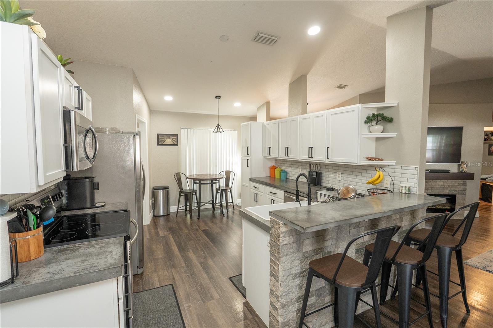 Welcome to care free living! This home has been lovingly updated and is located conveniently to shopping, dining, daily conveniences and outdoor recreation, all combined with quiet, cul de sac living. The community of Silver Springs Shores offers quiet, family friendly living with the benefit of the SE Maricamp Rd shopping corridor which is home to all your daily needs, right at your fingertips. In addition to convenient shopping and dining, you will find golf, walking, biking, hiking, a variety of parks and recreation venues within a short car ride. In recent years, the home has seen enhancements top to bottom to include roofing, HVAC 2018, Water Heater, Water Conditioner, Whole House Repiping, and Kitchen Appliances in 2019, and an expanded Pergola covered back porch in 2021. In addition, the exterior of the home has been refreshed with paint and enhanced landscaping. As you enter the home, enjoy the open, split plan with volume ceilings, spacious living and dining areas enriched with a fireplace and luxury vinyl plank flooring throughout. As every gathering ends up in the kitchen, this space features beautiful concrete counters, a hearty garden sink, modern cabinets, beautiful stainless steel appliances and in addition to welcoming counter top stools, you will find a quaint eat in space as well. Your laundry room couldn't be cozier and more convenient located right off the kitchen with an entry door from the garage as well. This 3 bedroom, 2 bath beauty features the same quality cabinets and countertops throughout the home with a handsome tile shower in the guest bath, however the master bedroom and bath is one of a kind. The cozy sleeping area is partnered with spacious double sinks, and a his and hers shower space that is do die for! All this is topped of with a walk in closet and a private commode area. As you can see in the photos the home has a roomy 2 car garage, and plenty of opportunities for outdoor living. It's one of those homes you just have to see. One of the best values on the market today. There was sinkhole remediation completed in 2010.