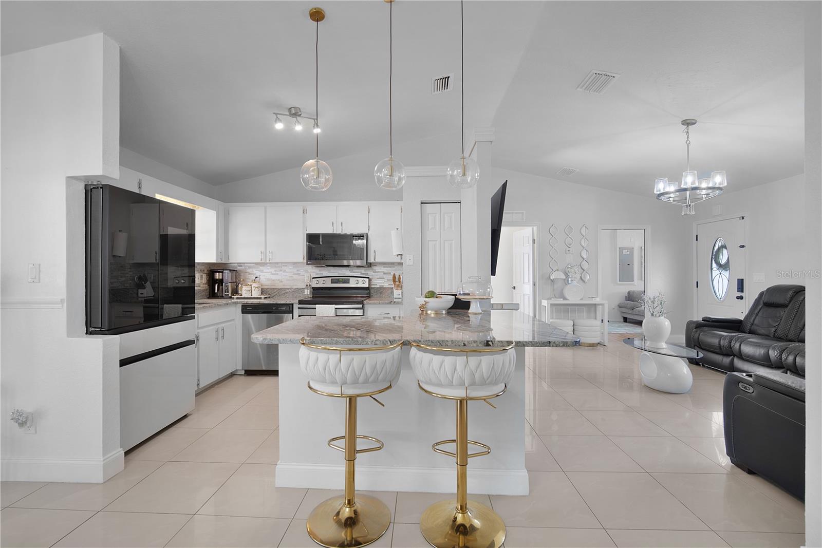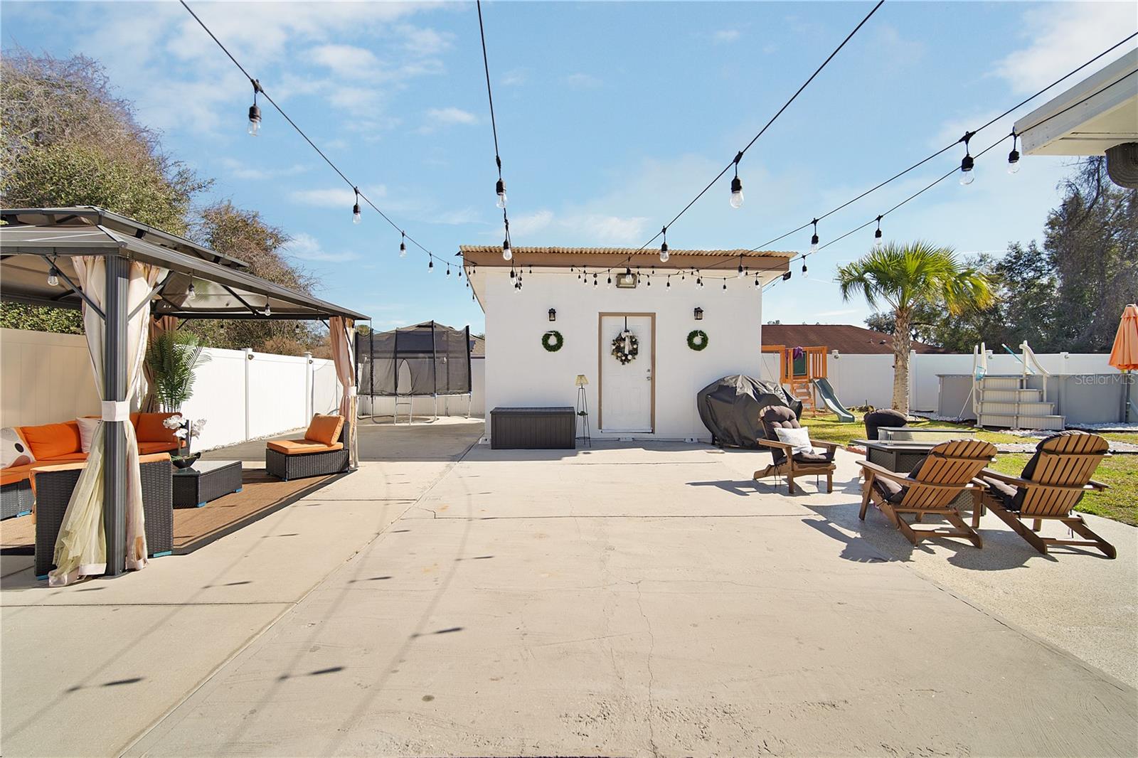 Tucked away in the heart of Marion Oaks, this beautifully renovated retreat offers the perfect blend of modern comfort and wide-open, adventurous living. From the moment you arrive, thoughtful details welcome you home—porcelain tile floors underfoot, custom tile accents at the front entry, and a spacious enclosed patio designed for year-round enjoyment. Two versatile bonus rooms invite endless possibilities, whether you’re carving out a home office, creative studio, or cozy den after a long day outdoors. The updated kitchen is made for gathering, featuring granite countertops, stainless steel appliances, a breakfast bar for easy mornings, a glass-tiled backsplash, and a pantry ready to support your next big cookout or weekend feast. Both bathrooms have been stylishly upgraded with modern vanities and tiled tub and shower surrounds. Step into the expansive enclosed patio, where glass windows let in the warm Florida sunshine or shield you from cooler winter evenings—complete with a built-in wet bar for entertaining friends after a day of adventure. Outside, the fully fenced yard offers room to roam, with an oversized concrete driveway that easily fits an RV or boat, ready for your next getaway. Cool off in the pool, soak up the Florida lifestyle, and create lasting memories with space to spread out and breathe. A storage unit/workshop with electricity and shelving adds the perfect finishing touch for hobbies, projects, or gear—because great living is all about having room to live life your way.
