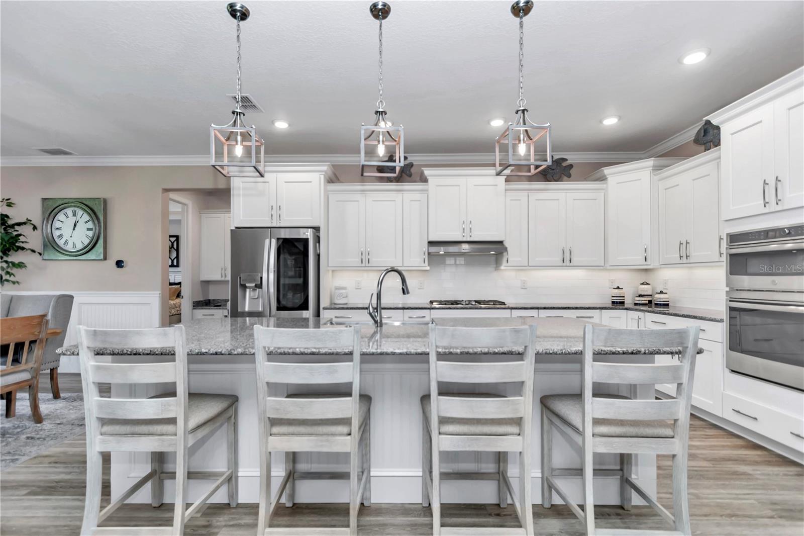 Welcome to your dream home in the highly sought-after Stirling Meadows neighborhood of Candler Hills in the Top of the World community! Located in the charming town of Ocala, this meticulously designed residence combines timeless elegance with modern convenience, offering a truly luxurious lifestyle in the tranquil setting you're looking for. As you step through the tall glass front door, you'll be greeted by an open and airy floor plan, filled with natural light and stunning finishes, and luxury vinyl plank flooring throughout. The chef's kitchen is a showstopper, featuring granite countertops, upgraded shaker cabinetry with convenient pull out shelves, top-of-the-line appliances, and a spacious island that seamlessly flows into the living area which features a grand stone entertainment center and built in storage with bench seating for cozy evenings; perfect for entertaining family and friends. Step into the converted lanai, which is now a spacious Florida room with wall to wall windows making viewing the premium homesite and retaining pond enjoyable with the unwavering comfort of AC and mosquito-free living. Retreat to the serene master suite, where a spa-inspired en suite bathroom awaits, complete with granite countertops, dual vanities, an enormous walk in shower and a beyond dreamy walk-in closet. The attention to detail continues into the additional bedrooms, each offering generous space and comfort. Custom millwork, built-ins, plantation shutters and 8' interior doors elevate the space. Truly no detail was left unturned. This home embodies the perfect balance of sophistication and comfort. Whether you're hosting gatherings or enjoying peaceful mornings, 8855 SW 85th Loop is more than a home—it's a lifestyle.