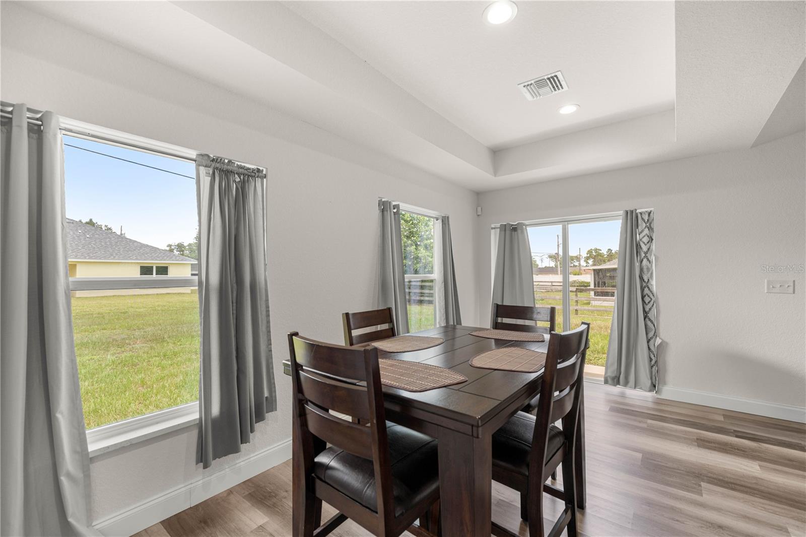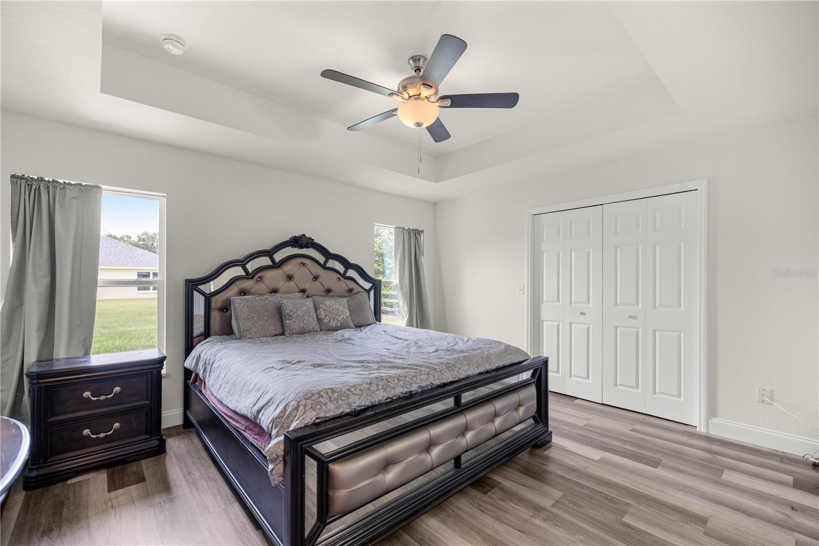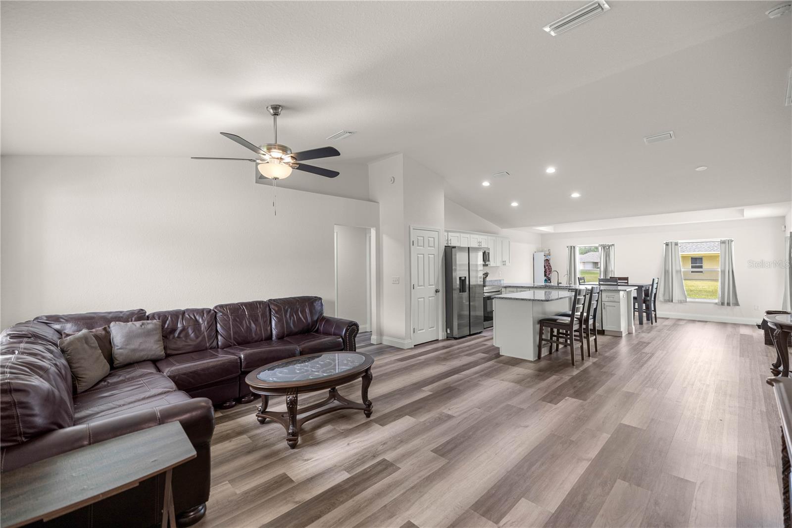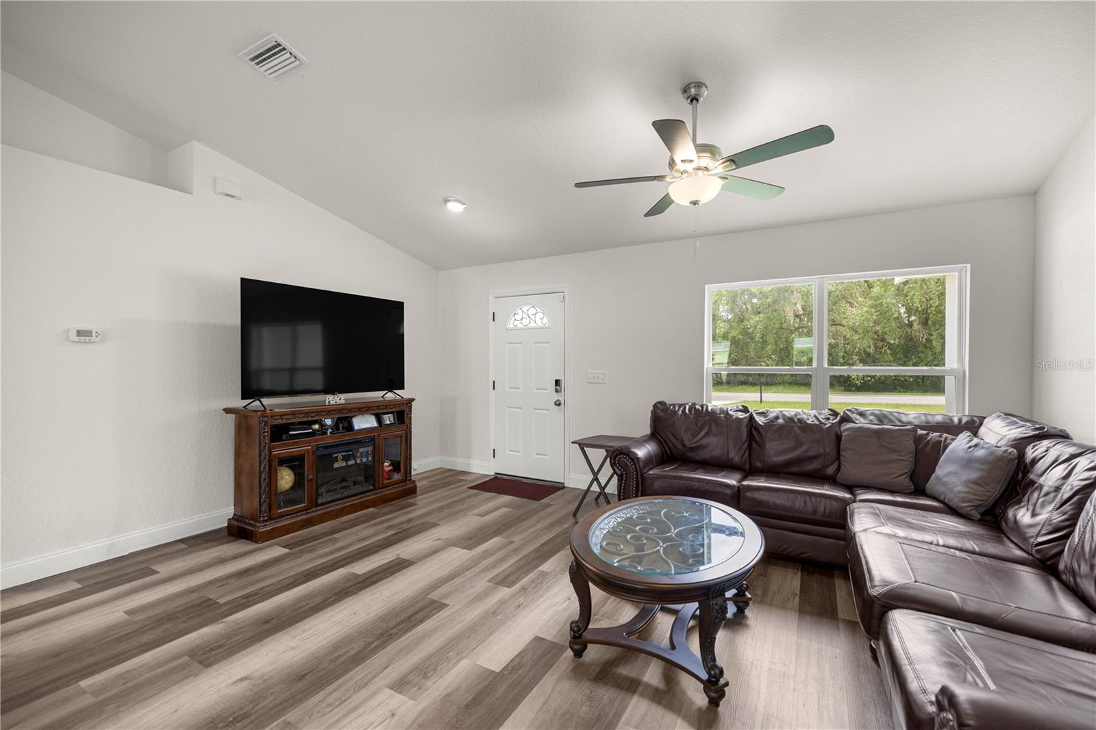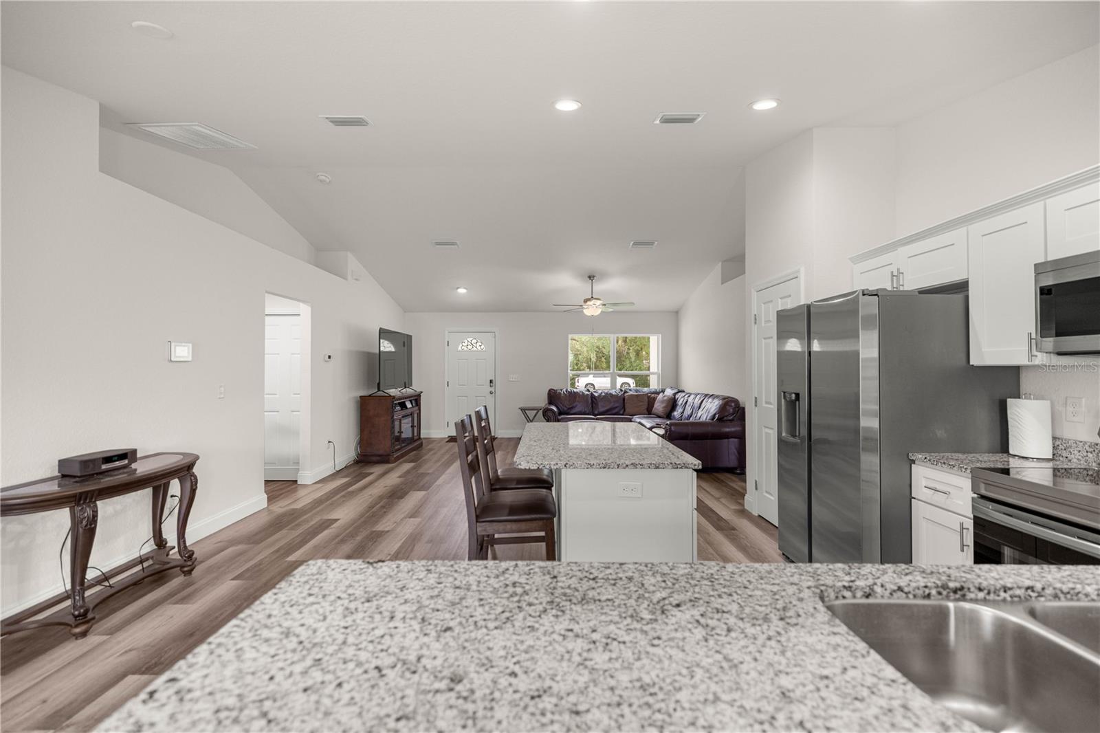 Step inside this beautifully upgraded 3-bedroom, 2-bathroom home featuring a spacious 2-car garage and an inviting open floor plan. The kitchen is a standout with elegant shaker-style cabinets, granite countertops, a center island perfect for meal prep or entertaining, and sleek stainless steel appliances. Waterproof laminate flooring runs throughout the home, combining style and durability. Enjoy the privacy of a split floor plan, with a generously sized primary suite offering a walk-in closet and a well-appointed en-suite bath. Ceiling fans are installed in all bedrooms and the living area for added comfort. Conveniently located near shopping, dining, and entertainment—this home offers both comfort and convenience. With plenty of upgrades throughout, this one is a must-see!