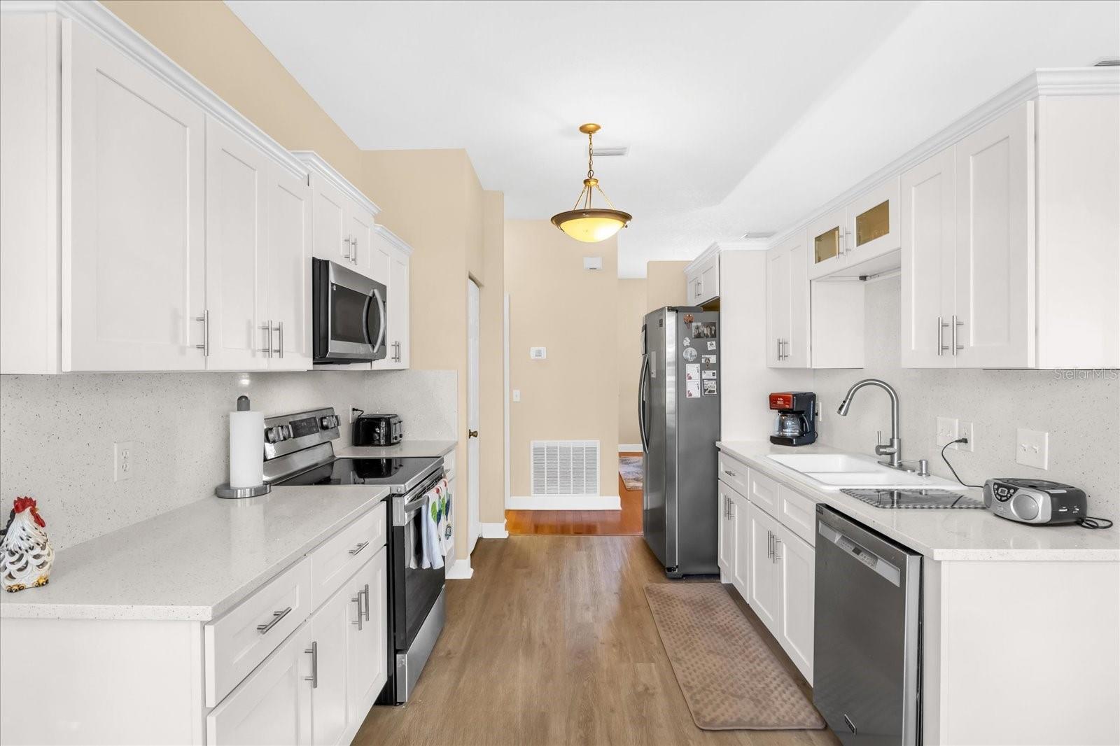 UPDATED FURNITURE INCLUDED. BRING YOUR TOOTHBRUSH!! Pristine 3 bedroom, 2 full bath home that has been updated in the last 1-2 years. All new kitchen featuring crystal white quartz counter tops, new stainless steel appliances, new cabinets with soft close feature, and new flooring of upgraded, waterproof vinyl plank. New stainless steel refridgerator stays as well.