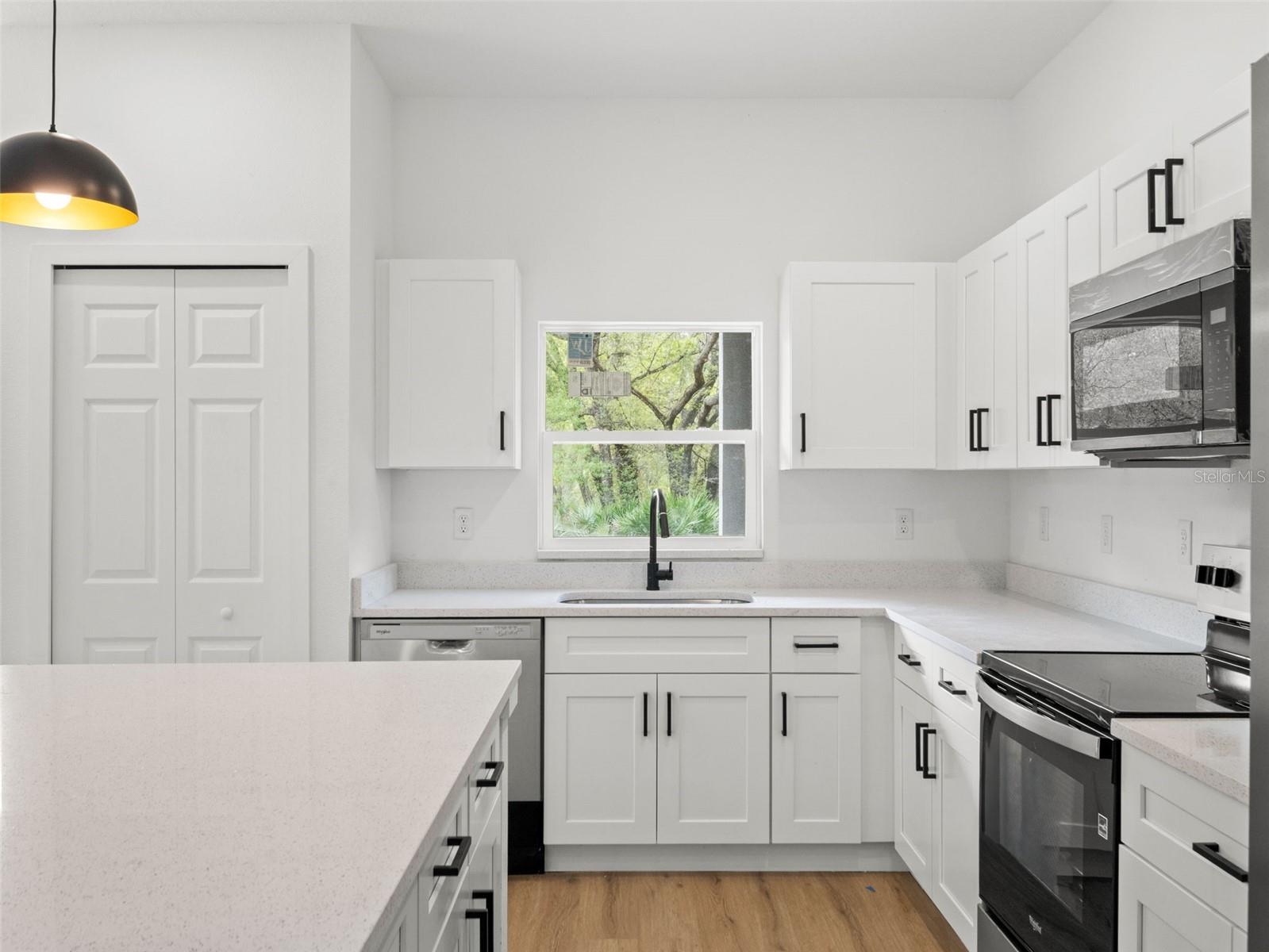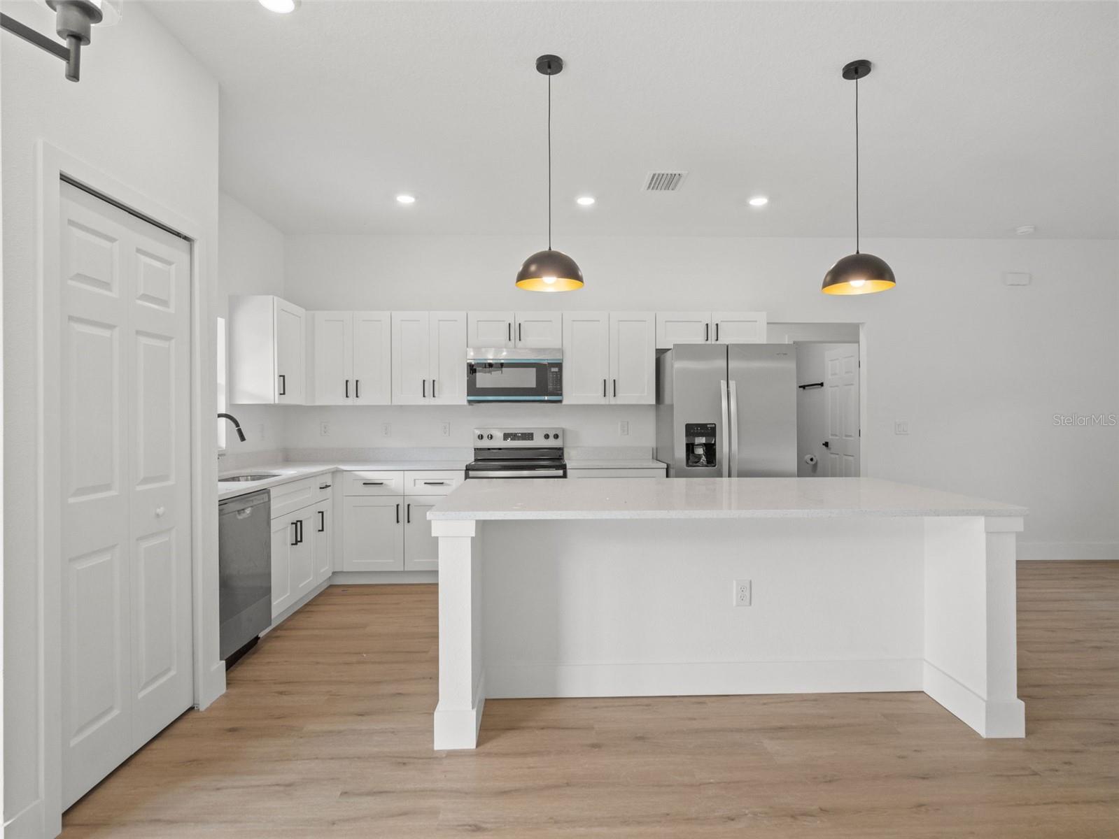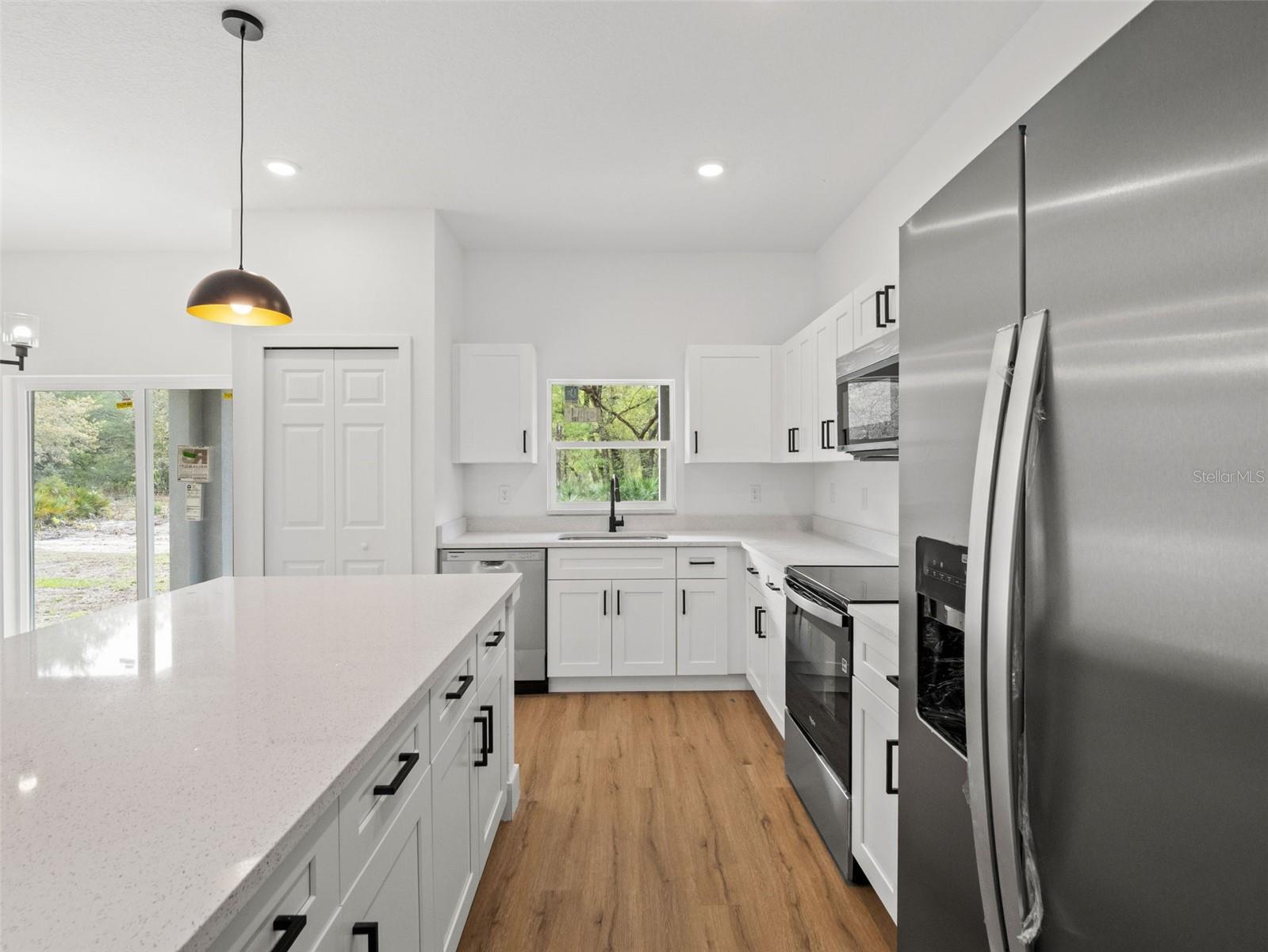 One or more photo(s) has been virtually staged. Welcome to this beautiful 3-bedroom, 2-bathroom home in Ocklawaha! Featuring a modern open floor plan and high ceilings, this home is designed for comfort and functionality. The kitchen boasts elegant quartz countertops and comes fully equipped with appliances, including a dishwasher, refrigerator, microwave, and range. The home also features stylish pendant lights over the kitchen island and in the dining area, adding a modern touch to the space. Enjoy the durability and style of vinyl flooring throughout, along with ceiling fans installed in key areas for added comfort. The bathrooms showcase fine finishes, adding a touch of sophistication to the home. Step outside to a beautiful covered patio, perfect for relaxing and enjoying your backyard—whether entertaining guests or unwinding after a long day. This property offers the perfect balance of modern finishes and everyday comfort. Don’t miss this opportunity to own a move-in ready home in a peaceful location!