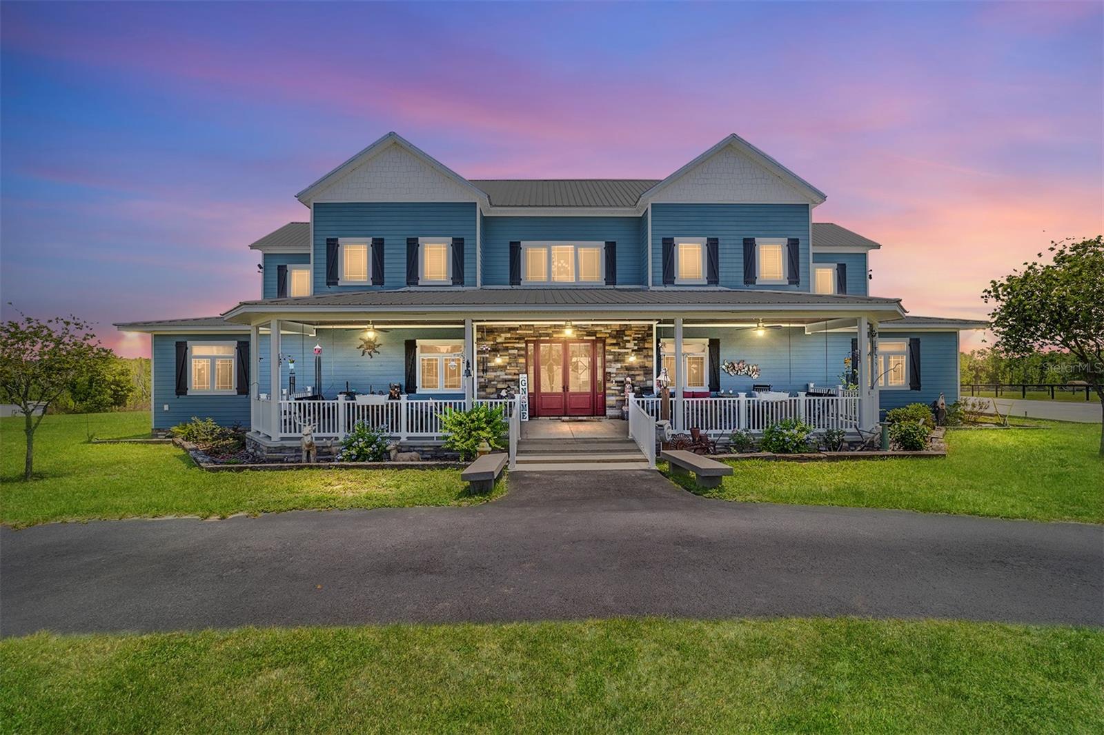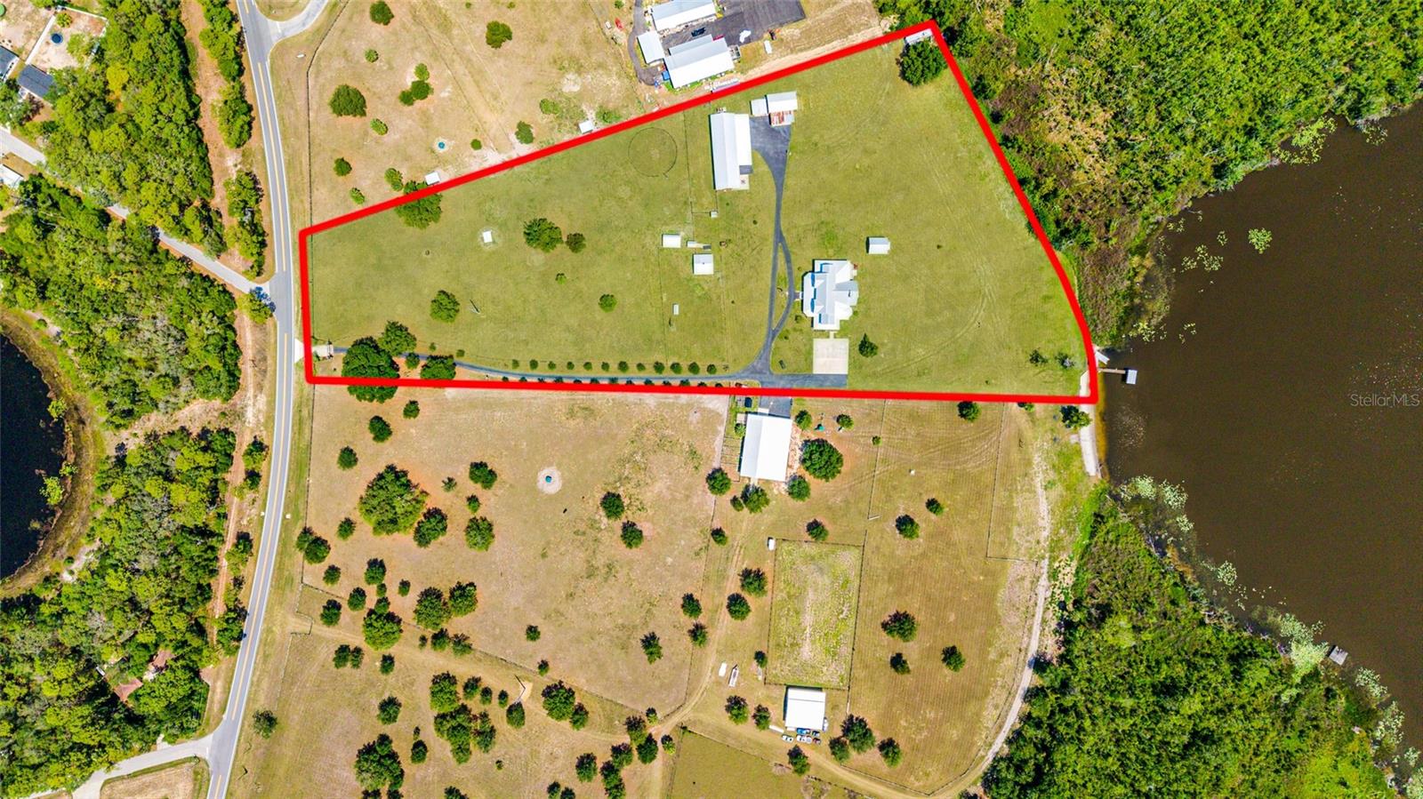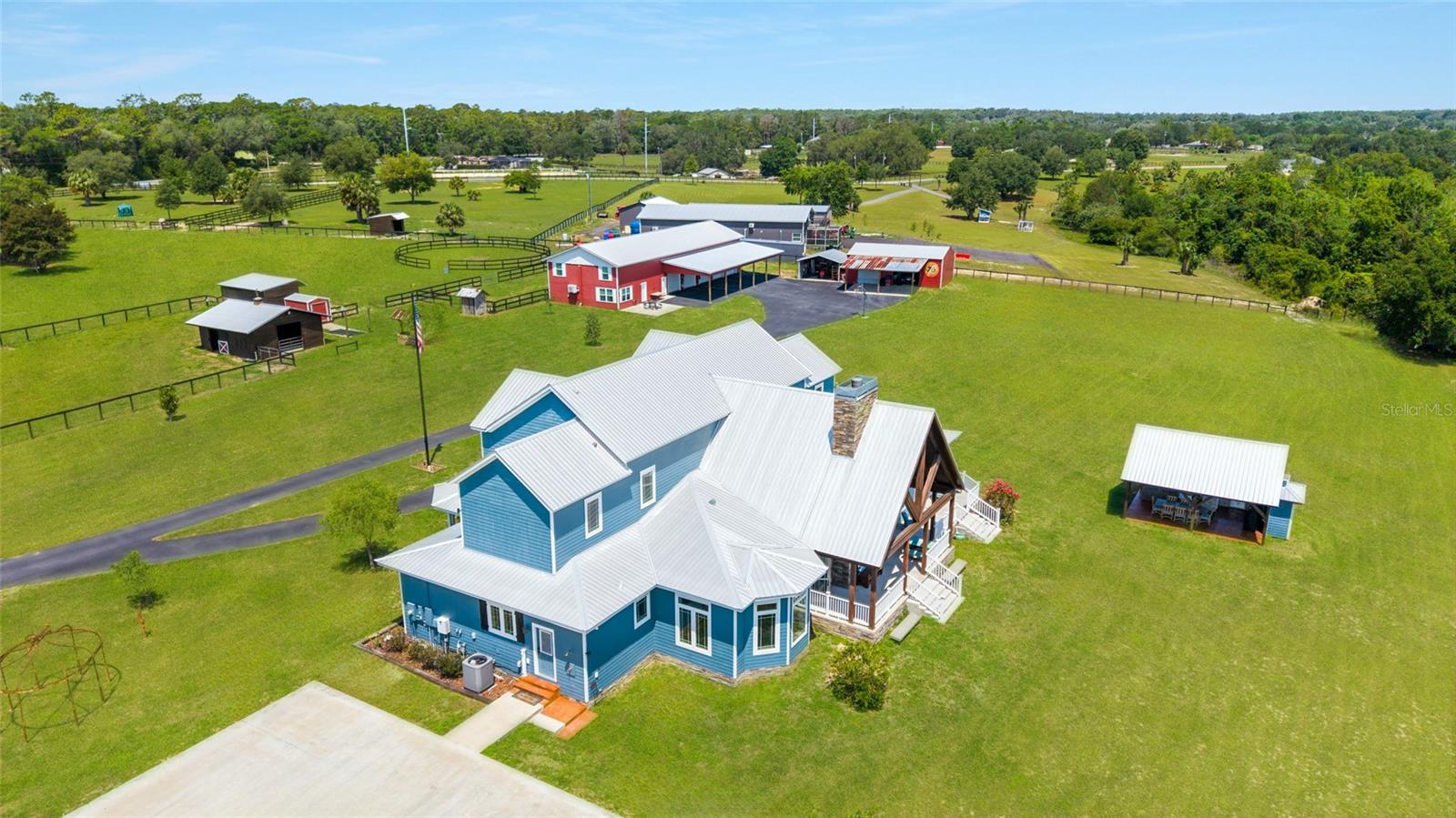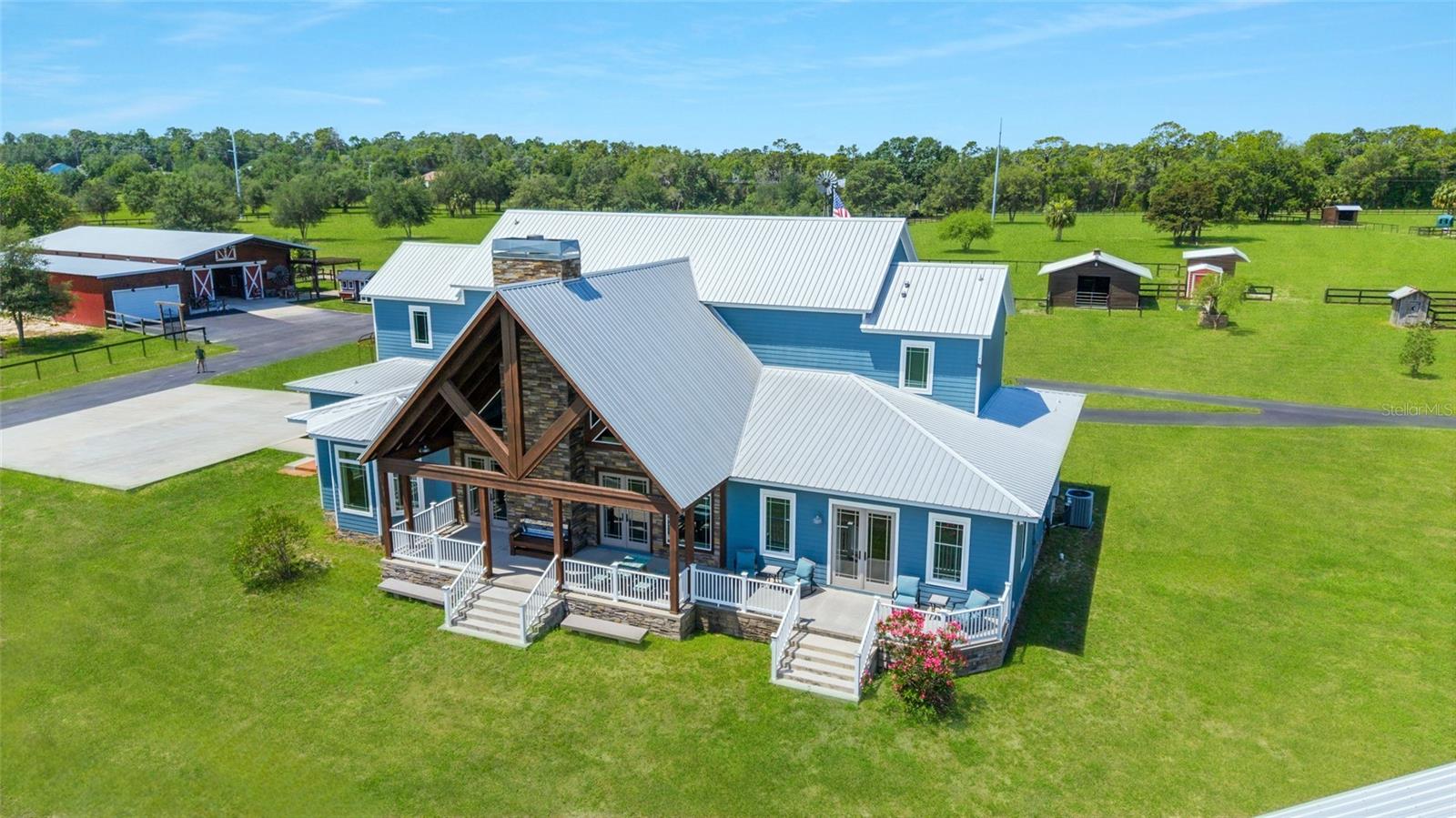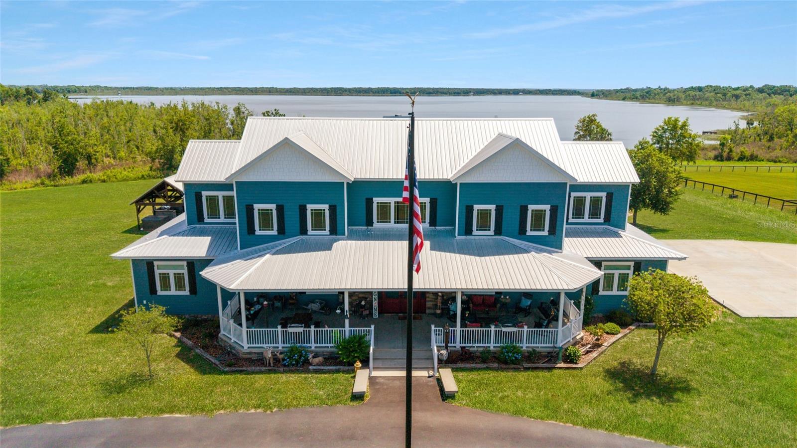 Welcome to a rare opportunity to enjoy the best of both worlds—lakefront living and equestrian comfort—all on one remarkable 8.71-acre property. Tucked beneath a canopy of oaks, this gated estate is located on the shores of Lake Bryant, one of Central Florida’s most sought-after lakes. With over 5,500 square feet of living space in the main home, a detached two-story guest apartment, multiple garages, barns, and an outdoor entertaining cabana, this property offers space, serenity, and versatility unlike anything else in Ocklawaha. From the moment you enter through the electric iron gates and travel the winding asphalt drive, you’ll feel the peaceful seclusion this estate offers. The main home is country-style charm blended with thoughtful upgrades, designed for both family life and entertaining. Downstairs, the expansive master suite features a massive walk-in closet and a spa-inspired bathroom with a clawfoot tub, walk-through tiled shower, and double vanities. An office with French doors and custom built-ins provides the perfect work-from-home space, while the laundry room impresses with its built-in Murphy bed, utility sink, and extra storage. A separate storage room is also attached for added convenience. The heart of the home is the stunning kitchen, where warm cabinetry and abundant counter space are complemented by an island with a ceramic double farmhouse sink, gas cooktop, double ovens, and bar seating—perfect for morning coffee. A huge walk-in pantry completes this highly functional space. The dining area, lined with oversized windows, offers breathtaking views of the backyard and sparkling lake beyond. Up the staircase, a spacious loft overlooks the living room and entryway. One side of the upstairs hosts a bedroom with an oversized bathroom and walk-in closet. The other side features a bedroom with a full bath and an attached game room, offering flexible space for guests. Wood-look tile runs throughout the home, blending rustic elegance with low-maintenance durability. Outdoor living is just as impressive. The backyard includes a covered cabana with a hot tub, granite outdoor kitchen, gas grill, TV, dining area, and wood-burning fireplace—an entertainer’s dream. Just beyond, the private sandy beach and dock offer easy access to Lake Bryant, where you can fish, water ski, and tube. The dock features a charming gazebo and a covered sitting area with a swing that gazes out across the lake. For horse lovers, the property includes a 2-stall wooden barn with a wash rack, a feed/hay storage building, a 2-stall lean-to in the pasture, a round pen, and a large open pasture. The layout is ideal for personal equestrian use with room to expand. There’s also a detached 2-car garage with a carport, another large equipment shed, and a dream 4-car metal garage with a full-length carport—perfect for a car enthusiast. Attached to the metal building is a 2-story guest apartment featuring two bedrooms, two bathrooms, a full kitchen, living room, and a large upstairs window that overlooks the garage. The apartment even has its own front patio, making it perfect for guests, extended family, or rental income. Just 20 minutes to shopping, restaurants, and services, and under 90 minutes to the beaches of Daytona, this unique property offers a lifestyle of adventure, privacy, and possibility. Whether you're soaking in the hot tub under the stars, riding horses through your pasture, or spending the day on the lake, this estate is truly one-of-a-kind.