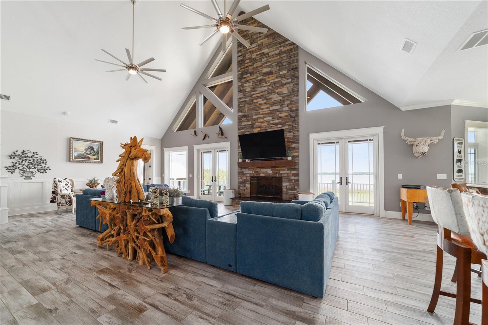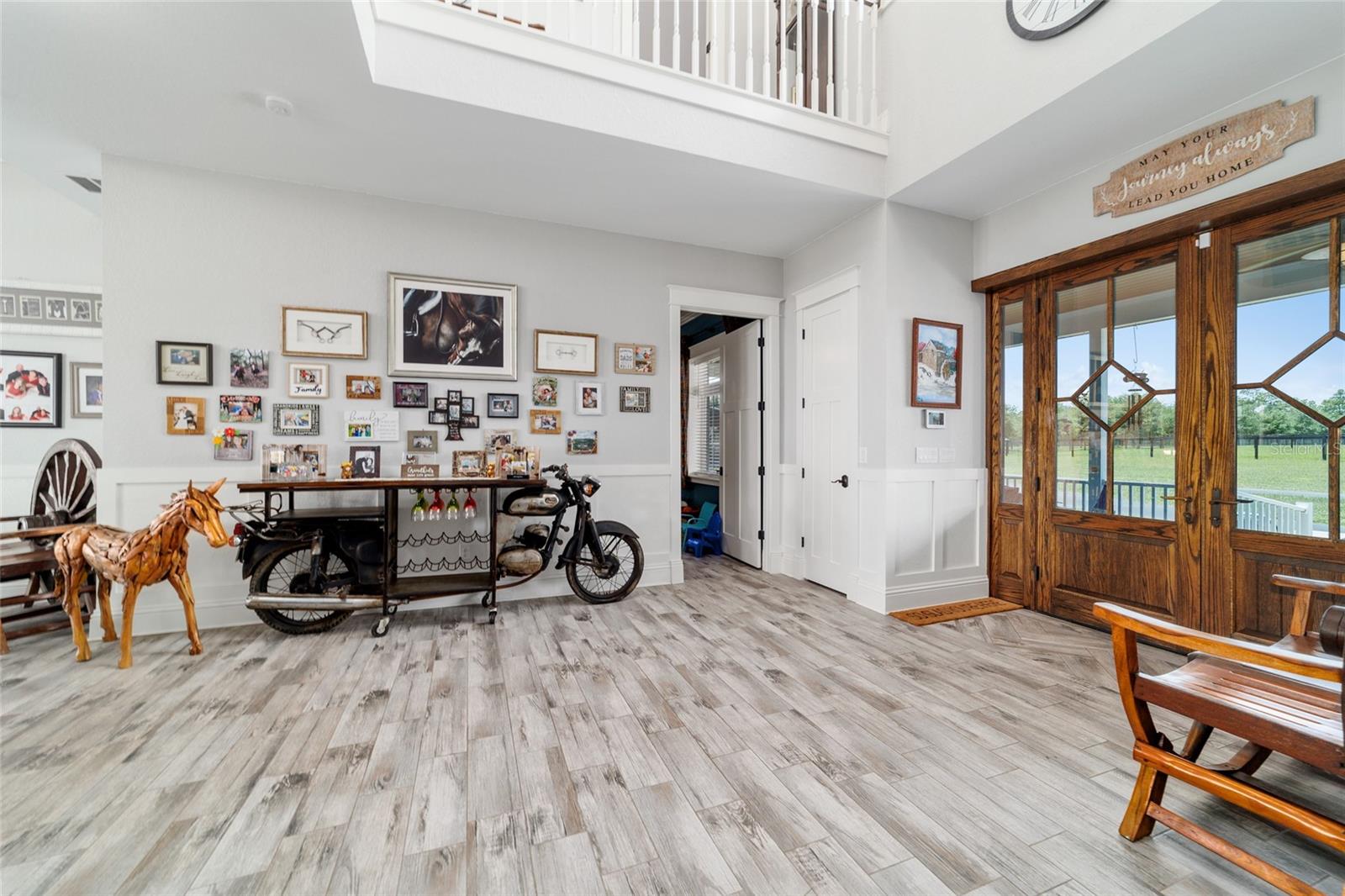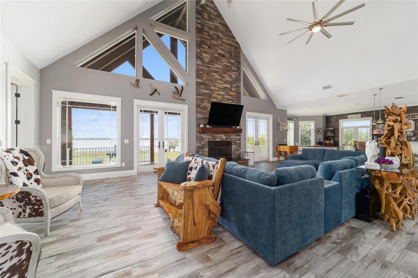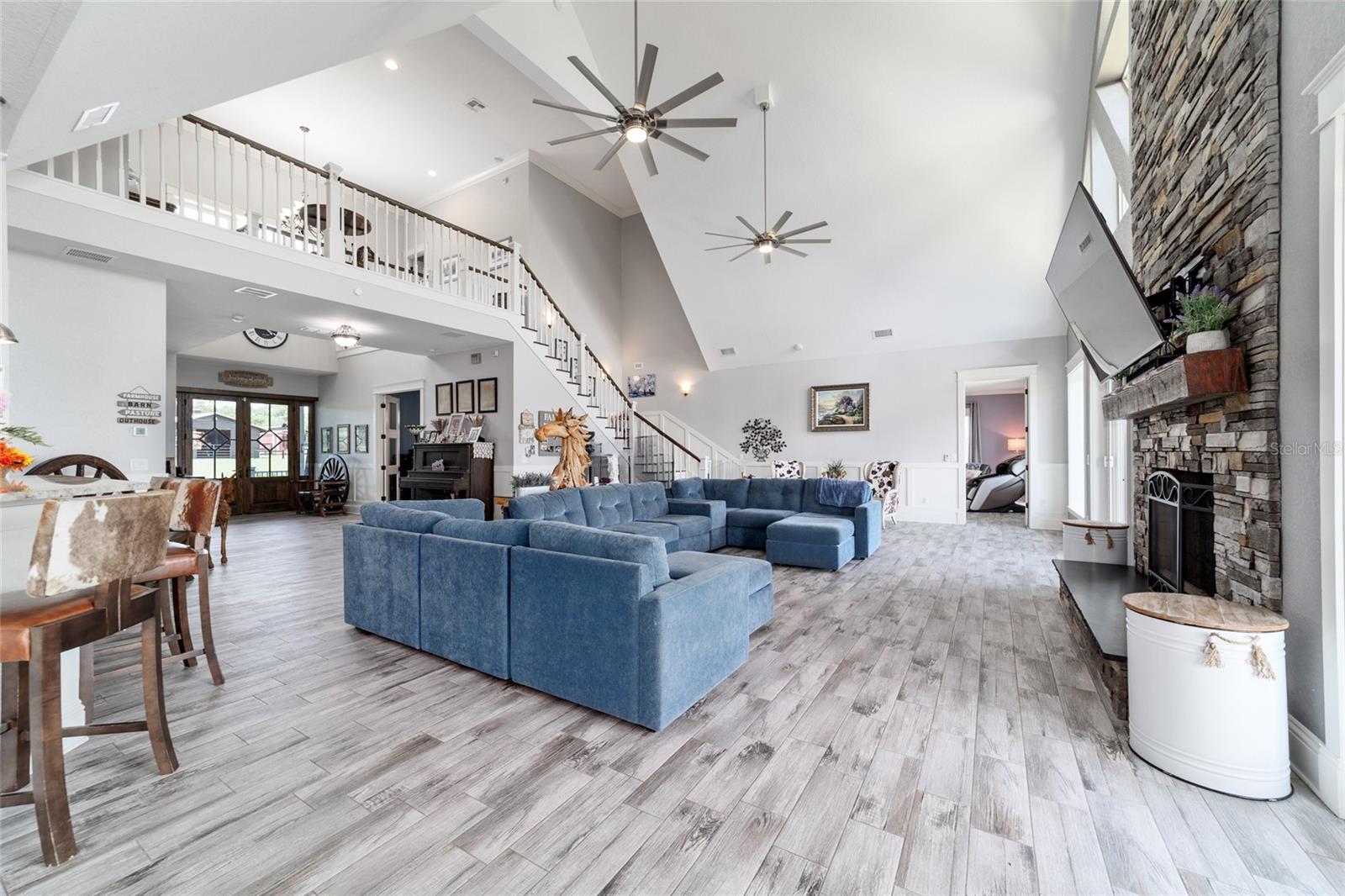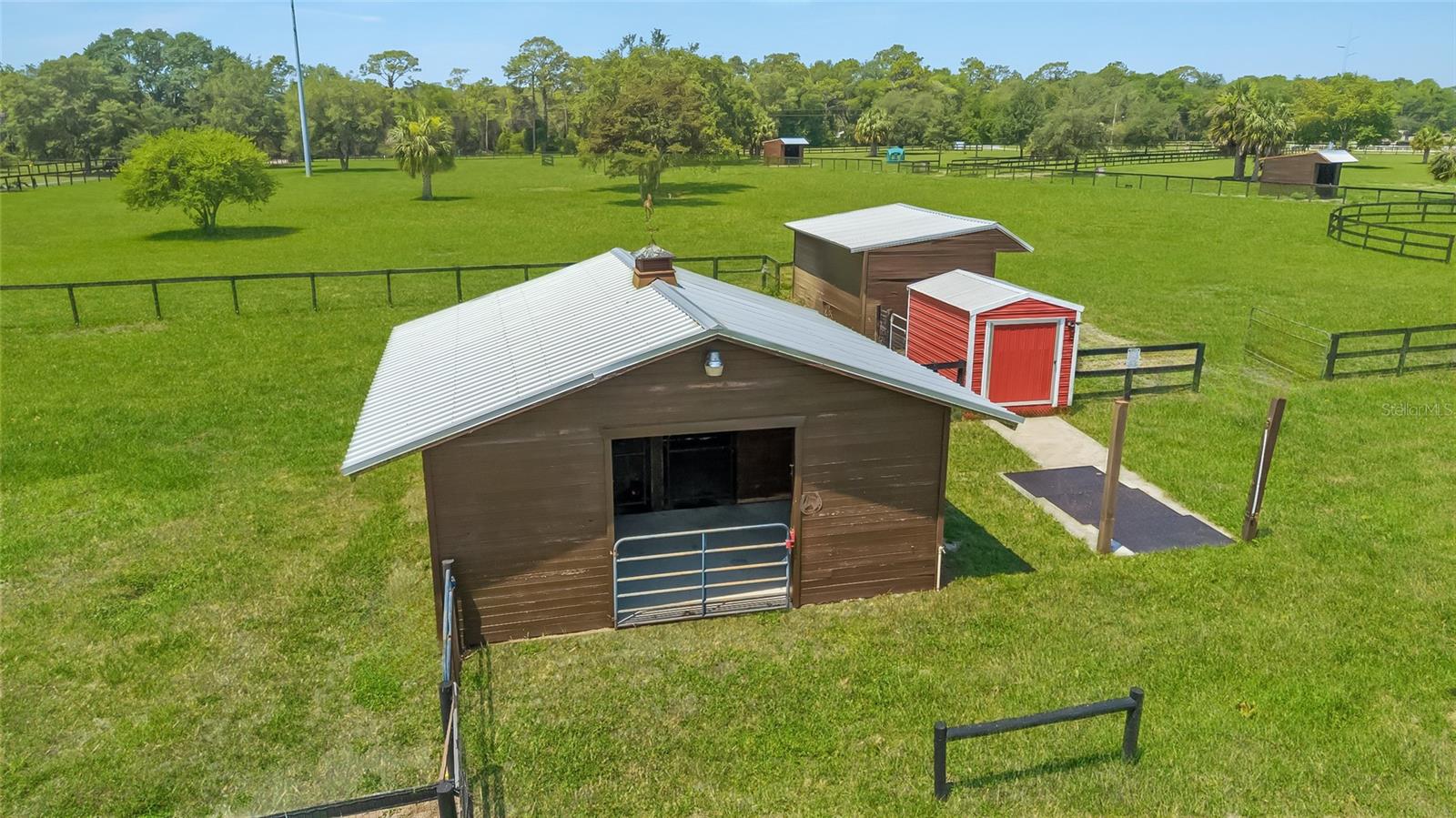 Welcome to a rare opportunity to enjoy the best of both worlds—lakefront living and equestrian comfort—all on one remarkable 8.71-acre property. Tucked beneath a canopy of oaks, this gated estate is located on the shores of Lake Bryant, one of Central Florida’s most sought-after lakes. With over 5,500 square feet of living space in the main home, a detached two-story guest apartment, multiple garages, barns, and an outdoor entertaining cabana, this property offers space, serenity, and versatility unlike anything else in Ocklawaha. From the moment you enter through the electric iron gates and travel the winding asphalt drive, you’ll feel the peaceful seclusion this estate offers. The main home is country-style charm blended with thoughtful upgrades, designed for both family life and entertaining. Downstairs, the expansive master suite features a massive walk-in closet and a spa-inspired bathroom with a clawfoot tub, walk-through tiled shower, and double vanities. An office with French doors and custom built-ins provides the perfect work-from-home space, while the laundry room impresses with its built-in Murphy bed, utility sink, and extra storage. A separate storage room is also attached for added convenience. The heart of the home is the stunning kitchen, where warm cabinetry and abundant counter space are complemented by an island with a ceramic double farmhouse sink, gas cooktop, double ovens, and bar seating—perfect for morning coffee. A huge walk-in pantry completes this highly functional space. The dining area, lined with oversized windows, offers breathtaking views of the backyard and sparkling lake beyond. Up the staircase, a spacious loft overlooks the living room and entryway. One side of the upstairs hosts a bedroom with an oversized bathroom and walk-in closet. The other side features a bedroom with a full bath and an attached game room, offering flexible space for guests. Wood-look tile runs throughout the home, blending rustic elegance with low-maintenance durability. Outdoor living is just as impressive. The backyard includes a covered cabana with a hot tub, granite outdoor kitchen, gas grill, TV, dining area, and wood-burning fireplace—an entertainer’s dream. Just beyond, the private sandy beach and dock offer easy access to Lake Bryant, where you can fish, water ski, and tube. The dock features a charming gazebo and a covered sitting area with a swing that gazes out across the lake. For horse lovers, the property includes a 2-stall wooden barn with a wash rack, a feed/hay storage building, a 2-stall lean-to in the pasture, a round pen, and a large open pasture. The layout is ideal for personal equestrian use with room to expand. There’s also a detached 2-car garage with a carport, another large equipment shed, and a dream 4-car metal garage with a full-length carport—perfect for a car enthusiast. Attached to the metal building is a 2-story guest apartment featuring two bedrooms, two bathrooms, a full kitchen, living room, and a large upstairs window that overlooks the garage. The apartment even has its own front patio, making it perfect for guests, extended family, or rental income. Just 20 minutes to shopping, restaurants, and services, and under 90 minutes to the beaches of Daytona, this unique property offers a lifestyle of adventure, privacy, and possibility. Whether you're soaking in the hot tub under the stars, riding horses through your pasture, or spending the day on the lake, this estate is truly one-of-a-kind.