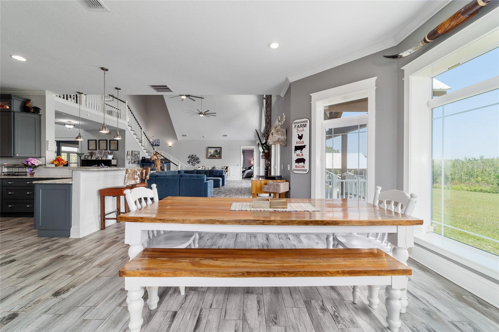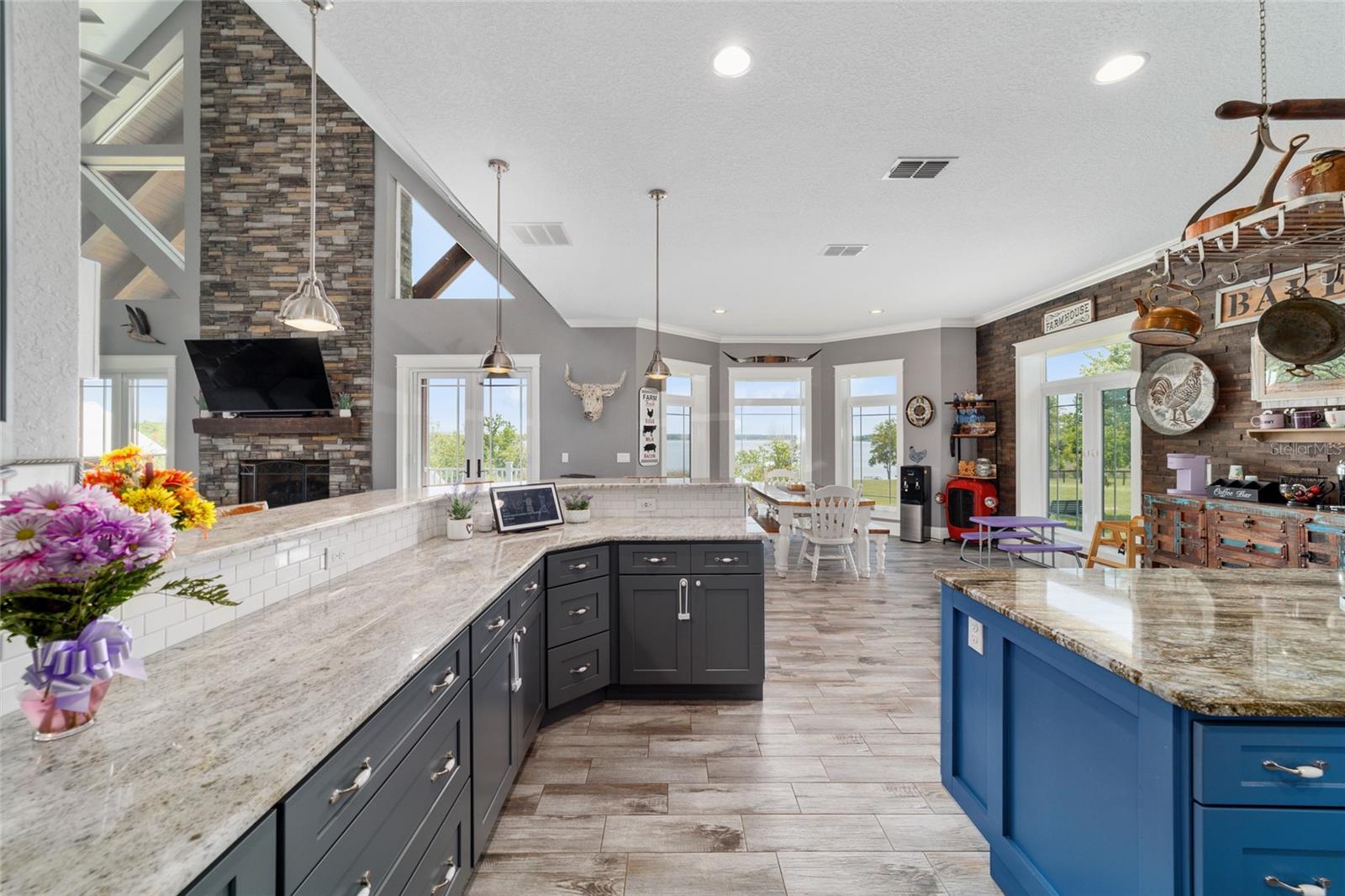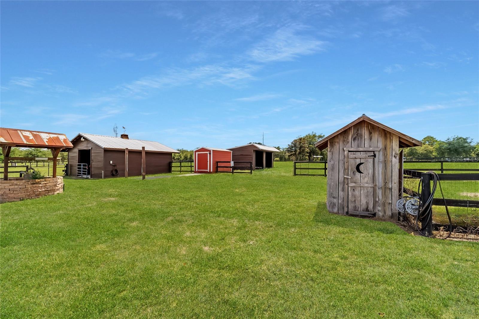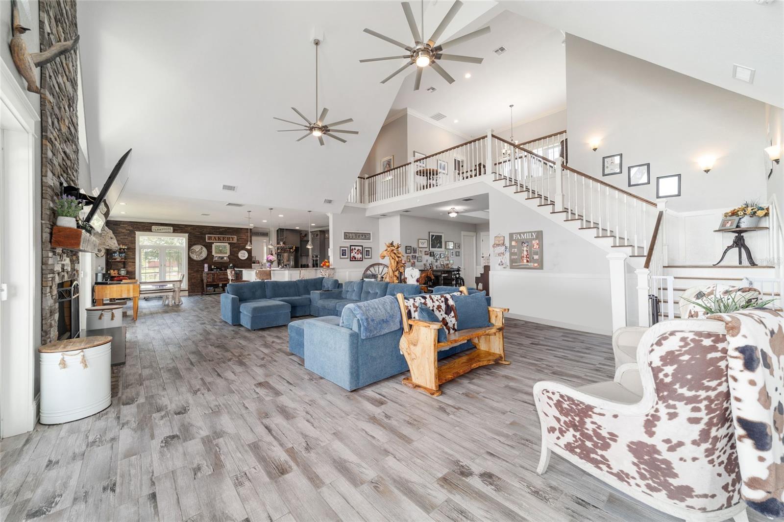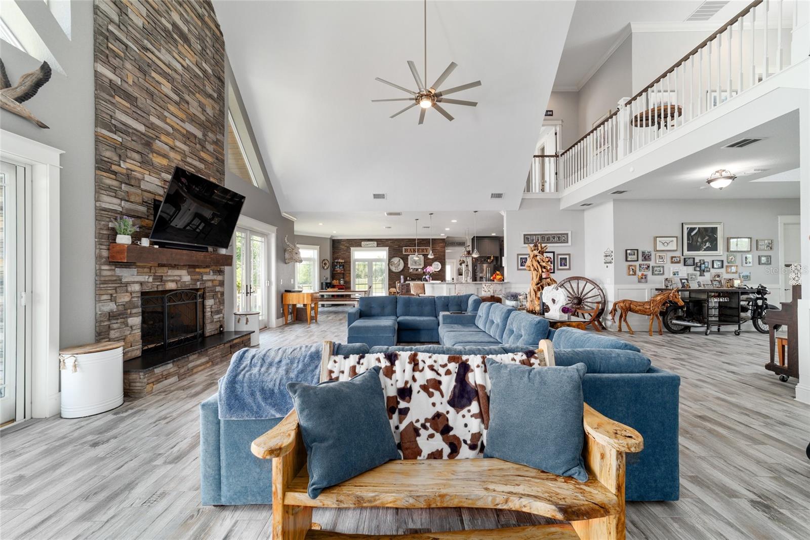 Welcome to a rare opportunity to enjoy the best of both worlds—lakefront living and equestrian comfort—all on one remarkable 8.71-acre property. Tucked beneath a canopy of oaks, this gated estate is located on the shores of Lake Bryant, one of Central Florida’s most sought-after lakes. With over 5,500 square feet of living space in the main home, a detached two-story guest apartment, multiple garages, barns, and an outdoor entertaining cabana, this property offers space, serenity, and versatility unlike anything else in Ocklawaha. From the moment you enter through the electric iron gates and travel the winding asphalt drive, you’ll feel the peaceful seclusion this estate offers. The main home is country-style charm blended with thoughtful upgrades, designed for both family life and entertaining. Downstairs, the expansive master suite features a massive walk-in closet and a spa-inspired bathroom with a clawfoot tub, walk-through tiled shower, and double vanities. An office with French doors and custom built-ins provides the perfect work-from-home space, while the laundry room impresses with its built-in Murphy bed, utility sink, and extra storage. A separate storage room is also attached for added convenience. The heart of the home is the stunning kitchen, where warm cabinetry and abundant counter space are complemented by an island with a ceramic double farmhouse sink, gas cooktop, double ovens, and bar seating—perfect for morning coffee. A huge walk-in pantry completes this highly functional space. The dining area, lined with oversized windows, offers breathtaking views of the backyard and sparkling lake beyond. Up the staircase, a spacious loft overlooks the living room and entryway. One side of the upstairs hosts a bedroom with an oversized bathroom and walk-in closet. The other side features a bedroom with a full bath and an attached game room, offering flexible space for guests. Wood-look tile runs throughout the home, blending rustic elegance with low-maintenance durability. Outdoor living is just as impressive. The backyard includes a covered cabana with a hot tub, granite outdoor kitchen, gas grill, TV, dining area, and wood-burning fireplace—an entertainer’s dream. Just beyond, the private sandy beach and dock offer easy access to Lake Bryant, where you can fish, water ski, and tube. The dock features a charming gazebo and a covered sitting area with a swing that gazes out across the lake. For horse lovers, the property includes a 2-stall wooden barn with a wash rack, a feed/hay storage building, a 2-stall lean-to in the pasture, a round pen, and a large open pasture. The layout is ideal for personal equestrian use with room to expand. There’s also a detached 2-car garage with a carport, another large equipment shed, and a dream 4-car metal garage with a full-length carport—perfect for a car enthusiast. Attached to the metal building is a 2-story guest apartment featuring two bedrooms, two bathrooms, a full kitchen, living room, and a large upstairs window that overlooks the garage. The apartment even has its own front patio, making it perfect for guests, extended family, or rental income. Just 20 minutes to shopping, restaurants, and services, and under 90 minutes to the beaches of Daytona, this unique property offers a lifestyle of adventure, privacy, and possibility. Whether you're soaking in the hot tub under the stars, riding horses through your pasture, or spending the day on the lake, this estate is truly one-of-a-kind.