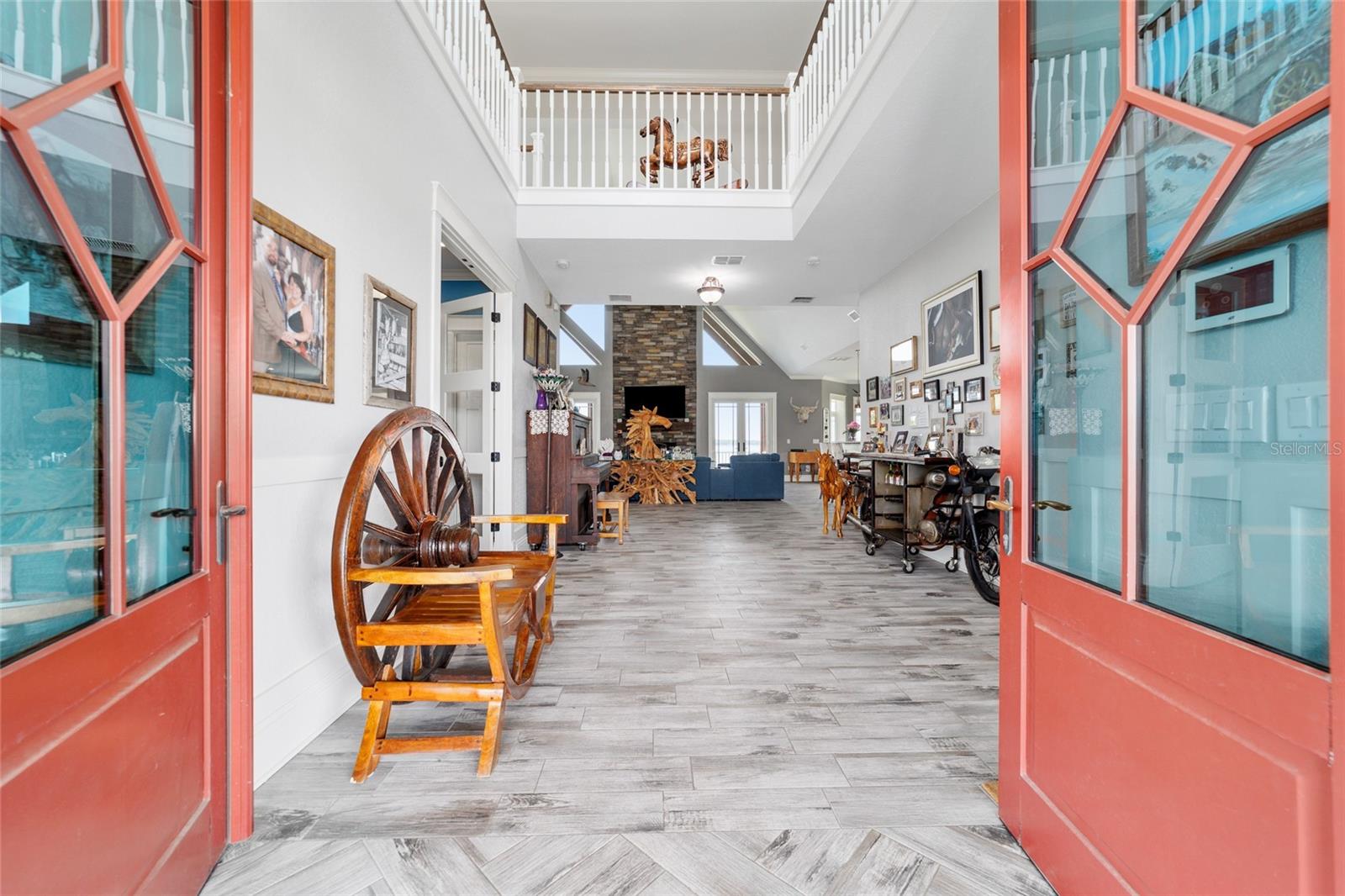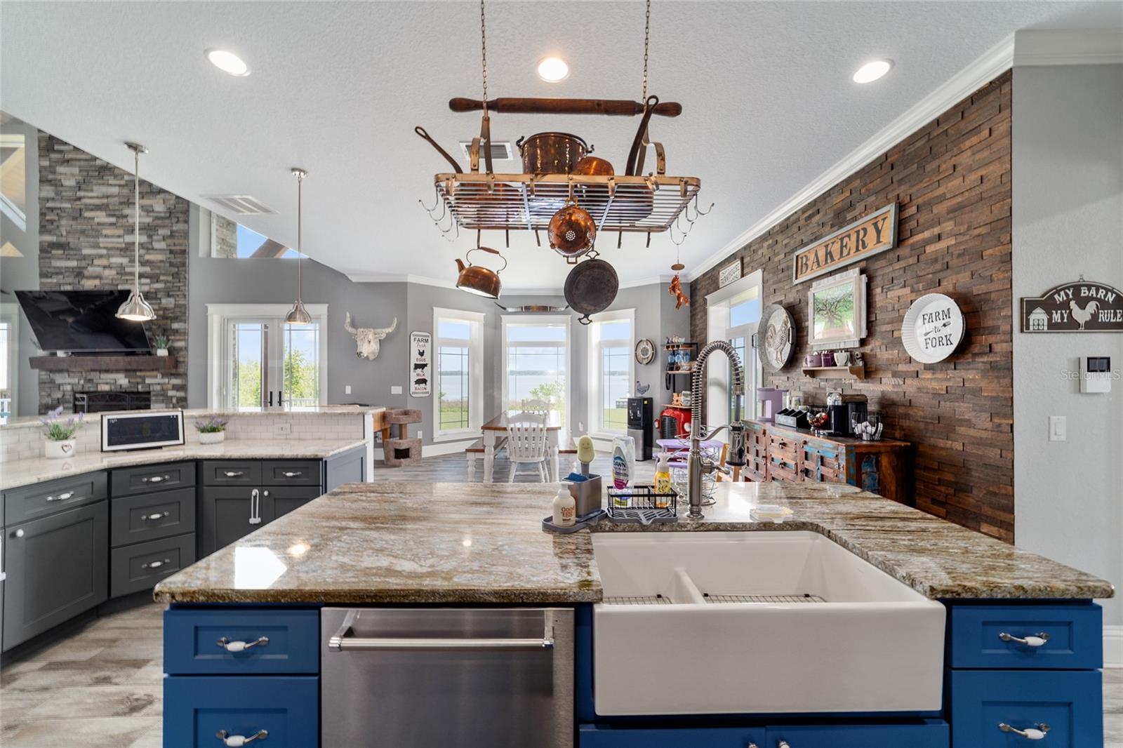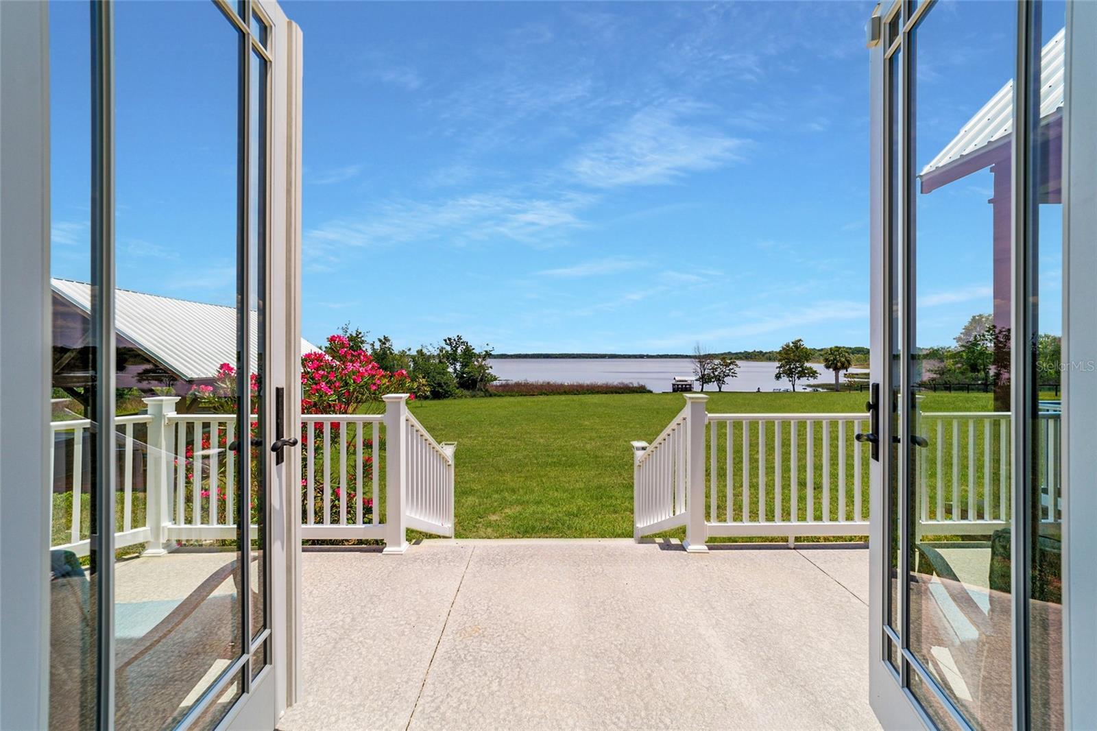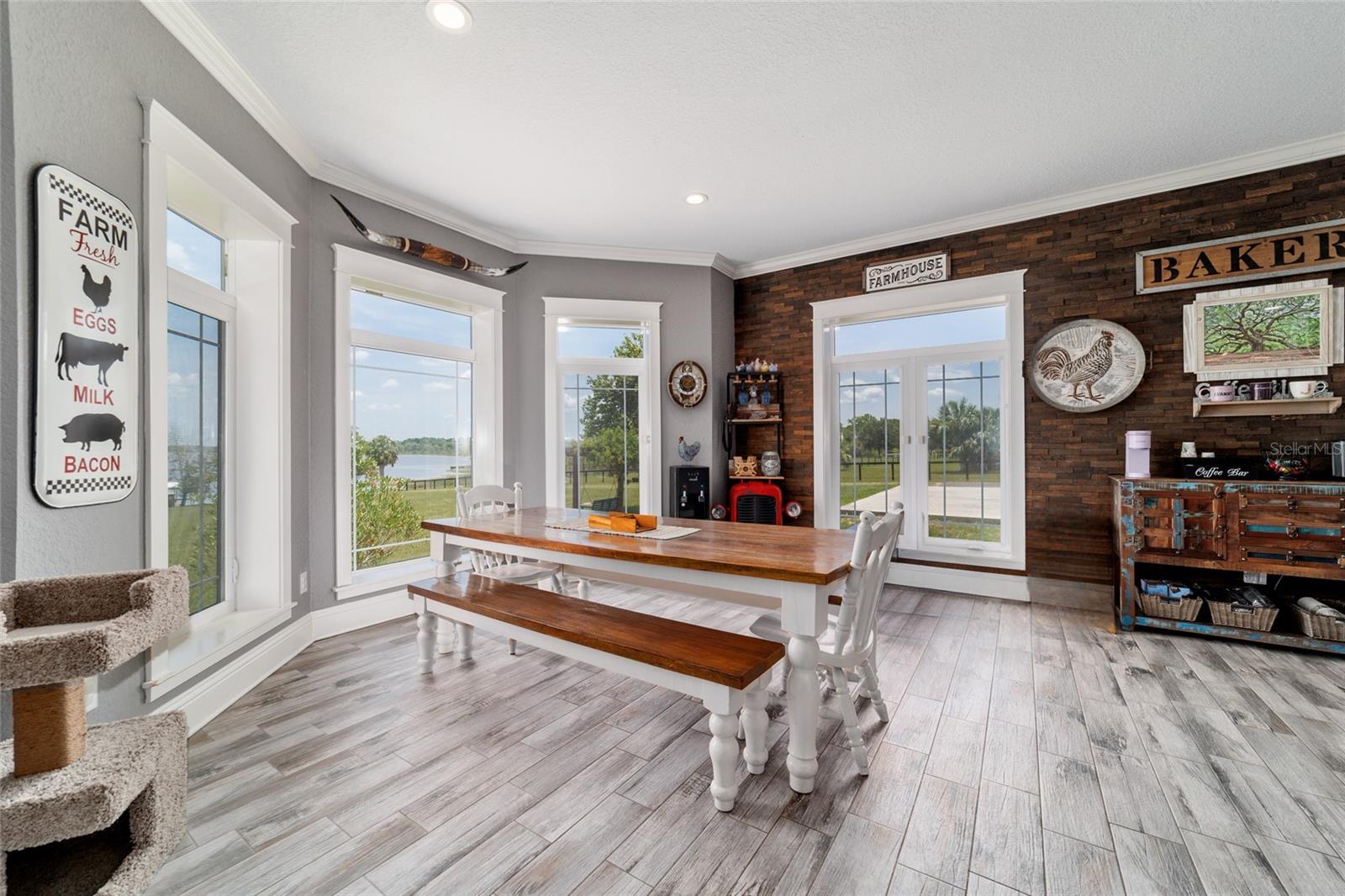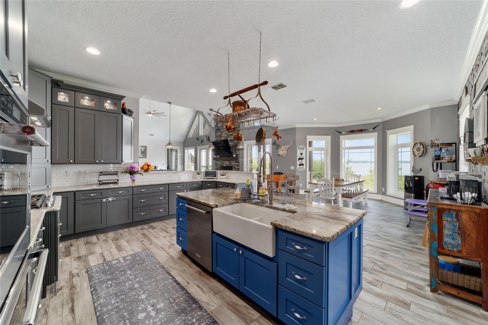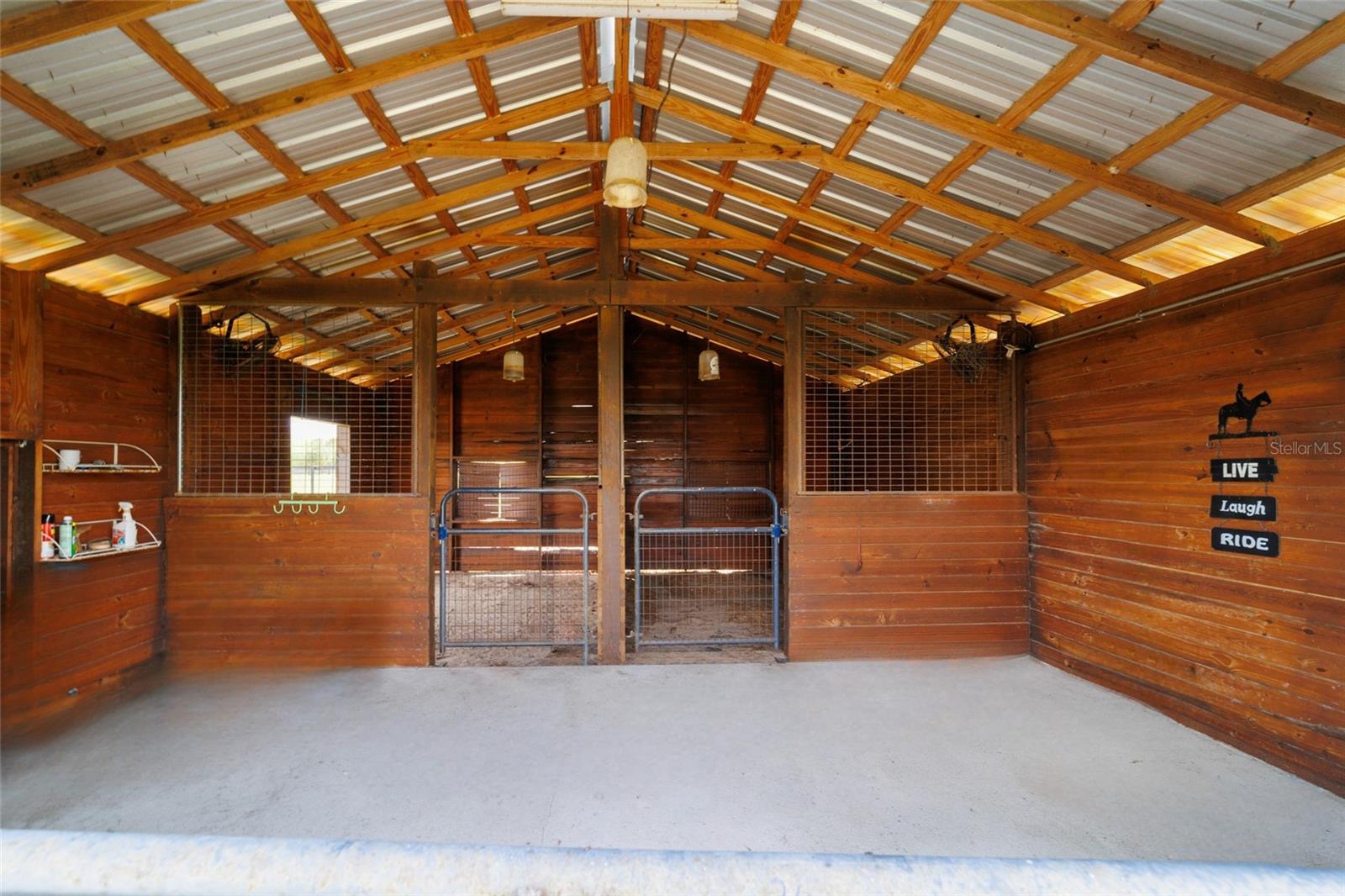 Welcome to a rare opportunity to enjoy the best of both worlds—lakefront living and equestrian comfort—all on one remarkable 8.71-acre property. Tucked beneath a canopy of oaks, this gated estate is located on the shores of Lake Bryant, one of Central Florida’s most sought-after lakes. With over 5,500 square feet of living space in the main home, a detached two-story guest apartment, multiple garages, barns, and an outdoor entertaining cabana, this property offers space, serenity, and versatility unlike anything else in Ocklawaha. From the moment you enter through the electric iron gates and travel the winding asphalt drive, you’ll feel the peaceful seclusion this estate offers. The main home is country-style charm blended with thoughtful upgrades, designed for both family life and entertaining. Downstairs, the expansive master suite features a massive walk-in closet and a spa-inspired bathroom with a clawfoot tub, walk-through tiled shower, and double vanities. An office with French doors and custom built-ins provides the perfect work-from-home space, while the laundry room impresses with its built-in Murphy bed, utility sink, and extra storage. A separate storage room is also attached for added convenience. The heart of the home is the stunning kitchen, where warm cabinetry and abundant counter space are complemented by an island with a ceramic double farmhouse sink, gas cooktop, double ovens, and bar seating—perfect for morning coffee. A huge walk-in pantry completes this highly functional space. The dining area, lined with oversized windows, offers breathtaking views of the backyard and sparkling lake beyond. Up the staircase, a spacious loft overlooks the living room and entryway. One side of the upstairs hosts a bedroom with an oversized bathroom and walk-in closet. The other side features a bedroom with a full bath and an attached game room, offering flexible space for guests. Wood-look tile runs throughout the home, blending rustic elegance with low-maintenance durability. Outdoor living is just as impressive. The backyard includes a covered cabana with a hot tub, granite outdoor kitchen, gas grill, TV, dining area, and wood-burning fireplace—an entertainer’s dream. Just beyond, the private sandy beach and dock offer easy access to Lake Bryant, where you can fish, water ski, and tube. The dock features a charming gazebo and a covered sitting area with a swing that gazes out across the lake. For horse lovers, the property includes a 2-stall wooden barn with a wash rack, a feed/hay storage building, a 2-stall lean-to in the pasture, a round pen, and a large open pasture. The layout is ideal for personal equestrian use with room to expand. There’s also a detached 2-car garage with a carport, another large equipment shed, and a dream 4-car metal garage with a full-length carport—perfect for a car enthusiast. Attached to the metal building is a 2-story guest apartment featuring two bedrooms, two bathrooms, a full kitchen, living room, and a large upstairs window that overlooks the garage. The apartment even has its own front patio, making it perfect for guests, extended family, or rental income. Just 20 minutes to shopping, restaurants, and services, and under 90 minutes to the beaches of Daytona, this unique property offers a lifestyle of adventure, privacy, and possibility. Whether you're soaking in the hot tub under the stars, riding horses through your pasture, or spending the day on the lake, this estate is truly one-of-a-kind.
