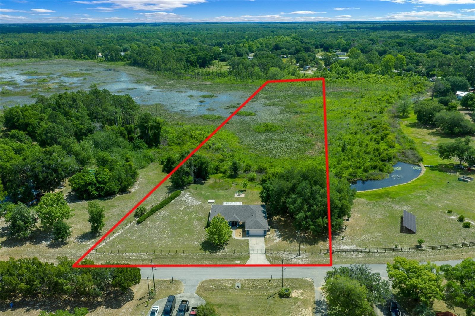 Tucked away on a quiet dead end street, this beautifully maintained 3 bedroom, 2 bath home with a 2 car garage and a versatile office/bonus room offers 2,208 sq. ft. of living space on 4.97 private acres. With water access behind home, it perfectly blends comfort, nature, and convenience in one exceptional property. Ideally located near the water, you’re directly across from Bowers Lake and just 2.9 miles from Carney Island on Lake Weir, offering quick access to some of Central Florida’s best fishing, boating, and kayaking. From the moment you step inside, you’re greeted with breathtaking views of your private backyard, setting the tone for the peaceful lifestyle this home provides. Vaulted ceilings elevate the main living space, where you’ll find a spacious living room highlighted by a stunning wood accent wall and a cozy electric fireplace, perfect for relaxing evenings at home. The heart of the home is the oversized kitchen, thoughtfully designed with abundant cabinet and counter space, granite countertops, and an eat in area, making it ideal for entertaining family and friends. Expansive primary suite is a true retreat, featuring a generous walk in closet and a spa like en suite bathroom complete with dual vanities, a Jacuzzi tub, and a large tiled walk in shower. On the opposite side of the home, two well sized guest bedrooms are paired with a centrally located guest bathroom, offering privacy for guests or family. Through the sliding glass doors, enjoy an oversized screened in porch with peaceful backyard views and natural water behind the home. Outside, evenings are perfect around the fire pit in a serene backyard featuring two sheds for storage, tools, or hobbies. A true nature lover’s setting, with sandhill cranes and local wildlife frequently passing through, creating a peaceful and picturesque atmosphere year round. Additional highlights include a fully fenced yard, perfect for pets, gardening, or simply enjoying your space in privacy. Recent upgrades provide peace of mind, including a New roof 2021, New HVAC system 2025, and a 1 year home warranty offered at closing. If you’ve been searching for privacy, space, and proximity to beautiful Florida waterways, this property delivers it all. Schedule your private showing today and experience the lifestyle this home has to offer!