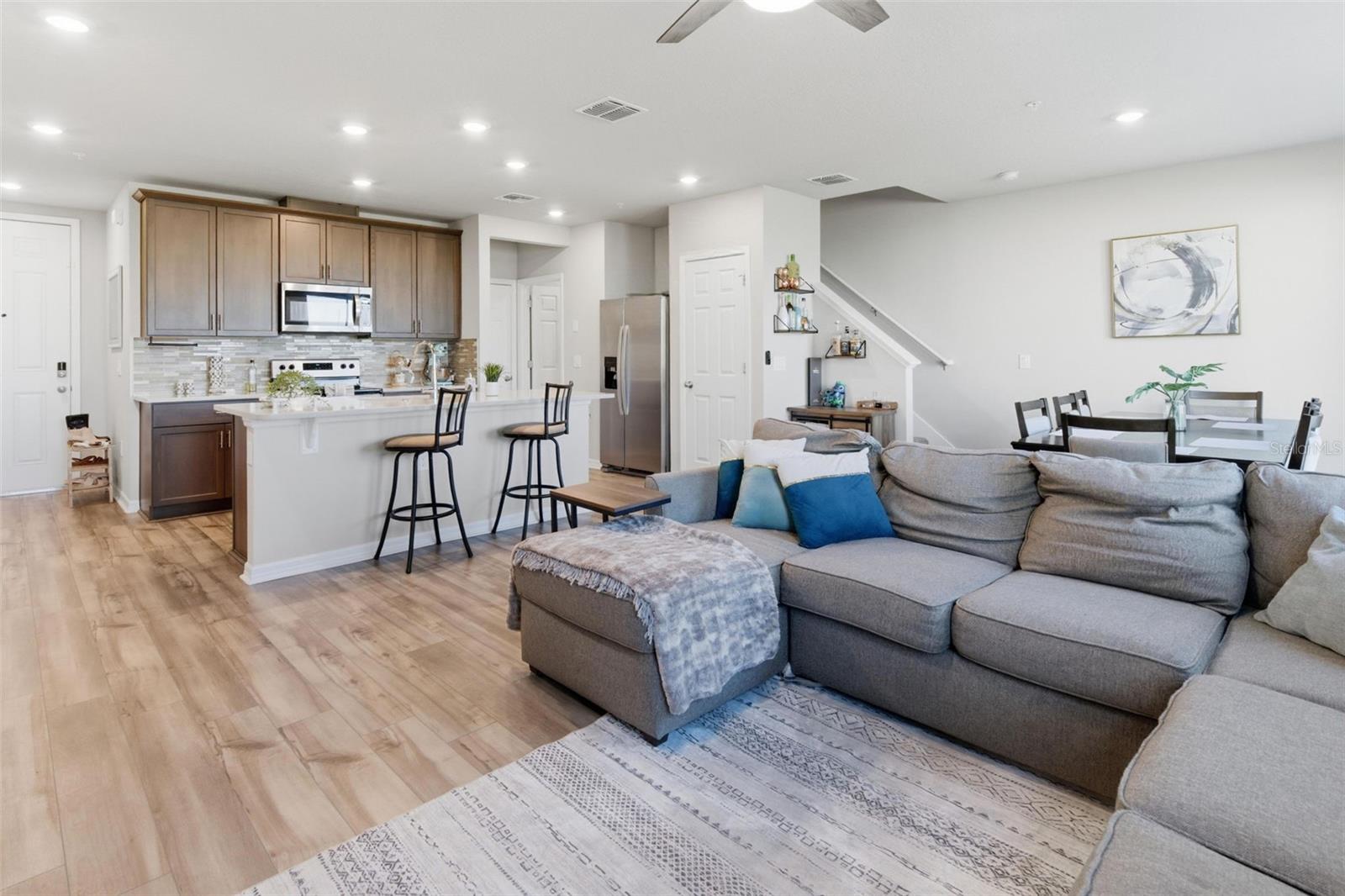 Welcome to modern living with a serene waterfront view! Nestled in the sought-after Greens at Forest Lake, this 2021 Meritage-built townhouse offers a peaceful escape with picturesque views of the community pond right from your back door. Designed for both comfort and style, the home features an open-concept first floor highlighted by beautiful luxury vinyl flooring and a seamless flow between the kitchen and family room—perfect for entertaining. Upstairs, the thoughtfully designed split floor plan is centered by a generous loft, offering a versatile space for a home office, media room, or play area. Beyond your doorstep, enjoy premium community amenities including a sparkling pool, dog park, and playground. Location is everything: you are less than 6 miles from the bustling shops and dining of downtown Winter Garden and just minutes from the 408 and 429, making for an effortless commute. Experience the perfect blend of energy-efficient construction and a low-maintenance Florida lifestyle!