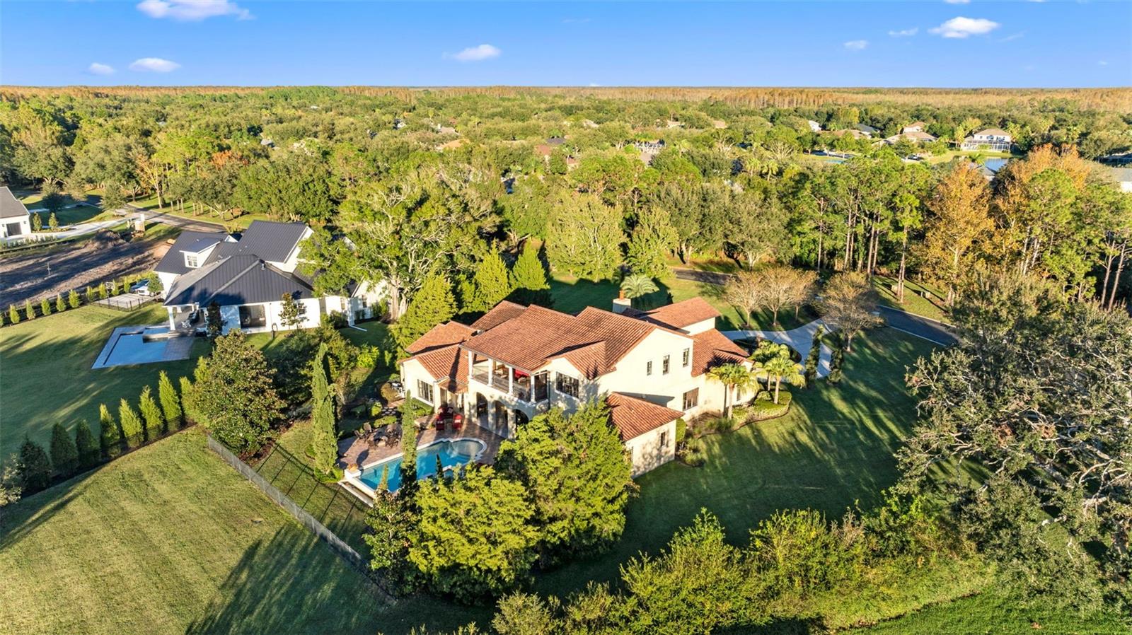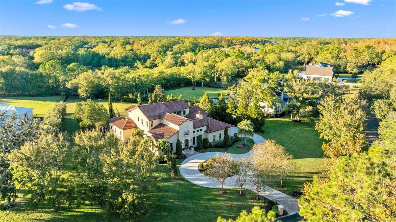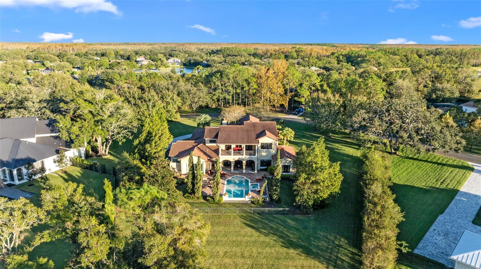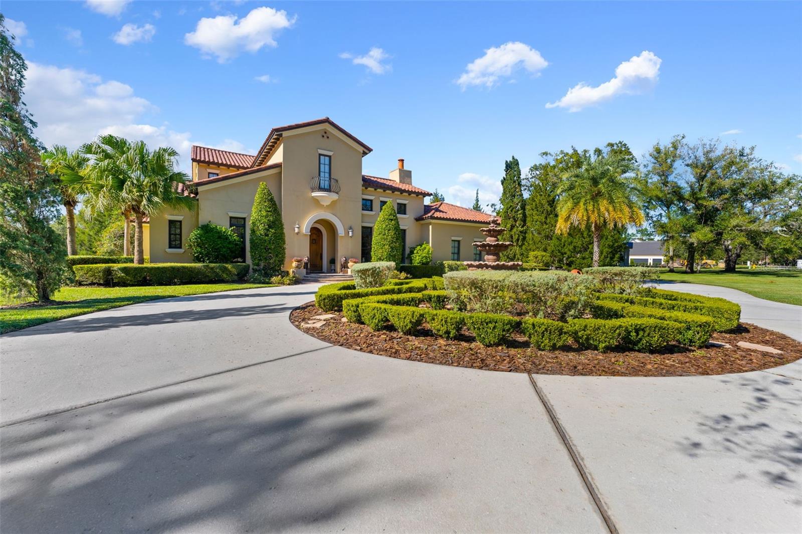 ** BRAND NEW Freshly Installed Roof!** Showings resuming NOW! Experience reimagined luxury in this breathtaking 5,630 sq ft estate built by The Fechtel Company, perfectly situated on a pristine 1.50 acres in the exclusive 24-hour guard gated enclave of Stillwater, where architectural brilliance meets unparalleled craftsmanship. Journey along the tree-lined driveway and stunning landscaping to a stately grand circular drive with a side-entry 3-car garage. Step through the portico into the rotunda-style foyer, complete with a brick-patterned inlay. This Mediterranean-style home features 4 bedrooms including a luxurious primary suite and guest suite located on the first floor, 5 full baths, 2 half baths, formal living and dining rooms, family room, a versatile den, a loft, an expansive bonus room with a mini-kitchen and sweeping balcony, and a unique double flex room. At its heart lies a private center outdoor courtyard, reminiscent of the timeless allure of an Italian piazza, and includes a wall-mounted fountain. Architectural highlights include soaring ceilings, exposed wood beams that enhance its Mediterranean charm, hand-scraped wood floors, crown molding, recessed lighting, art niches, Plantation shutters, rounded corners, and custom closet organizers, along with many other tailored features. The formal living room centers around a striking wood-burning fireplace, complemented by windows topped with transom windows that flood the space with natural light. The kitchen, a masterpiece of design and functionality, stands as the heart of the home, meticulously crafted for culinary creativity and cherished gatherings. It features premium imported Italian Granite countertops, 42” wood cabinets with crown molding, glass inserts, and under-cabinet lighting. The backsplash showcases deco tiles with a unique design under the vent hood. Equipped with GE MONOGRAM appliances, the kitchen boasts a 6-burner gas range, double oven, microwave, two dishwashers, and a spacious double-door refrigerator. Additional highlights include a high bar with a sink, an island with a second sink and cabinets on both sides, a butler’s pantry with a wine refrigerator, and a dining area for eight, creating the perfect setting for hosting and everyday living. Ascend the wood staircase, its risers adorned with unique Italian tile designs, leading to the loft equipped with a desk, cabinets, and a convenient laundry chute. Two spacious bedrooms with closet organizers and ensuite baths are on the second floor. Step into your private oasis, in this stunning outdoor space which features an infinity-edge pool with sun shelf for in-water relaxation, a spillover spa, and a paver pool deck with a gas firepit. Under cover is the lanai complete with an outdoor kitchen and bar for entertaining. All are framed by lush trees, a fenced yard, and serene views of the remaining property that overlooks a wooded area. Seize this amazing opportunity to make the estate of your dream your new home—schedule your visit today!