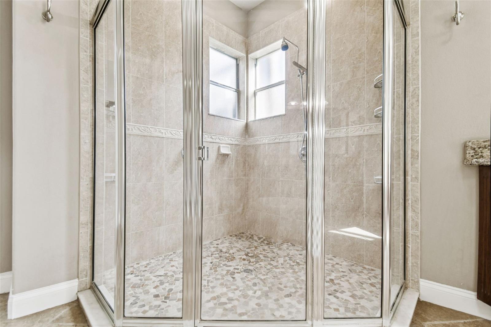 Welcome to this custom built home sitting on a gorgeous half acre lakefront lot. This home features a power entry gate, 5 full bedrooms assures that everyone will have their own private oasis overlooking either the pool or the lake, and each room will have it's own balcony or patio. There is also a separate in-law suite perfect for aging parents or teenagers wanting their own space, in law suite is poolside. From the minute you enter the pool courtyard through the front door you will be amazed at everything this home has to offer. The living room with its gorgeous built ins, and fireplace, kitchen, and dining room all have stunning views of the pool. Kitchen features newer appliances, gas/propane stove, granite countertops with an island and two sinks not to mention a raised bar. Kitchen also features a large walk in pantry. The separate open dining area leads to the huge family/entertainment room with soaring 18 foot ceilings. The entertainment room features lots of windows with fantastic views of the lake. You'll also have a built in fireplace with an elevator tv that doubles as a security monitor. On another wall you'll have a hidden power projector screen for a short-throw projector, giving you spectacular movie nights at home. The unique shaped office-studio with high ceiling will give you plenty of controlled outside lighting with the built in window shutters and views of the pool/courtyard/front door. the primary suite has high, coffered ceiling, two walk in closets, travertine throughout with built in cabinetry. The huge screened enclosed back/lake patio gives you spectacular views of the large backyard and lake. Pet friendly with a fenced side yard. Plenty of room on the patio for a portable firepit to enjoy the stunning sunsets over the lake. The second story offers 3 bedrooms, two have their own balcony, on full bathroom and all new carpeting in 2025. Oversized three car garage with durable flooring, insulated attic storage 2 transfer boxes for back up power hook up. Garage is also wired for charging to EVs. Lawn sprinklers on a well. All 3 hvac units replaced in 2017/2018, Pool remodeled and resurfaced in 2023, New roof in 2021, water heater replaced in 2020. Tall 8 foot doors throughout.