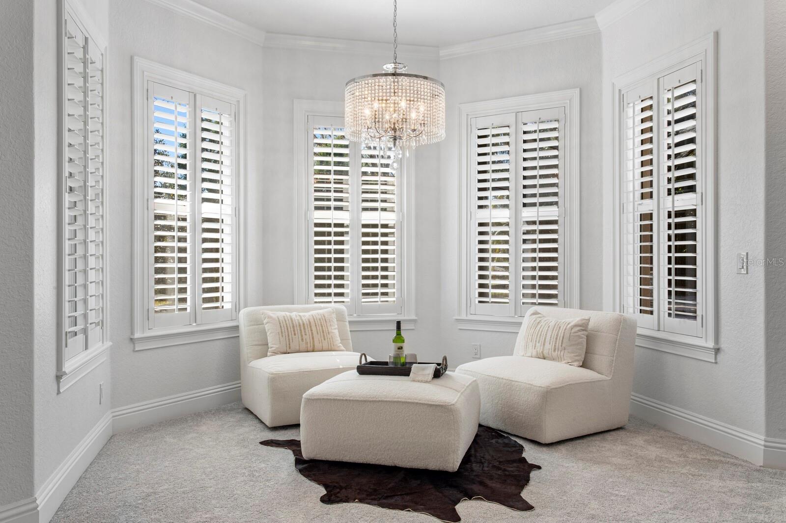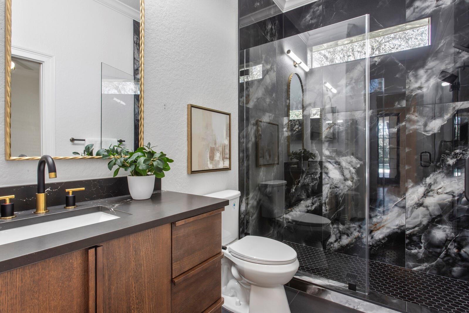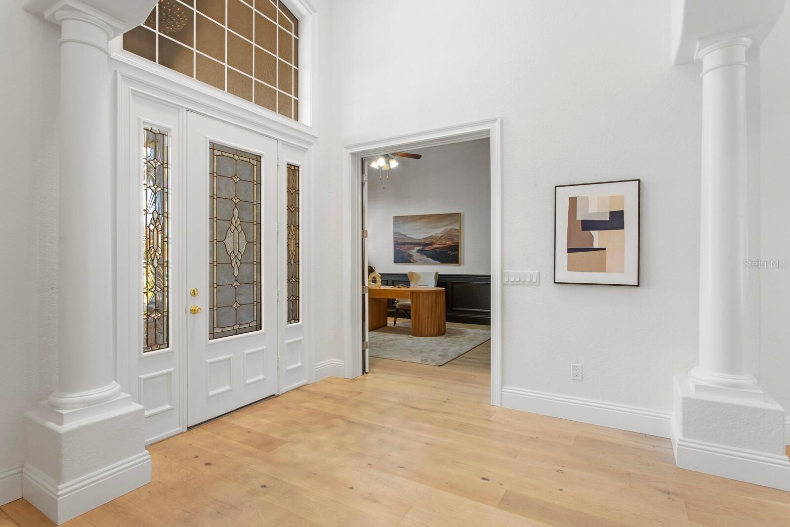 Set on a pristine 1-acre homesite within the gated enclave of Northbridge at Lake Pretty, this fully updated estate delivers architectural presence, refined finishes, and exceptional privacy in one of Odessa’s most sought-after communities. This expansive residence offers over 5,300 square feet of living space, all thoughtfully designed on one level. Single-story estates of this scale are exceptionally rare, delivering seamless flow, ease of living, and architectural presence without stairs. A sweeping brick paver circular drive leads to a stately columned portico, creating a striking first impression. Inside, a dramatic two-story foyer with soaring 20-foot ceilings and statement lighting sets the tone for the scale and sophistication carried throughout the home. The private office is richly detailed with crown molding, wainscoting, and chair rail, offering an elegant workspace. Opposite, the formal dining room features a tray ceiling with uplighting and a designer Restoration Hardware fixture, ideal for elevated entertaining. The formal living room is centered beneath a sculptural globe chandelier and framed by quad French doors that open to the outdoor living spaces. Hardwood floors flow throughout the main living areas, complemented by plantation shutters and extensive crown molding. At the heart of the home, the expansive gourmet kitchen is designed for both everyday living and entertaining. Two oversized islands provide generous prep and gathering space, one with a breakfast bar and the other with a vegetable sink. Custom 42-inch wood cabinetry, granite countertops and backsplash, a walk-in pantry, wine refrigeration, induction cooktop, and premium Dacor stainless appliances complete the space. The adjacent great room features a gas fireplace wrapped in floor-to-ceiling granite, creating a cohesive and dramatic focal point. The owner’s retreat is privately positioned and generously scaled, offering dual walk-in closets and a versatile bonus space ideal for a fitness room, dressing room, or secure storage. The spa-inspired primary bath has been completely reimagined with a freestanding soaking tub, an expansive walk-in shower, dual vanities with full-height mirrors, and designer lighting. All bathrooms throughout the residence have been fully renovated with refined, modern finishes, ensuring a cohesive, move-in-ready experience across every suite and guest space. Three additional bedrooms each include walk-in closets and private ensuite baths, delivering comfort and privacy for family and guests. A massive bonus room provides endless flexibility, currently configured as an entertainment lounge with multiple mounted televisions and direct French door access to the outdoor living areas. Step outside to a private resort-style setting featuring a brick paver pool deck, covered lanai, outdoor kitchen with grill and vent hood, sparkling pool with spillover spa, and mature landscaping that enhances privacy. Significant recent upgrades include a brand-new tile roof, adding both value and long-term peace of mind. The oversized four-car garage offers ample space for vehicles, storage, or a home gym. Residents of Northbridge at Lake Pretty enjoy exclusive lake access for kayaking, paddle boarding, and canoeing, all within a secure gated setting just minutes from top-rated schools, shopping, and dining. This is estate living without compromise.