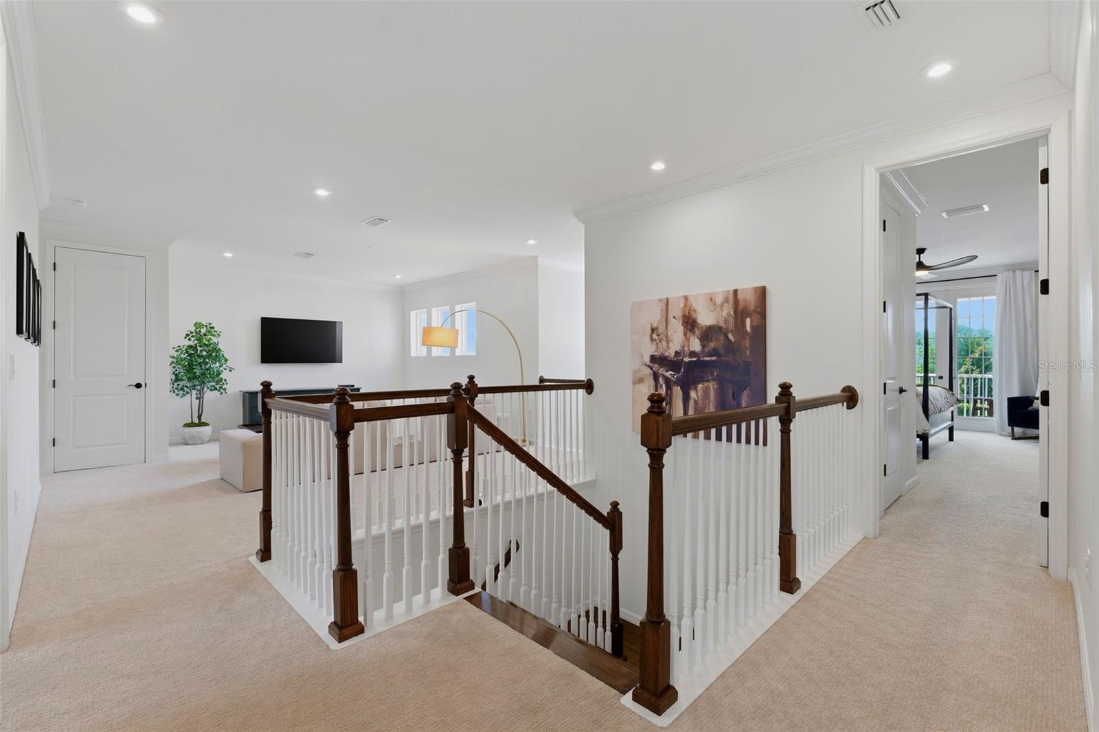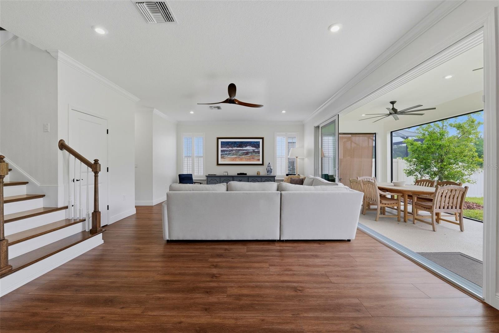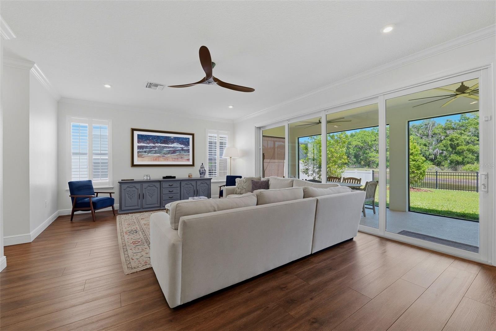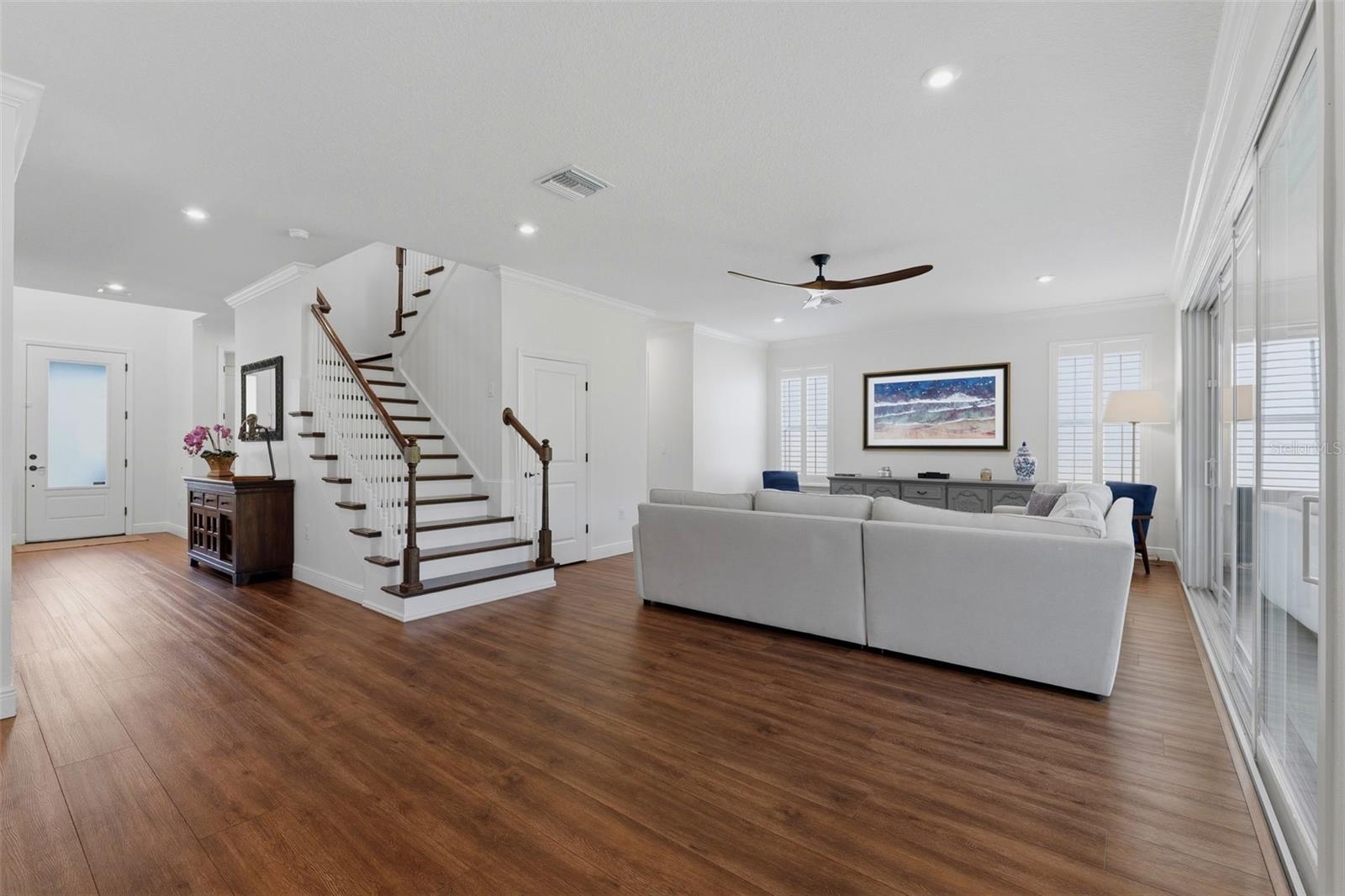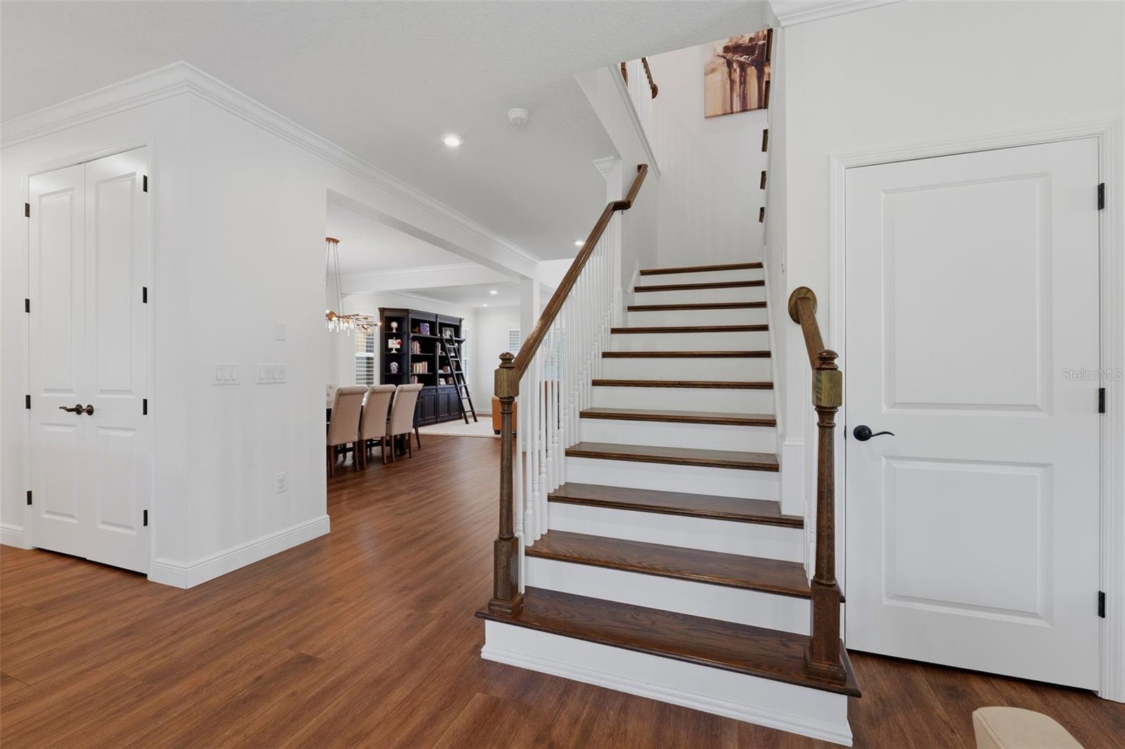 Welcome to 13803 Stansil Ave, where thoughtful design meets elevated, turnkey living in the heart of Starkey Ranch. From the moment you arrive, the pavered driveway and upgraded elevation create a polished first impression, hinting at the level of detail carried throughout the home. Step inside through the front door into a bright, two story foyer, where wide plank luxury vinyl flooring, crown molding, and upgraded lighting immediately set the tone. Just off the entry, a private office with elegant double French doors offers the perfect work-from-home space or flex room. As you move further in, the home opens beautifully into a spacious, light-filled living area designed for both everyday living and entertaining. The gourmet kitchen is truly the heart of the home—featuring 42” upper cabinets with crown molding, quartz countertops, a custom ceramic backsplash, under-cabinet lighting, and high-end built-in appliances. A large island with additional storage anchors the space, while the adjacent breakfast nook provides the perfect spot for casual dining with views of the backyard. The living room flows seamlessly to the oversized screened lanai, creating the ultimate indoor-outdoor lifestyle. Here, you’ll enjoy a premium pond and conservation views, offering peaceful water views, added privacy, and direct access to walking trails right from your fenced backyard. The upgraded “no-see-um” screen enclosure ensures year-round comfort as you relax or entertain outdoors. Upstairs, a spacious loft provides flexible living space, ideal for a media room, playroom, or second living area. The secondary bedrooms are well-sized and thoughtfully positioned, while upgraded plush carpeting and premium finishes continue throughout. The primary suite is a true retreat, featuring custom-built closet systems and private access to a front balcony through double French doors, perfect for enjoying morning coffee or evening sunsets. The spa-like primary bathroom includes a frameless glass shower and elevated finishes designed for comfort and style. Additional upgrades include plantation shutters on the first floor, upgraded blinds upstairs, solid wood stair treads, 8’ upgraded interior doors, designer light fixtures and fans, dimmer switches, a full home water softener, and epoxy-coated garage floors with overhead storage. Every detail has been carefully selected, making this home truly move-in ready and barely lived in. Located in the award-winning Starkey Ranch community, residents enjoy miles of scenic trails, multiple resort-style pools, parks, playgrounds, and a vibrant community atmosphere. With top-rated schools, community events, and easy access to shopping, dining, and major roadways, Starkey Ranch offers a lifestyle that’s hard to match. If you’ve been waiting for a home that combines premium upgrades, a stunning homesite, and effortless living...this is it!