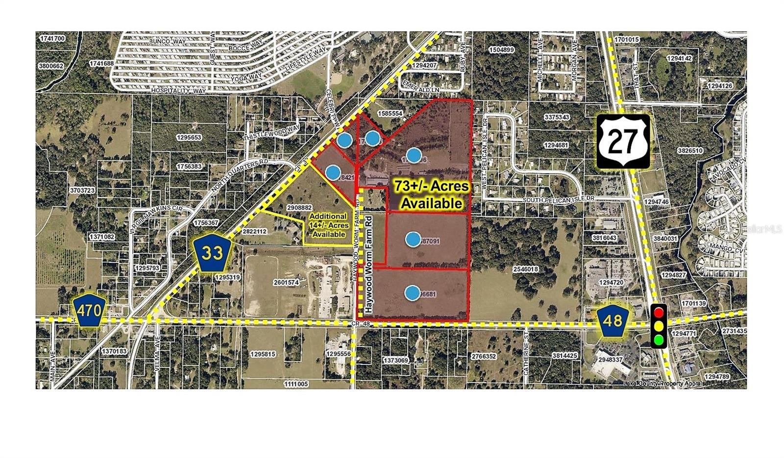 Offering is for 73+/- Acres w/ an adjoining 14+/- acre parcel also available in Lake County, FL just off S US Hwy 27 and surrounded by explosive growth from The Villages newest expansion as well as other developments. The value is in the land. Located under the county's jurisdiction, property will need to be annexed into the City of Leesburg and rezoned for commercial, professional, industrial or mixed use, currently zoned AG with a FLU / Future Land Use of Regional Commercial and access a short distance from US 27 with frontage on CR 48 and CR 33 making this an ideal Central Florida address that is minutes to I-75, Florida's Turnpike and 45 minutes to Orlando or Ocala. Offering is an assemblage of 6 parcels. Lake County Alt Key #'s 1741866, 1774926, 2718421, 1774896, 2587091 & 2696681 with adjoining 290882 also available. All information is believed accurate and correct but not guaranteed or warranted and subject to change without notice. Shown by appointment - do not enter property without authorization.