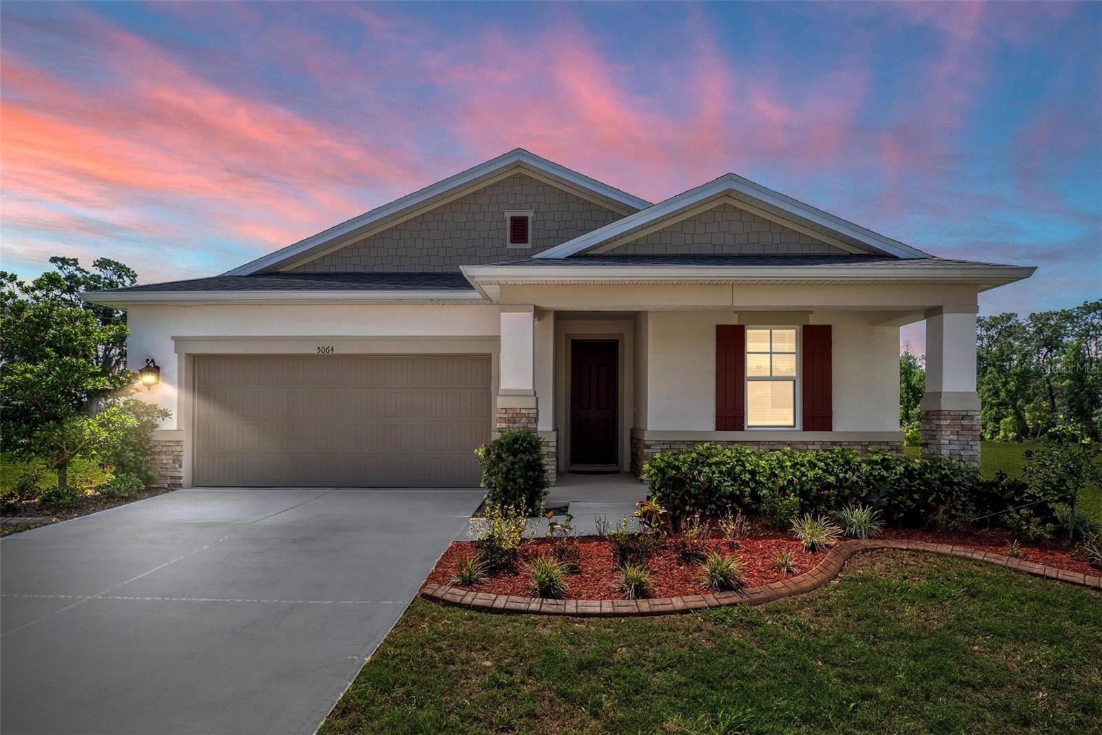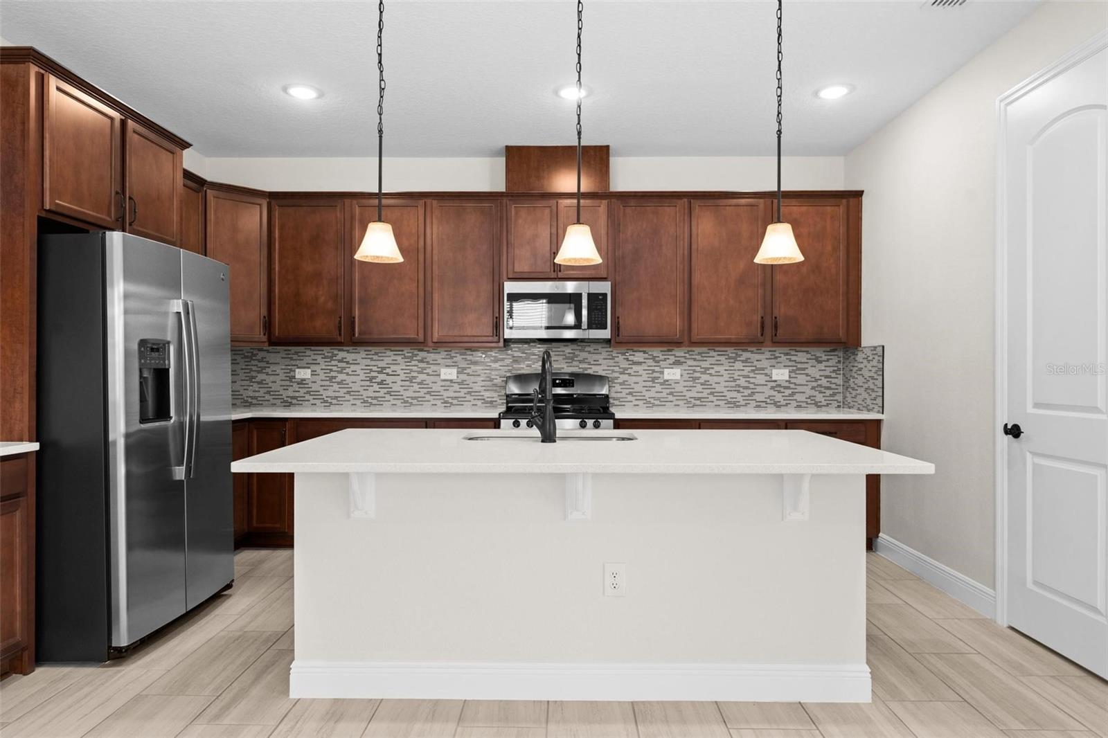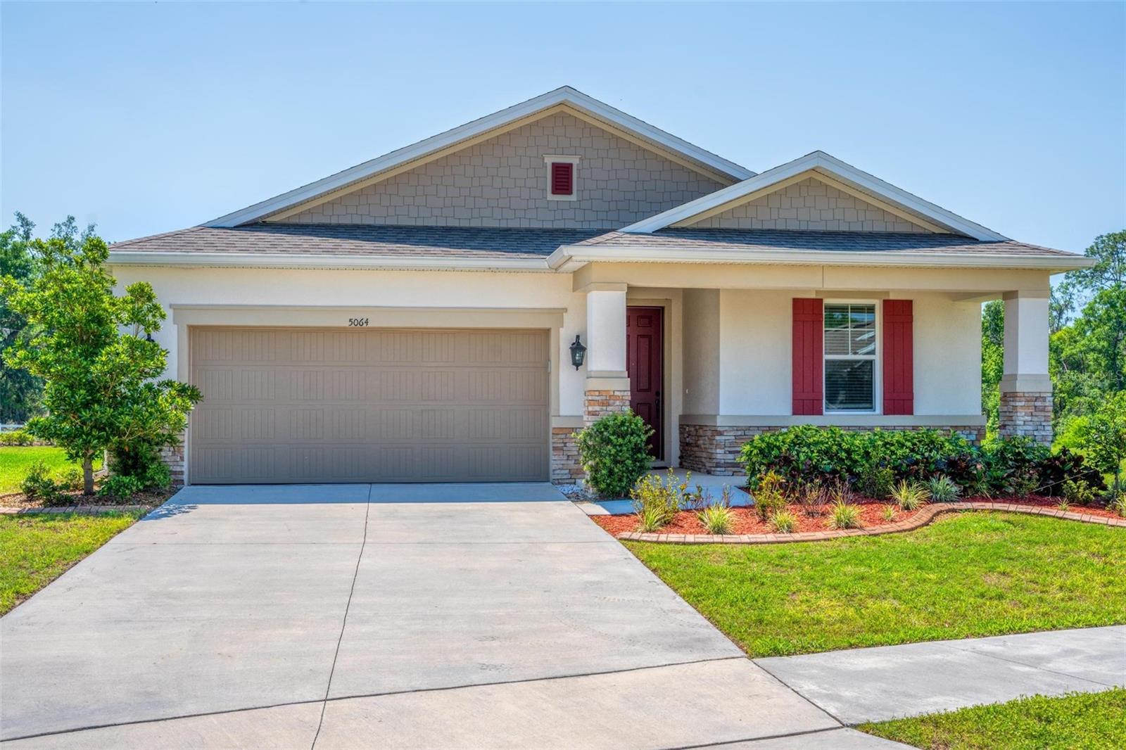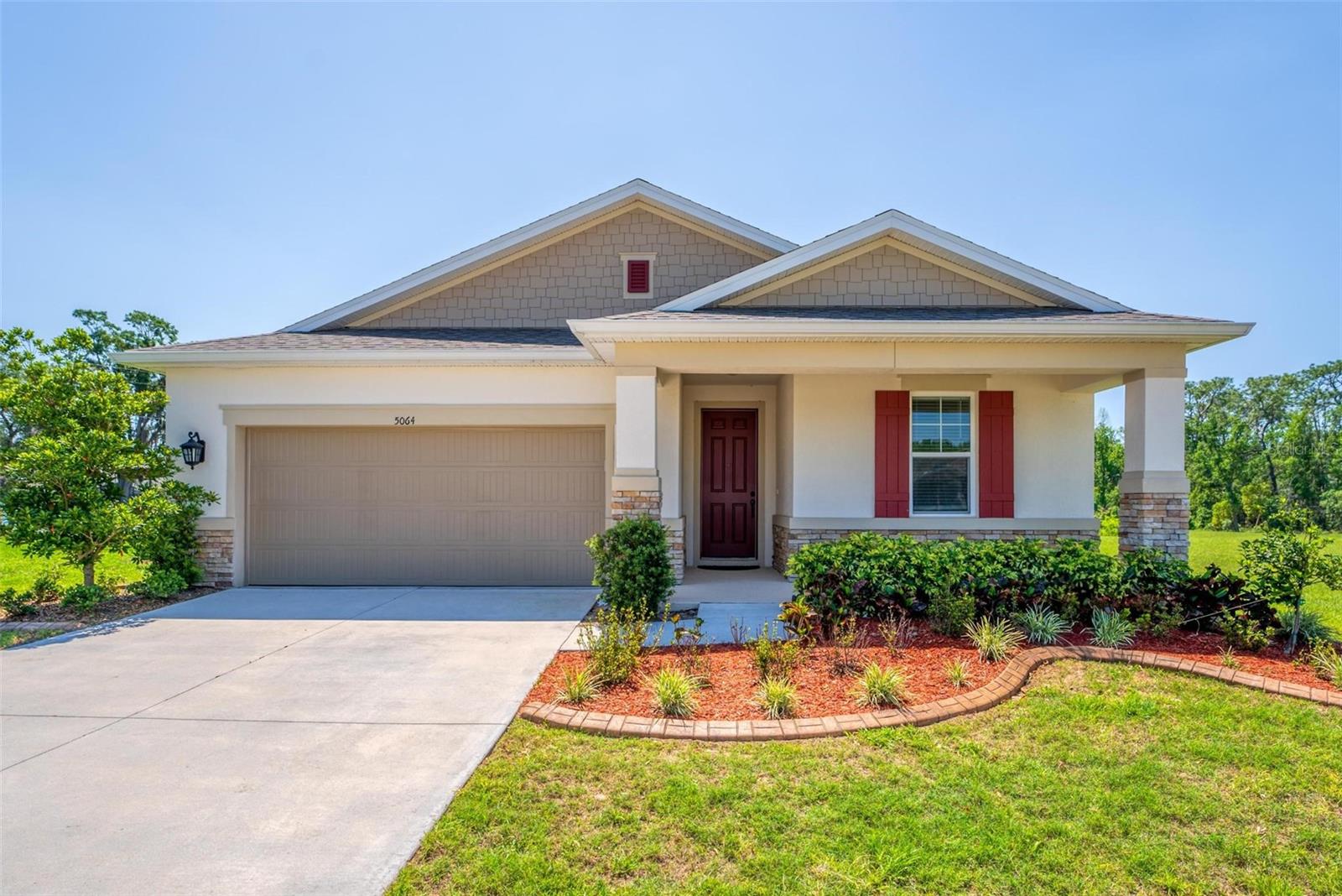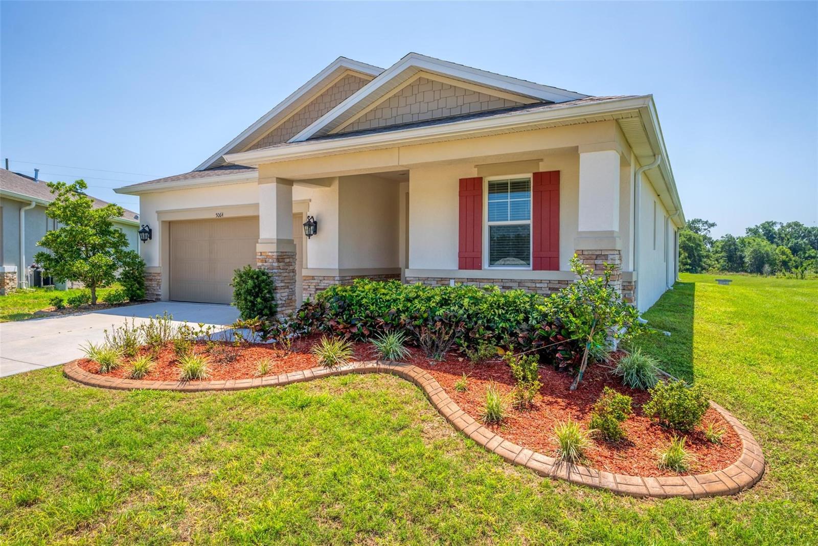 Welcome to this beautifully upgraded 4-bedroom, 3-bathroom home built in 2022, where modern design and high-end features come together to create a truly exceptional living experience. Step into the expansive open floor plan, where soaring 9-foot ceilings and 8-foot interior doors enhance the home’s spacious, airy ambiance. The gourmet kitchen is a chef’s dream, featuring 42" upper cabinets with crown molding, quartz countertops, a full tile backsplash, stainless steel appliances, additional outlets, and soft-close cabinets and drawers with convenient pull-out shelving. A large center island and an oversized pantry complete with an outlet for a freezer, offers generous space for both meal preparation and entertaining. The home is designed with comfort and convenience in mind, featuring porcelain tile flooring throughout the main living areas and comfort-height toilets in every bathroom. Ceiling fans have been installed in every room for year-round comfort, and the property contains a full wired security system. Retreat to the private primary suite featuring a spa-like bath with dual vanities, a walk-in shower with upgraded tile, and a spacious walk-in closet. A secondary bedroom includes its own private en-suite bath, making it perfect for guests or multi-generational living. Additional thoughtful touches include plumbing in place for a water softener and wash basin in the garage and an overhead storage rack for added convenience and organization, as well as pre-plumbing for an outdoor kitchen sink—ideal for backyard entertaining. The extended covered patio overlooks a professionally landscaped front and backyard complete with an irrigation system, creating the perfect outdoor space to relax and unwind. With over $50,000 in tasteful upgrades and located in a desirable community close to parks, schools, and shopping, this move-in-ready home is an absolute must-see. Schedule your private showing today!