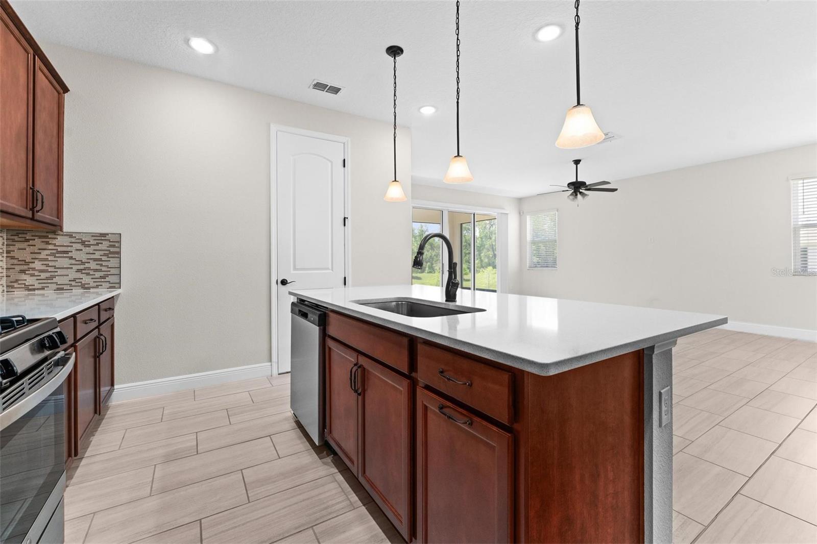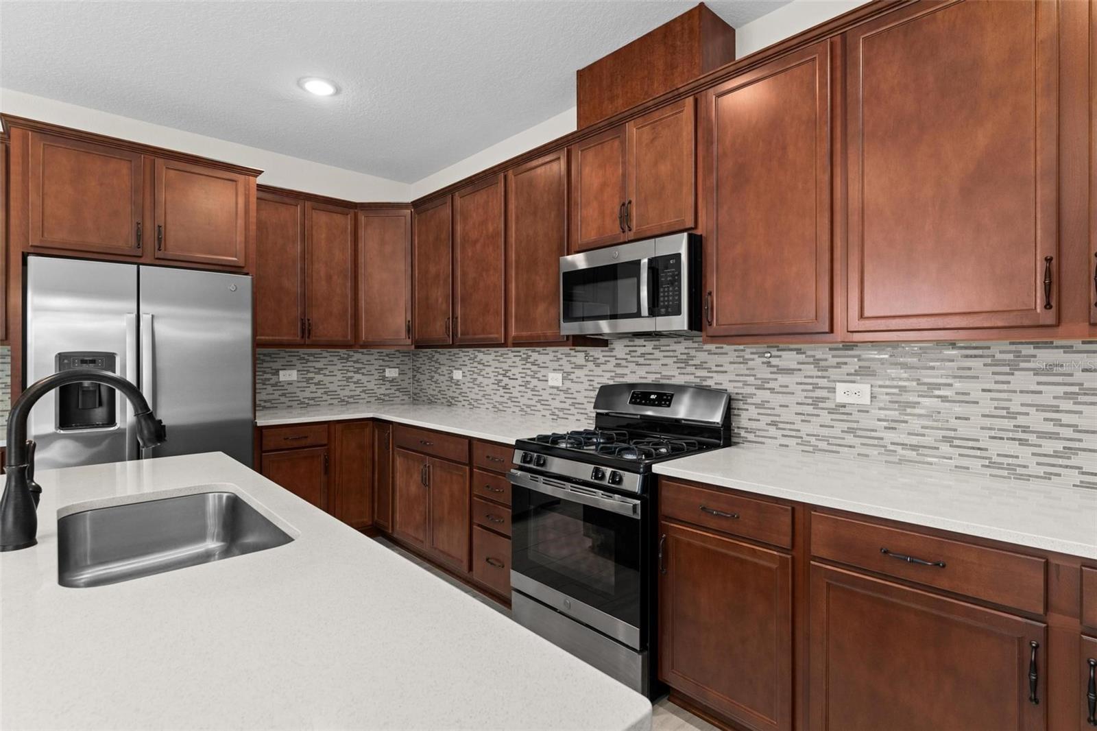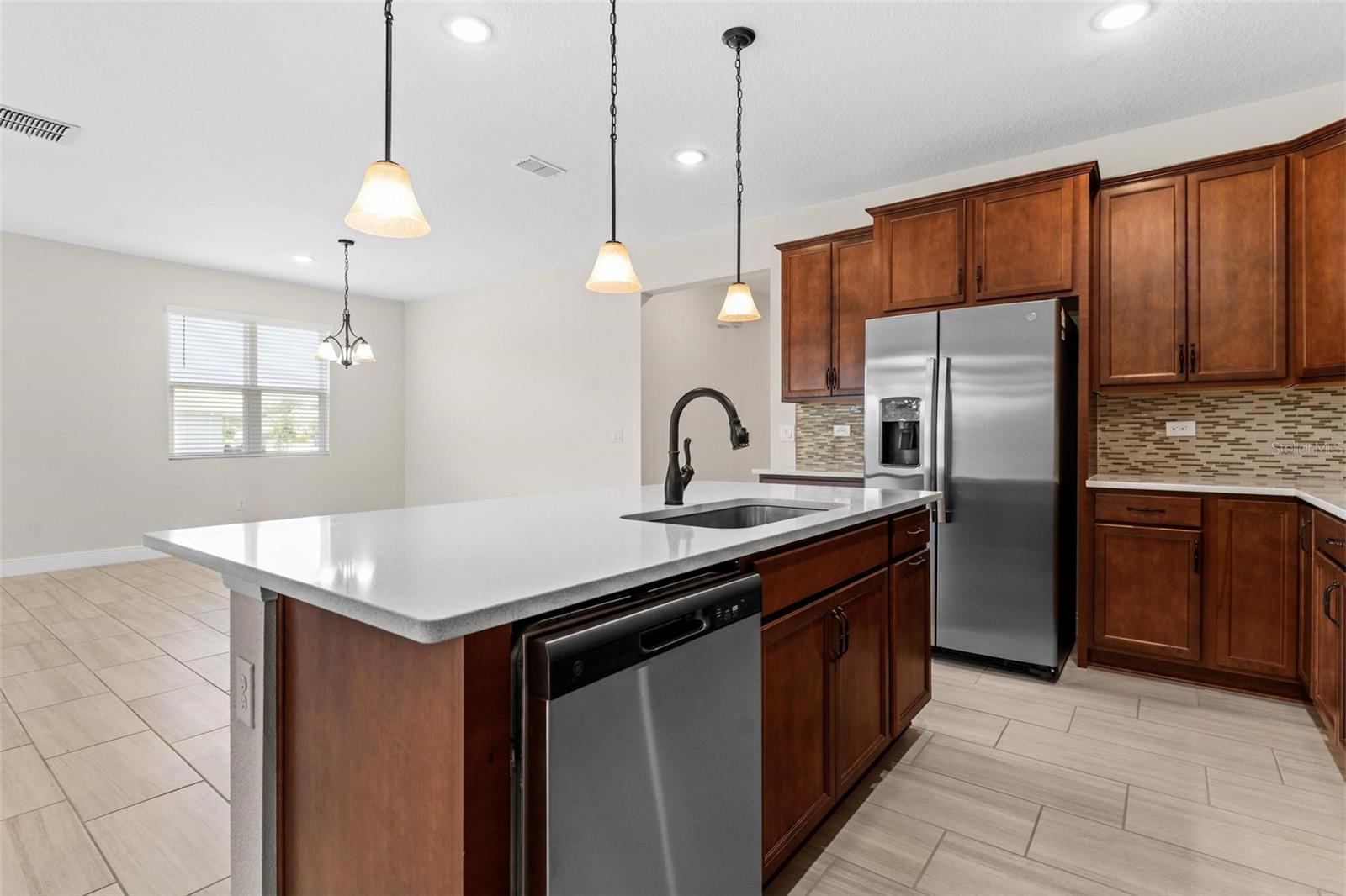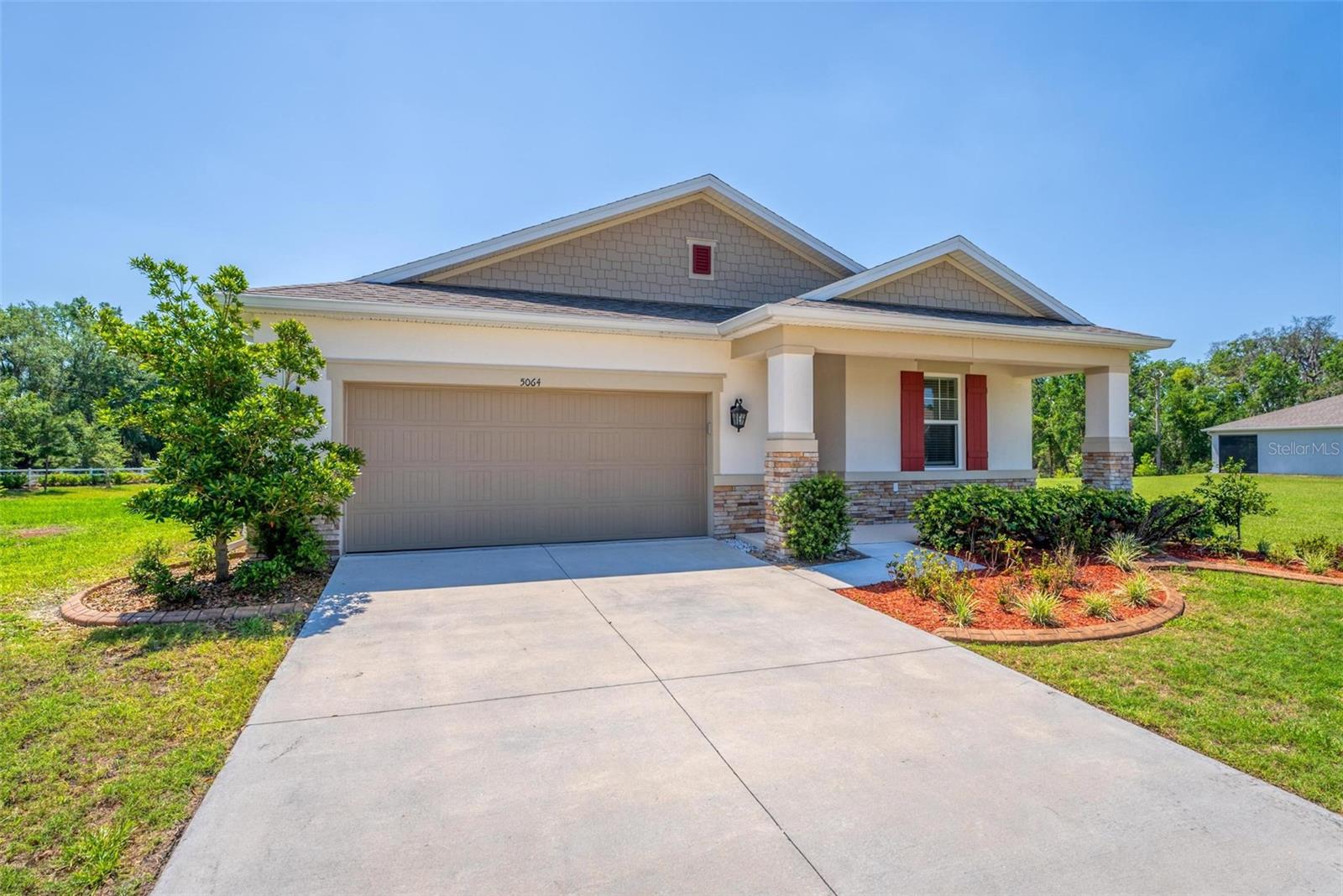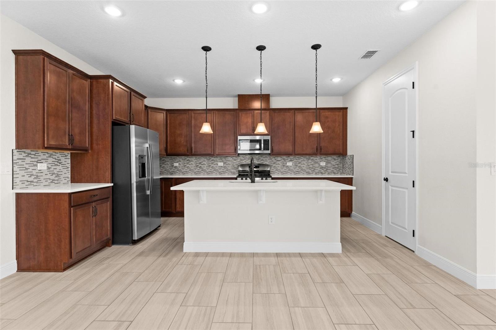 Welcome to this beautifully upgraded 4-bedroom, 3-bathroom home built in 2022, where modern design and high-end features come together to create a truly exceptional living experience. Step into the expansive open floor plan, where soaring 9-foot ceilings and 8-foot interior doors enhance the home’s spacious, airy ambiance. The gourmet kitchen is a chef’s dream, featuring 42" upper cabinets with crown molding, quartz countertops, a full tile backsplash, stainless steel appliances, additional outlets, and soft-close cabinets and drawers with convenient pull-out shelving. A large center island and an oversized pantry complete with an outlet for a freezer, offers generous space for both meal preparation and entertaining. The home is designed with comfort and convenience in mind, featuring porcelain tile flooring throughout the main living areas and comfort-height toilets in every bathroom. Ceiling fans have been installed in every room for year-round comfort, and the property contains a full wired security system. Retreat to the private primary suite featuring a spa-like bath with dual vanities, a walk-in shower with upgraded tile, and a spacious walk-in closet. A secondary bedroom includes its own private en-suite bath, making it perfect for guests or multi-generational living. Additional thoughtful touches include plumbing in place for a water softener and wash basin in the garage and an overhead storage rack for added convenience and organization, as well as pre-plumbing for an outdoor kitchen sink—ideal for backyard entertaining. The extended covered patio overlooks a professionally landscaped front and backyard complete with an irrigation system, creating the perfect outdoor space to relax and unwind. With over $50,000 in tasteful upgrades and located in a desirable community close to parks, schools, and shopping, this move-in-ready home is an absolute must-see. Schedule your private showing today!