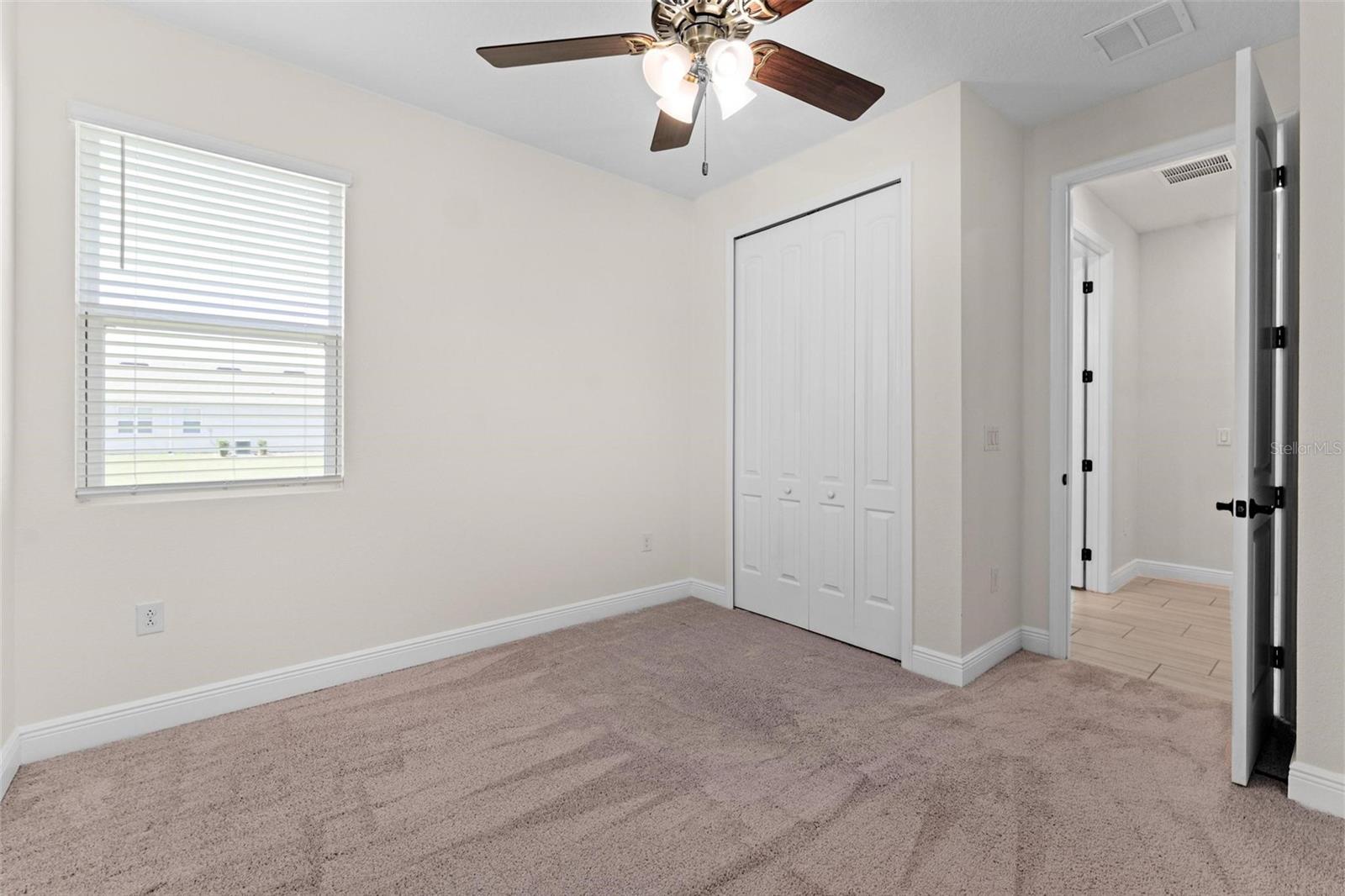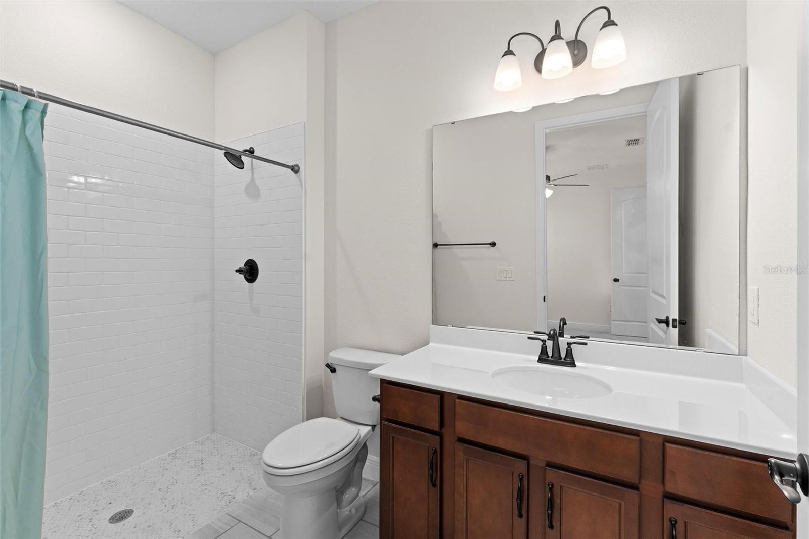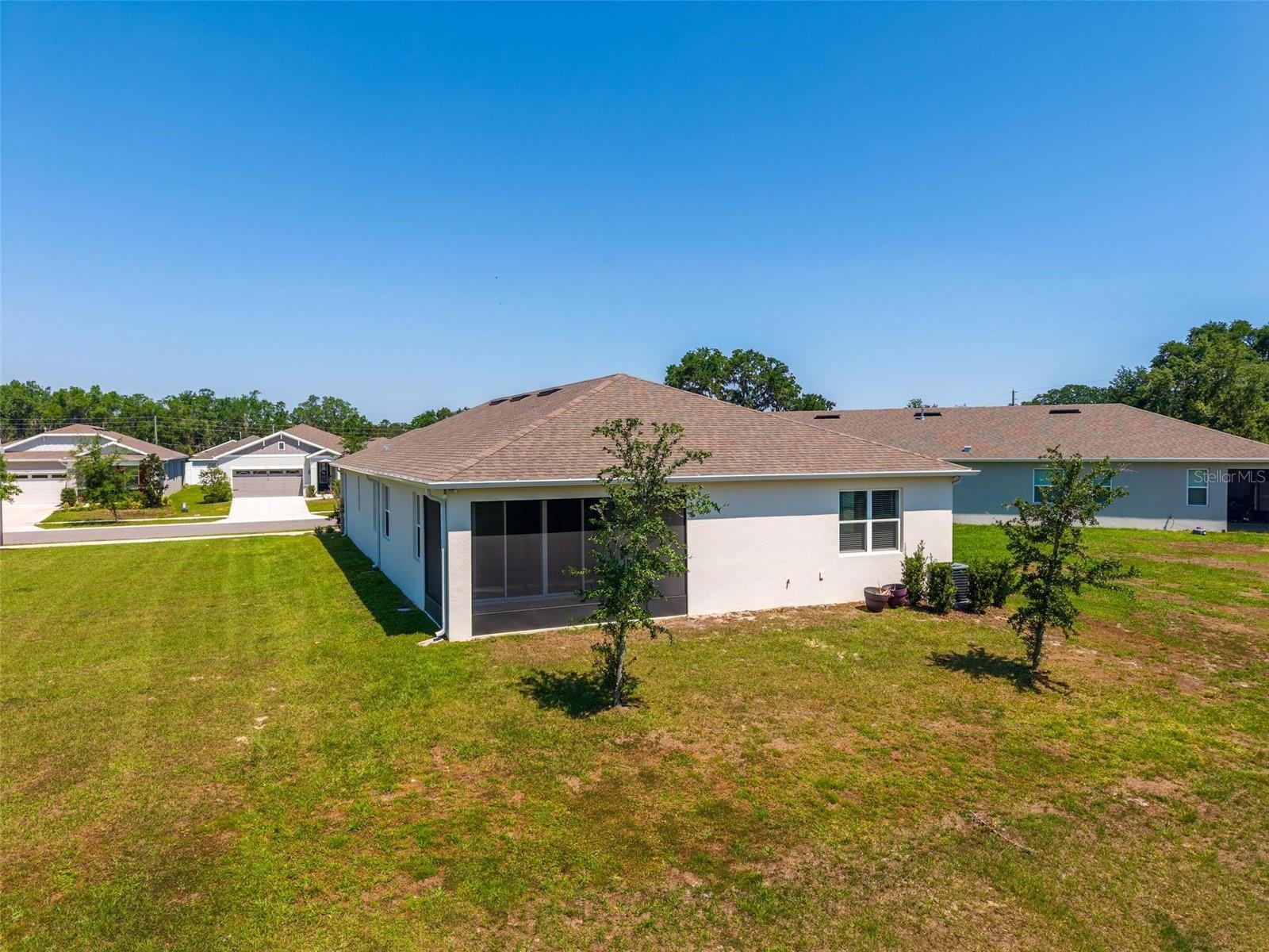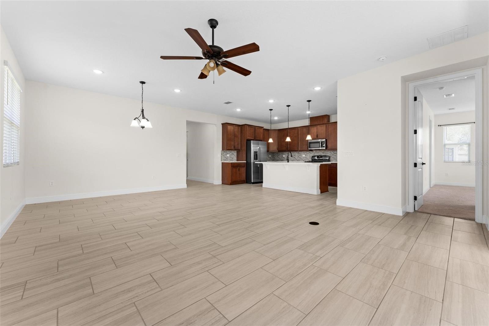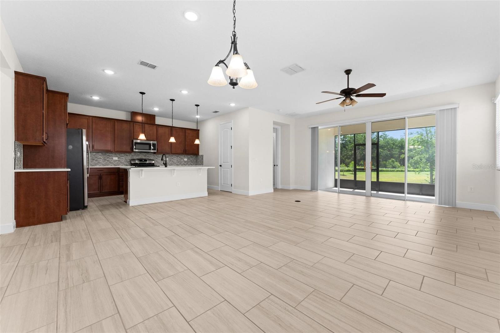 Welcome to this beautifully upgraded 4-bedroom, 3-bathroom home built in 2022, where modern design and high-end features come together to create a truly exceptional living experience. Step into the expansive open floor plan, where soaring 9-foot ceilings and 8-foot interior doors enhance the home’s spacious, airy ambiance. The gourmet kitchen is a chef’s dream, featuring 42" upper cabinets with crown molding, quartz countertops, a full tile backsplash, stainless steel appliances, additional outlets, and soft-close cabinets and drawers with convenient pull-out shelving. A large center island and an oversized pantry complete with an outlet for a freezer, offers generous space for both meal preparation and entertaining. The home is designed with comfort and convenience in mind, featuring porcelain tile flooring throughout the main living areas and comfort-height toilets in every bathroom. Ceiling fans have been installed in every room for year-round comfort, and the property contains a full wired security system. Retreat to the private primary suite featuring a spa-like bath with dual vanities, a walk-in shower with upgraded tile, and a spacious walk-in closet. A secondary bedroom includes its own private en-suite bath, making it perfect for guests or multi-generational living. Additional thoughtful touches include plumbing in place for a water softener and wash basin in the garage and an overhead storage rack for added convenience and organization, as well as pre-plumbing for an outdoor kitchen sink—ideal for backyard entertaining. The extended covered patio overlooks a professionally landscaped front and backyard complete with an irrigation system, creating the perfect outdoor space to relax and unwind. With over $50,000 in tasteful upgrades and located in a desirable community close to parks, schools, and shopping, this move-in-ready home is an absolute must-see. Schedule your private showing today!