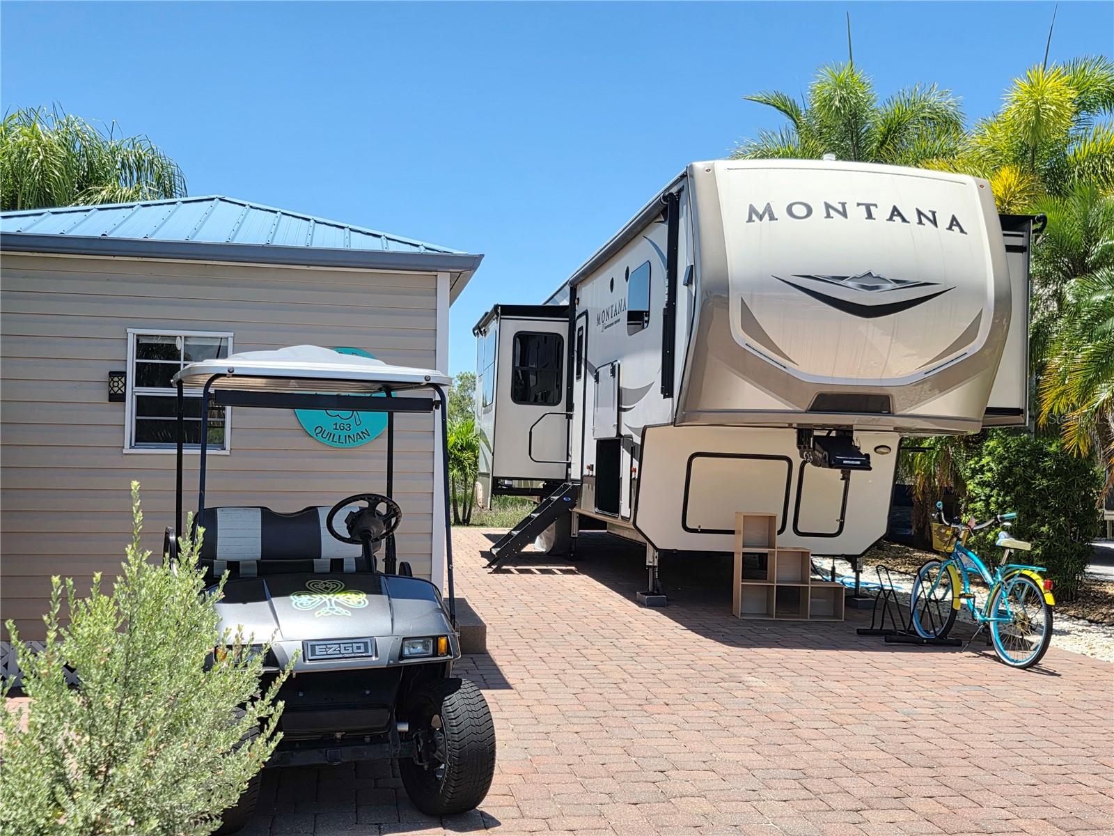 SILVER PALMS 5 STAR RV RESORT - This beautiful property is on the preserve that is teeming with wildlife in the rainy season. The landscaping is superb. Sitting in your Tiki in the evening watching the spectacular sunsets, the Tiki is all screen in for your comfort. The Tiki is 10 x 28, Casita is 10 x 12 and you can build to your own specifications. The property includes a 2020 Montana 5th Wheel. It has hydraulic jacks, pantry, washer/dryer. This is an active resort with Nine (9) pickleball courts, spacious clubhouse, heated pool, Jacuzzi, poolside bar and grill, fitness center, billiards room, fitness center, card room and much more. Golf cart comes with the package, all six batteries were replaced in December 2024. Roof on camper redone in December 2024. This is right across from the clubhouse. Perfect location.