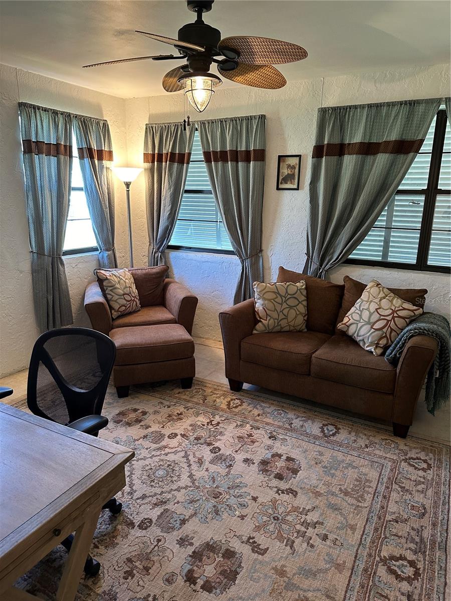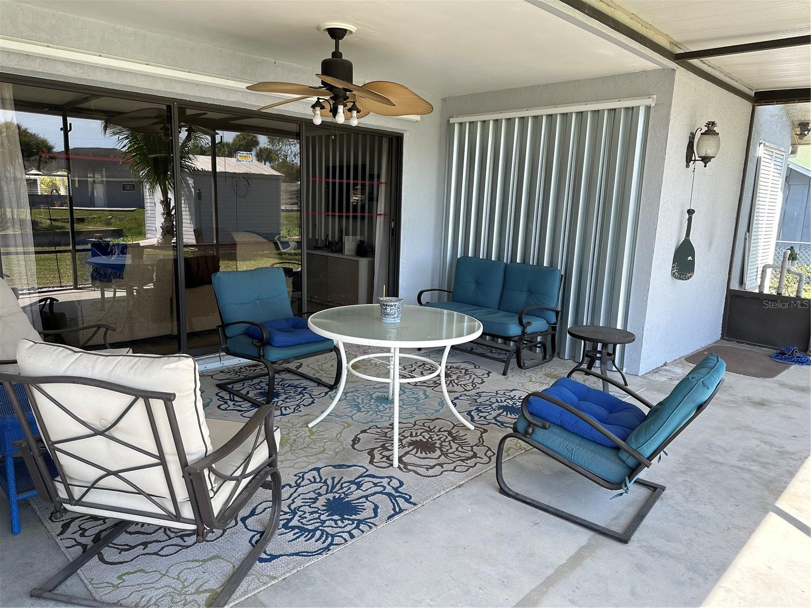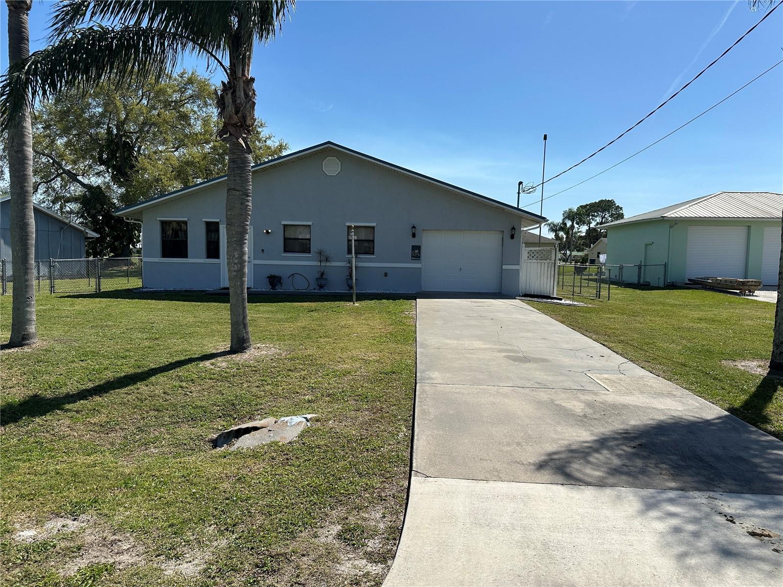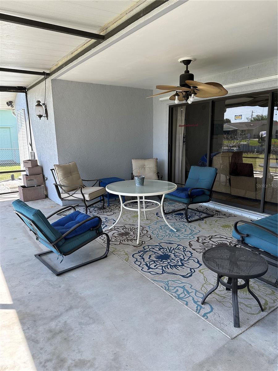 This fully furnished 1,408 square foot, 2 bedroom 2 bath home is a must see. With two principal bedrooms, it is perfect for guests and/or in-laws’ privacy. Open floor plan with large kitchen and plenty of counter space, an abundance of cabinets, new dishwasher and natural light. The walk in pantry can double as a safe room/storm shelter with cement block concrete filled walls and rebar reinforcement on all exterior walls. The office is perfect for those that work from home or need an additional room for gaming or crafting zone. It includes a sleeper sofa, plenty of natural light and direct outside entrance. Each bedroom includes great natural light, walk-in closets, recently updated bathrooms, newly tiled floors, new paint and upgraded LED lighting fixtures and ceiling fans. The largest of the bedrooms includes a sliding door with direct access to the large screened in back porch overlooking the canal. The living area opens directly onto the screened porch via three-panel sliding door, perfect for entertaining. The porch is a retreat to listen to the water fountain and it receives morning sunlight and is shaded in the afternoon and early evening. The garage is the perfect man cave with work bench, plenty of shelving, wall of peg board, separate air conditioner, and ready to be stocked beer fridge. Metal roof is less than 5 years old. New central air and heat pump. Includes updated washer and dryer, all appliances, window treatments and Miami or Malibu shutters for all windows including sliding doors. Yard includes storage shed with metal roof, fenced in back yard, cement seawall and automatic irrigation system.