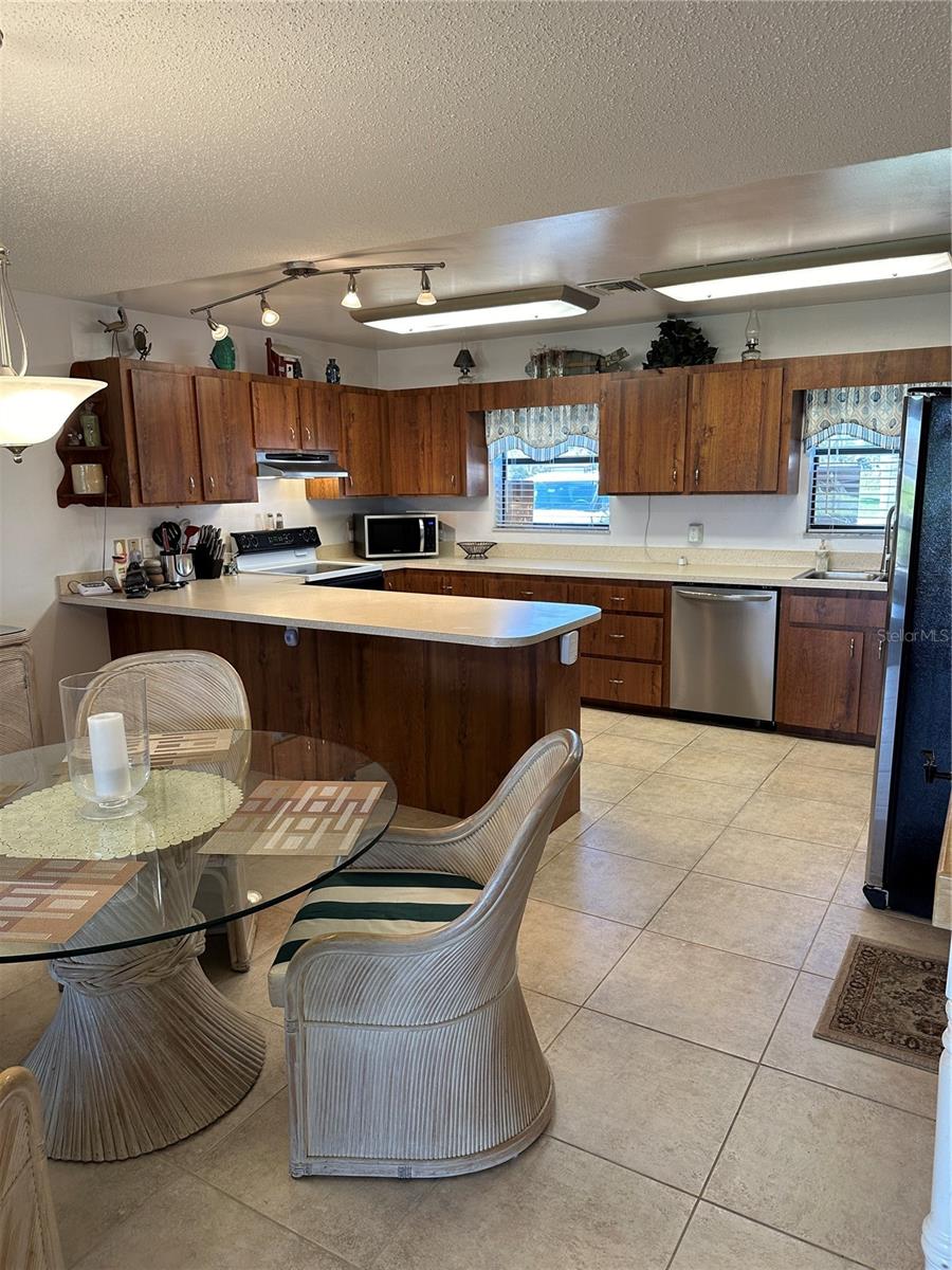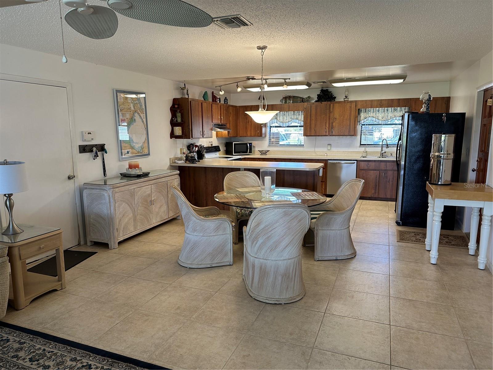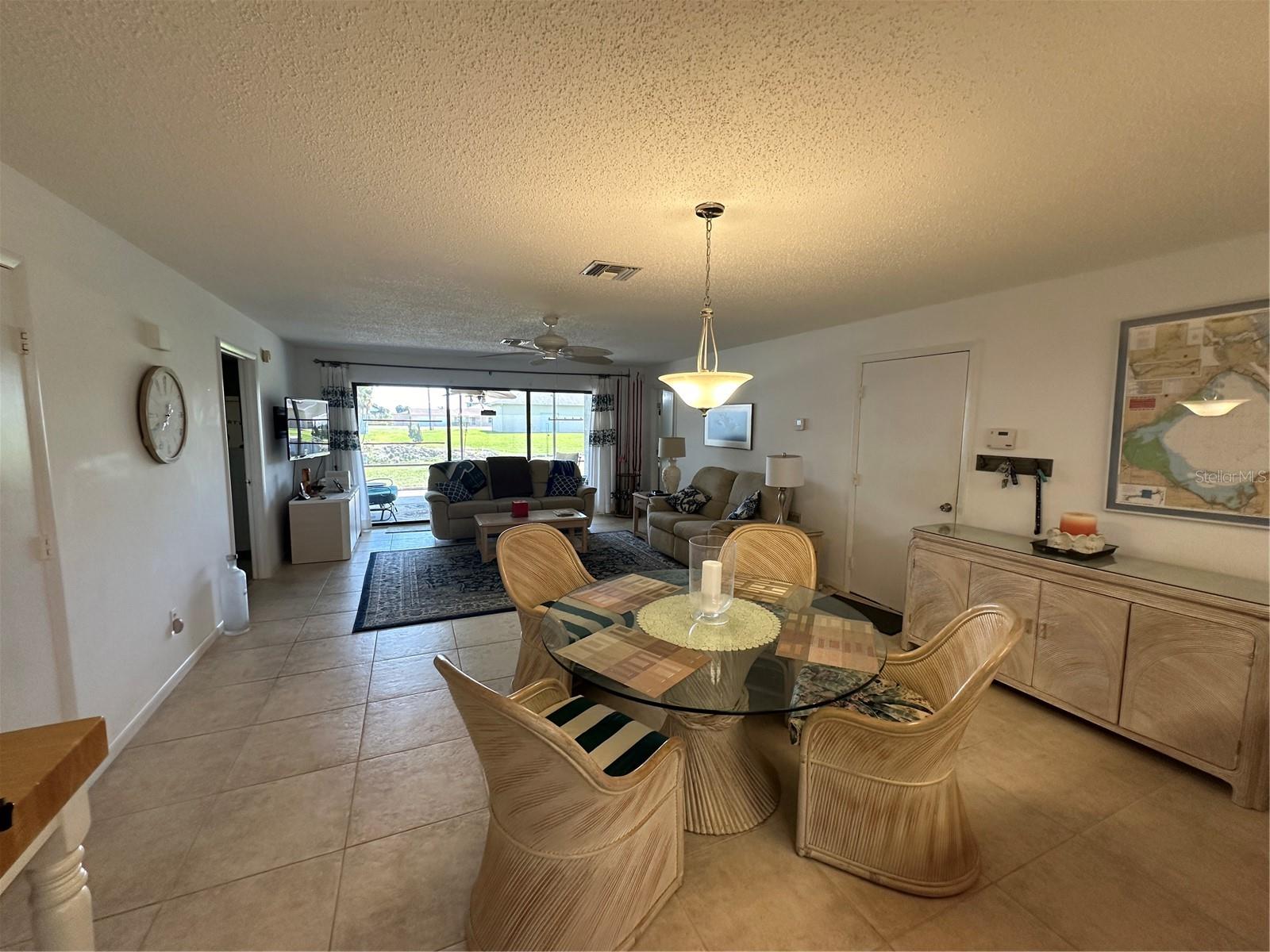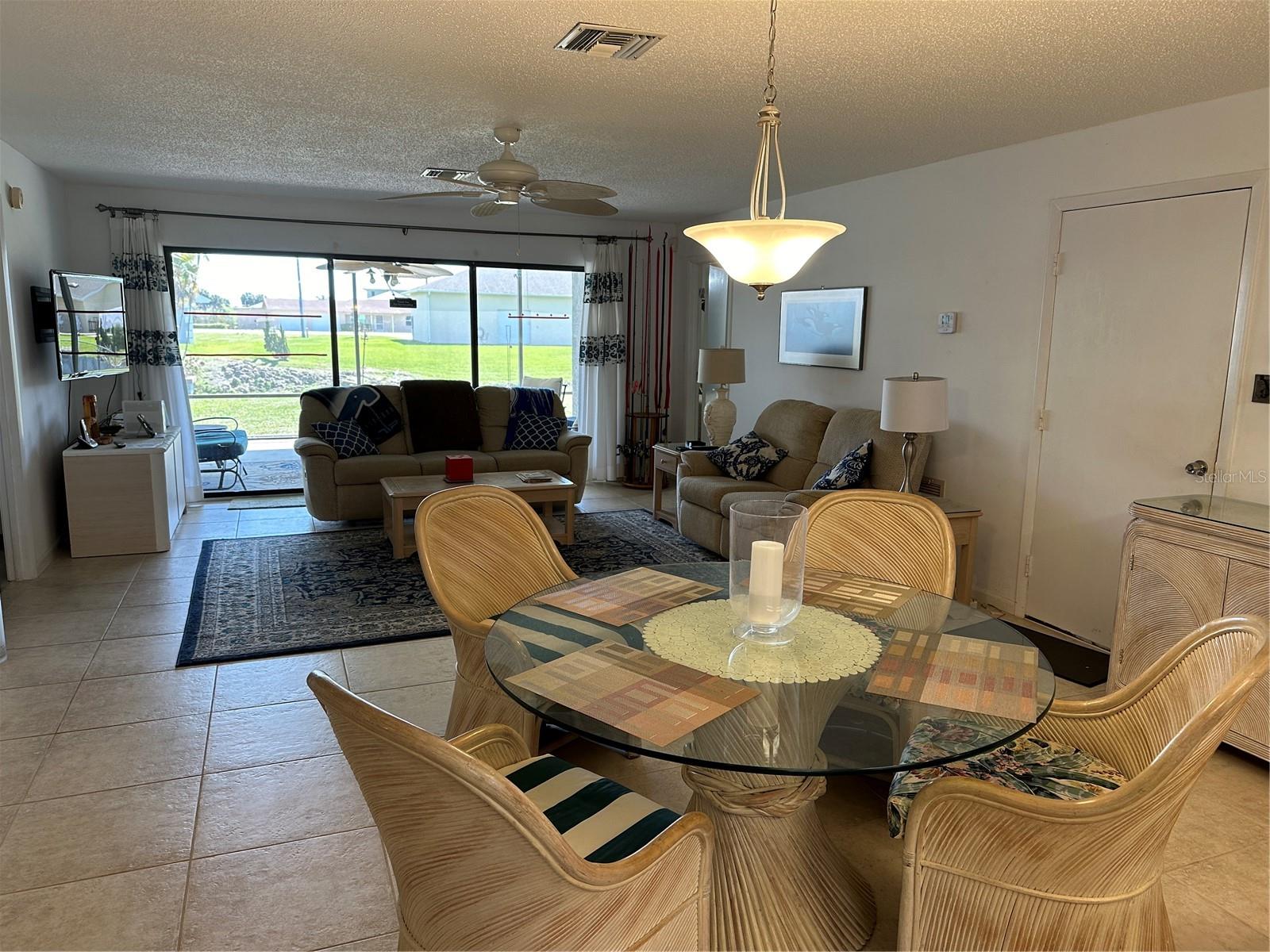 This fully furnished 1,408 square foot, 2 bedroom 2 bath home is a must see. With two principal bedrooms, it is perfect for guests and/or in-laws’ privacy. Open floor plan with large kitchen and plenty of counter space, an abundance of cabinets, new dishwasher and natural light. The walk in pantry can double as a safe room/storm shelter with cement block concrete filled walls and rebar reinforcement on all exterior walls. The office is perfect for those that work from home or need an additional room for gaming or crafting zone. It includes a sleeper sofa, plenty of natural light and direct outside entrance. Each bedroom includes great natural light, walk-in closets, recently updated bathrooms, newly tiled floors, new paint and upgraded LED lighting fixtures and ceiling fans. The largest of the bedrooms includes a sliding door with direct access to the large screened in back porch overlooking the canal. The living area opens directly onto the screened porch via three-panel sliding door, perfect for entertaining. The porch is a retreat to listen to the water fountain and it receives morning sunlight and is shaded in the afternoon and early evening. The garage is the perfect man cave with work bench, plenty of shelving, wall of peg board, separate air conditioner, and ready to be stocked beer fridge. Metal roof is less than 5 years old. New central air and heat pump. Includes updated washer and dryer, all appliances, window treatments and Miami or Malibu shutters for all windows including sliding doors. Yard includes storage shed with metal roof, fenced in back yard, cement seawall and automatic irrigation system.