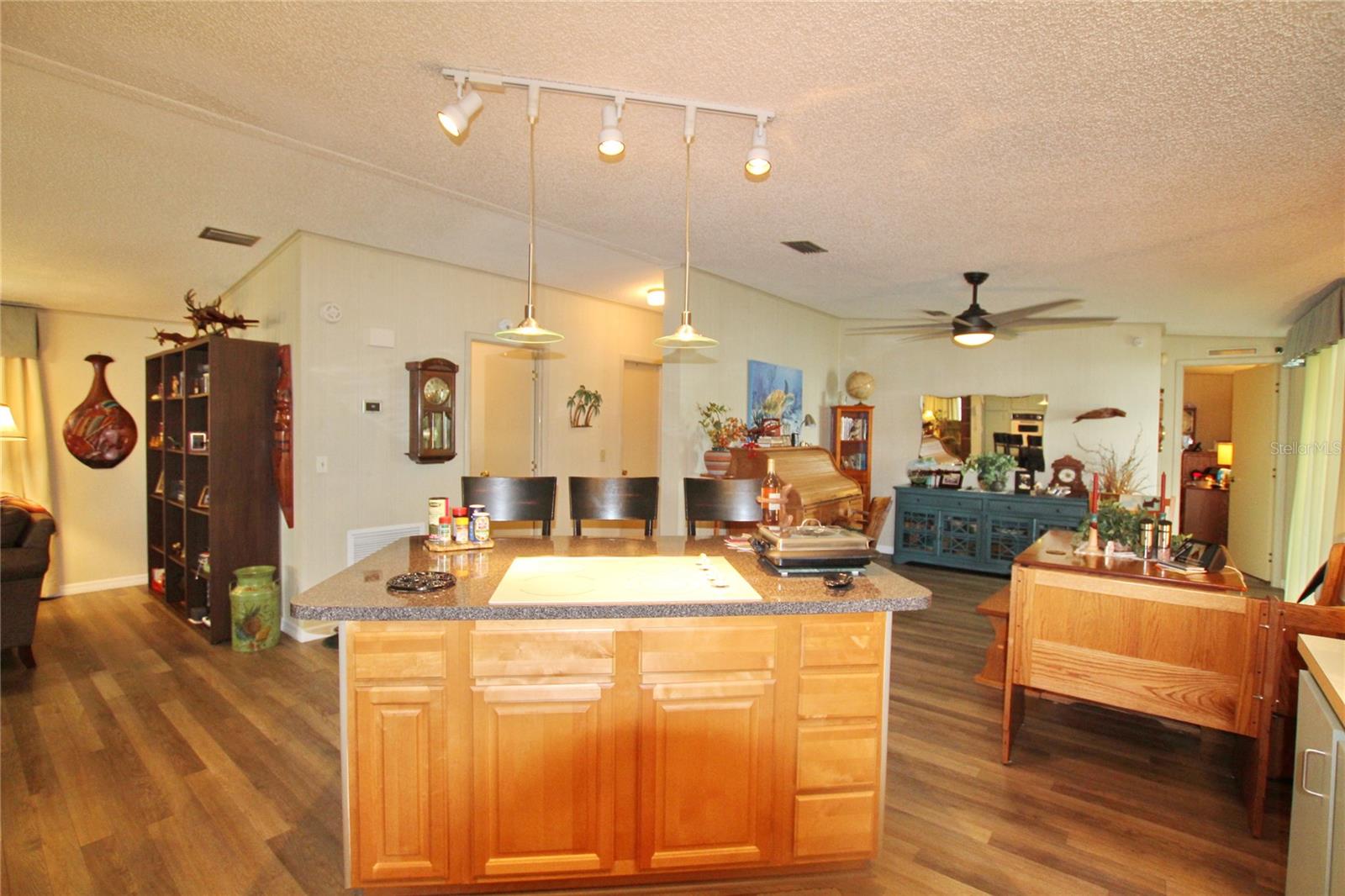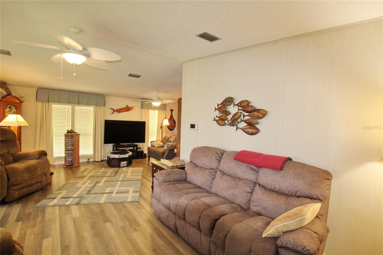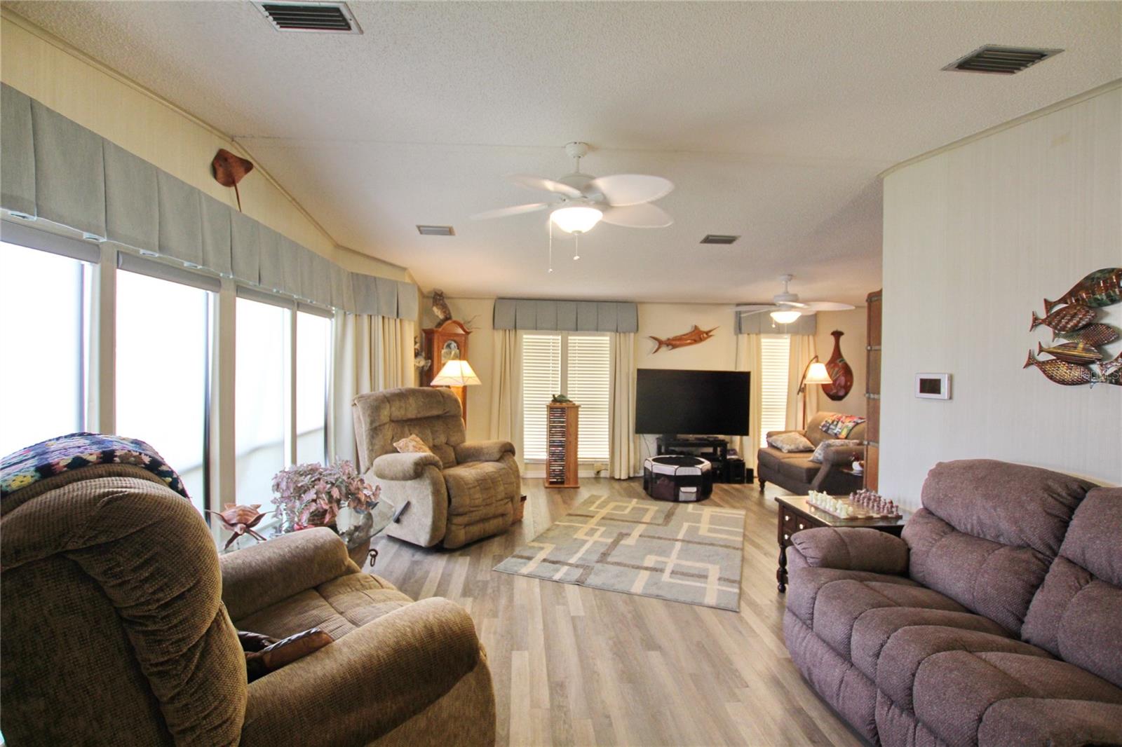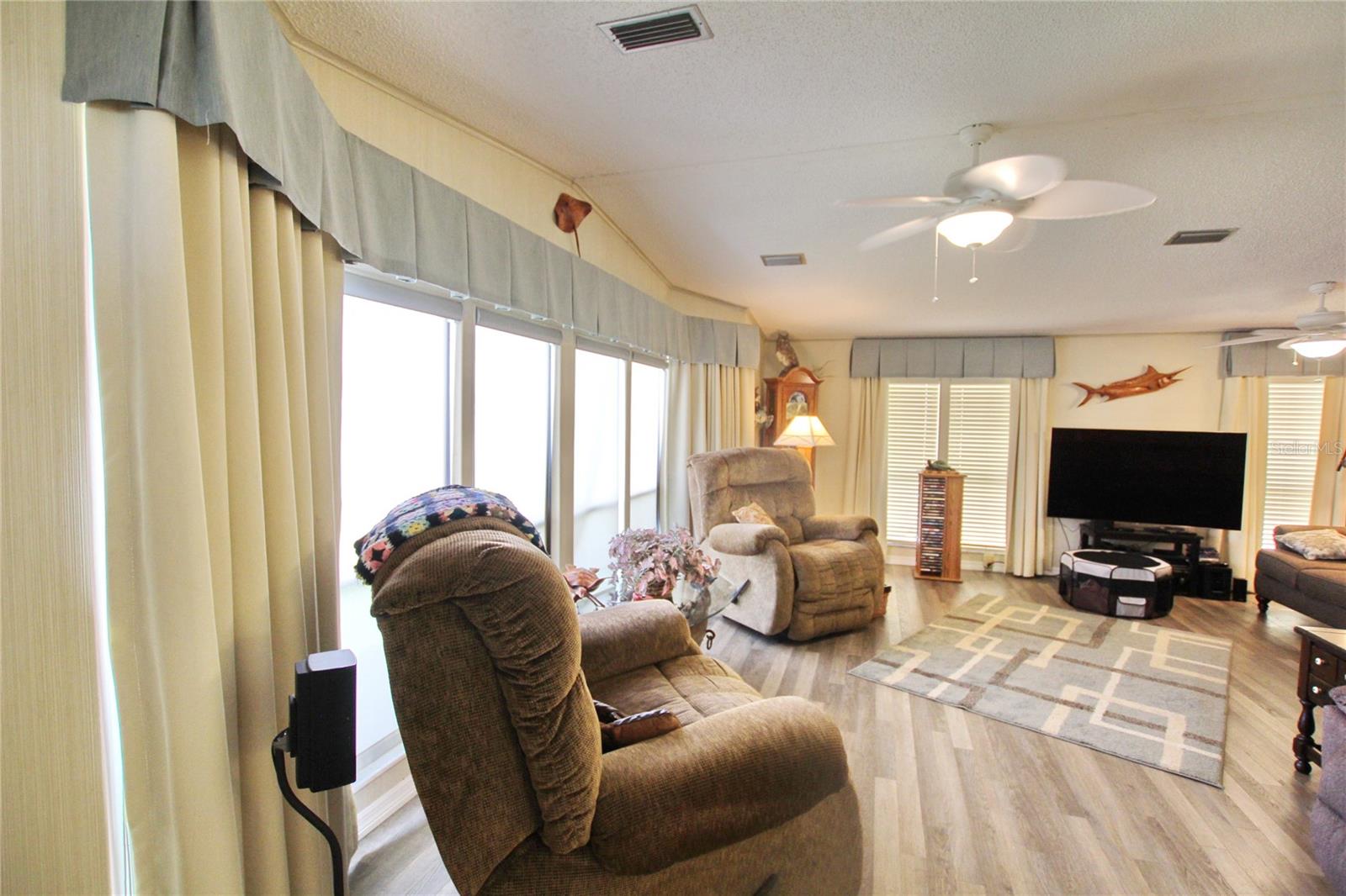 This description paints a picture of a well-maintained home in the Seminole Cove 55+ Active Community, offering a variety of recent updates and appealing features. Here’s a summary of the key selling points: Location & Views: Overlooks a lake with a floating dock and a bass boat (with trolling motor). Roof: 2013 metal roof with a 25-year warranty (Luviano Roofing), with all new screws added in 2023. Flooring: New vinyl waterproof flooring (2023) and carpet in the bedrooms. HVAC & Water: New 2023 Trane AC and a tankless water heater. Water Treatment: Included system for cleaner water. Interior Upgrades: All new baseboards (2023) Master and guest bathrooms' ceilings redone and painted (2023) Custom-made drapes in living room and both bedrooms. Living room features new electric synthetic blinds. 2015 master bathroom renovation. Exterior & Plumbing: 2023 driveway with pavers and patio. All plumbing replaced in 2023 with PVC and copper. Security: Equipped with a security system. These recent updates add significant value to the property, making it ideal for someone looking for a modern and comfortable home in an active community.