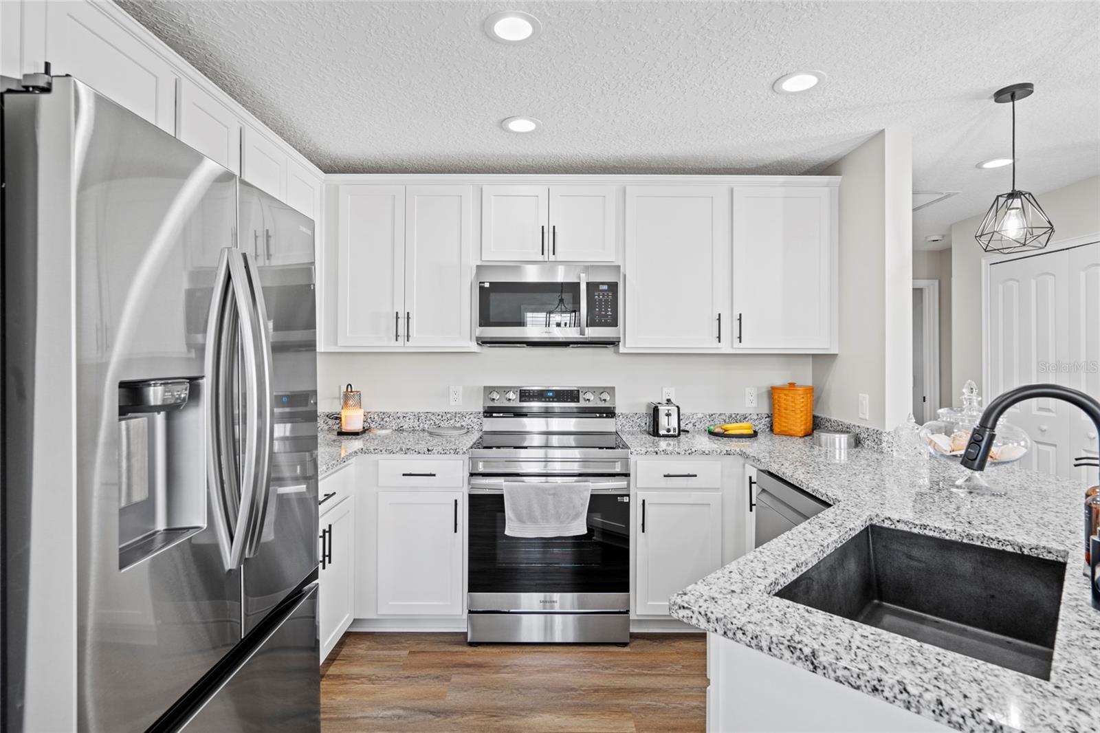 This beautifully appointed 3-bedroom, 2-bath residence with a 2-car garage sits on 1.25 acres and features a tranquil pond, offering both privacy and natural charm. With 2,141 total square feet and nearly 1,500 under air, the home showcases a stone-accented façade, durable laminate flooring throughout, and a cohesive blend of modern black fixtures for a sleek, contemporary aesthetic. The kitchen is outfitted with rich wood cabinetry, granite countertops, and stainless steel appliances, creating a functional and stylish culinary space. The expansive master suite includes dual sinks, wood cabinetry, a walk-in shower, and bold black hardware for a refined finish. Conveniently located just minutes from shopping and dining, this property combines comfort, style, and accessibility in a peaceful rural setting.
