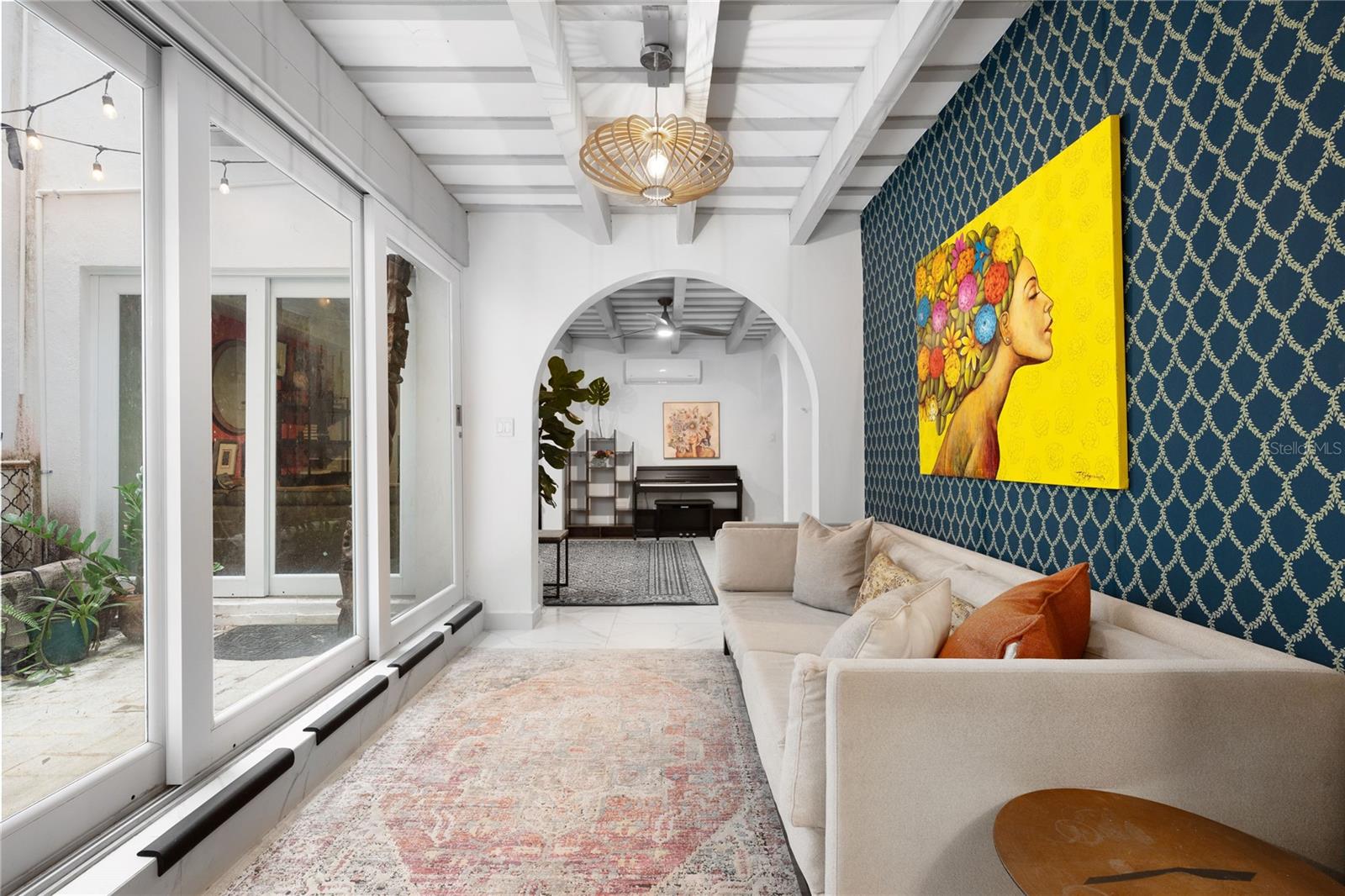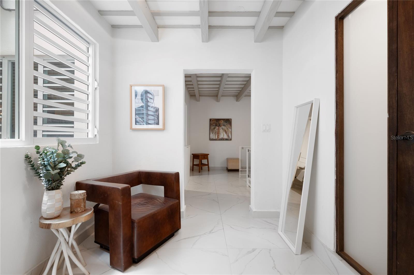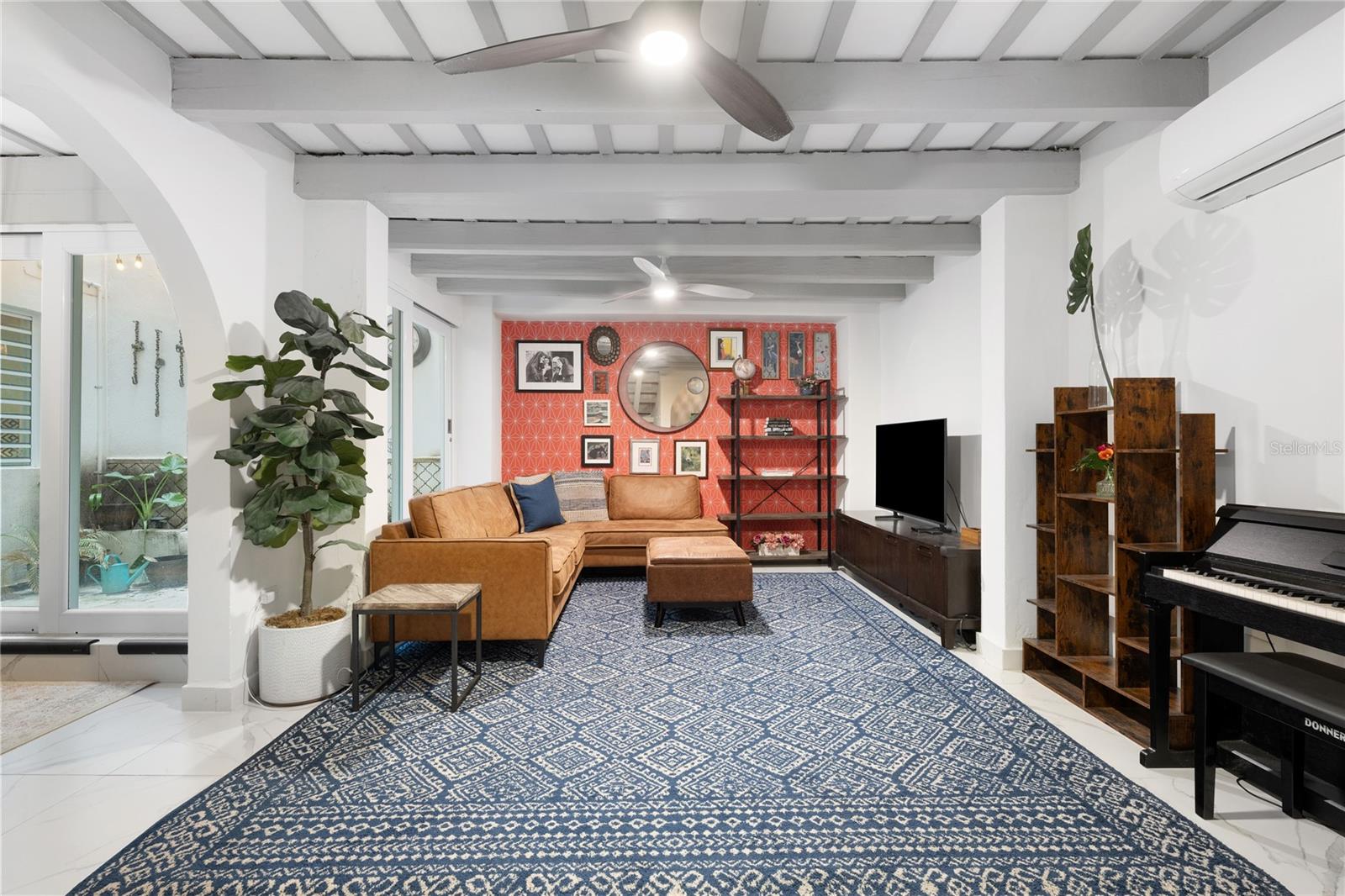 One or more photo(s) has been virtually staged. Set along Caleta de las Monjas—known to locals simply as La Caleta—this residence is anchored in one of Old San Juan’s most enchanting enclaves, where the city’s romance feels almost cinematic. The street is a narrow ribbon of smooth blue cobblestone, framed by beautifully painted Spanish Colonial façades and classic balconies that instantly evoke the sensation of stepping into a centuries-old coastal town. Just steps away, Plazuela de la Rogativa—widely considered the most breathtaking viewpoint in Old San Juan—unfolds above the bay with its canopy of trees, the historic city walls below, and the shimmering water beyond, in a scene so extraordinary it’s often chosen as a wedding setting. With only a limited number of residences along this exclusive stretch, opportunities here are exceptionally rare—making this not only a home, but a true Old San Juan acquisition. Set quietly in the interior of the building, the home enjoys a sense of privacy and calm—an unexpected retreat from the vibrant energy of the streets just beyond. At its center, a charming open-air courtyard brings natural sunlight into both levels, with the residence thoughtfully arranged around three sides of this private interior oasis. The result is bright, inviting, and refreshingly serene, with an effortless “townhouse” feel from the moment you arrive. Inside, the space has been tastefully updated with modern flooring, a sleek open kitchen that flows into the dining area, and two contemporary bathrooms featuring clean, polished finishes. Fully air-conditioned throughout, the home is elevated by curated lighting and an eclectic, worldly design aesthetic—layered, colorful, and sophisticated, offering a welcome alternative to the predictable all-white minimalism seen everywhere today. The open-air courtyard is a charming centerpiece—an intimate pocket of sky and light that invites effortless personalization, whether through curated greenery, a subtle water element, or ambient evening lighting. Ideal as a primary residence, a refined pied-à-terre, or an exceptional income-producing property, this home delivers what few Old San Juan addresses can: privacy, character, and the rare privilege of living just steps from the city’s most iconic and breathtaking setting—La Caleta and the unforgettable Plazuela de la Rogativa. NOTE: Interior courtyard photograph has been virtually staged.