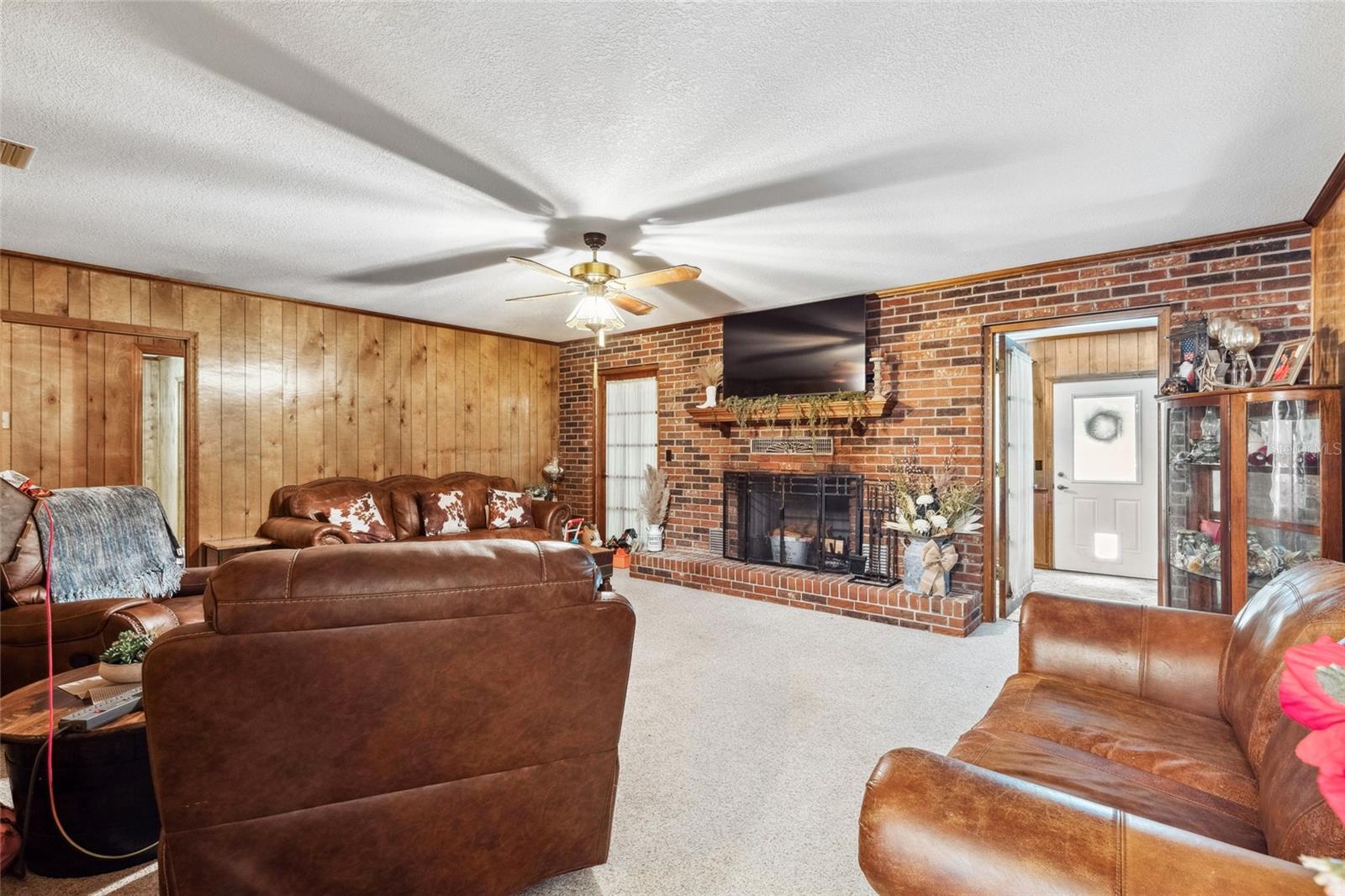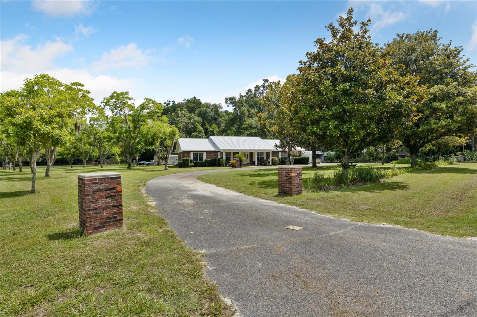 STATELY CRAFTSMAN HOME with Attached Garage on Paved Road with semi-circular drive that welcomes you to the front porch where there is plenty of sittin' room. This property exudes Southern Charm with its beautiful magnolias in the front yard of this well constructed brick home with a maintained metal roof and insulated windows. Upon entering the foyer, you can go right, into the formal dining room or left into the formal living room. From the dining room, you enter the large kitchen with a removable island that you can choose to leave or move. Plenty of cabinets are here for your storage needs, as well as a bar that seats accommodates 3 bar stools. The newer stainless appliances are only a few years old. At the end of the kitchen is a step down, breakfast nook with a bay window bringing in natural light and giving a full view into the fenced backyard where there is a new, above ground pool, that can stay or be taken down-buyer's choice! This split plan home boasts 2160 sf of living area and has 3 bedrooms and a full bathroom on the opposite end of the house from the Primary bedroom/bathroom. In addition to the living room, there is a great room with a brick fireplace as its focal point. Warm, wood paneling and wood details helps this home feel warm and welcoming. You can sit on the hearth in the winters and enjoy the warmth of the wood fire. And if this house doesn't already have enough options....there is also a multi-purpose room at the back of the house that could be used for crafts, a workout room, sun porch, playroom - it's a bonus! Not only is there an attached garage, there is also a 30x50 metal workshop with concrete with 12x10 roll up doors. It is like new as it has only been constructed within the last 6 months! With 2 ACRES and no deed restrictions, you can have a chicken coup, or other utility sheds. There is a lovely grove of 20 bearing pecan trees on one side of the property. The well pump was replaced with a new one June 2024. Conveniently located near the Old Town Elementary School and grocery, hardware store and gas station. Don't miss the opportunity to view this well-built home.