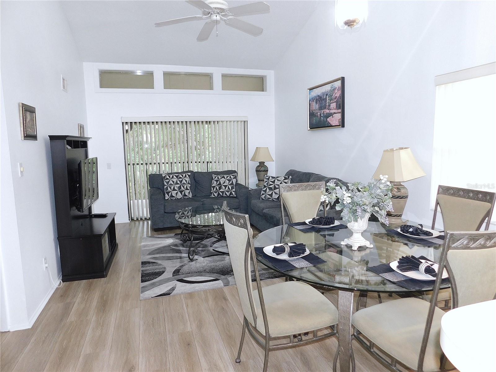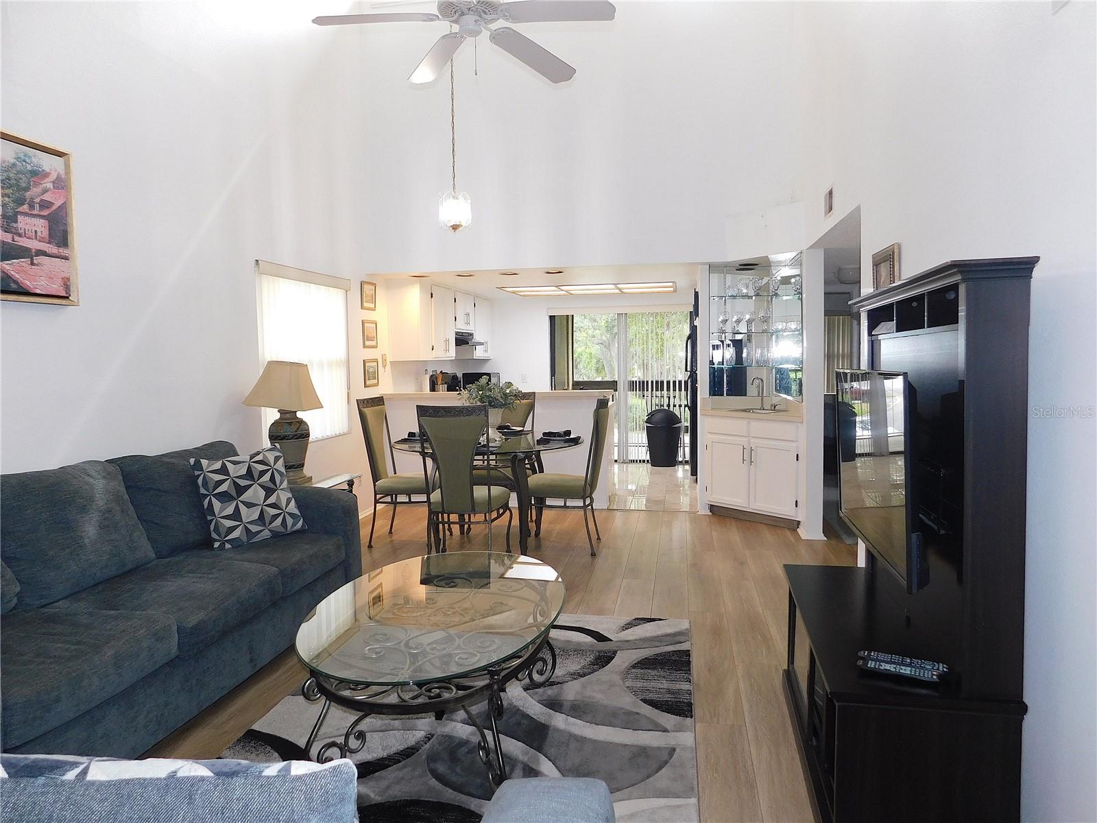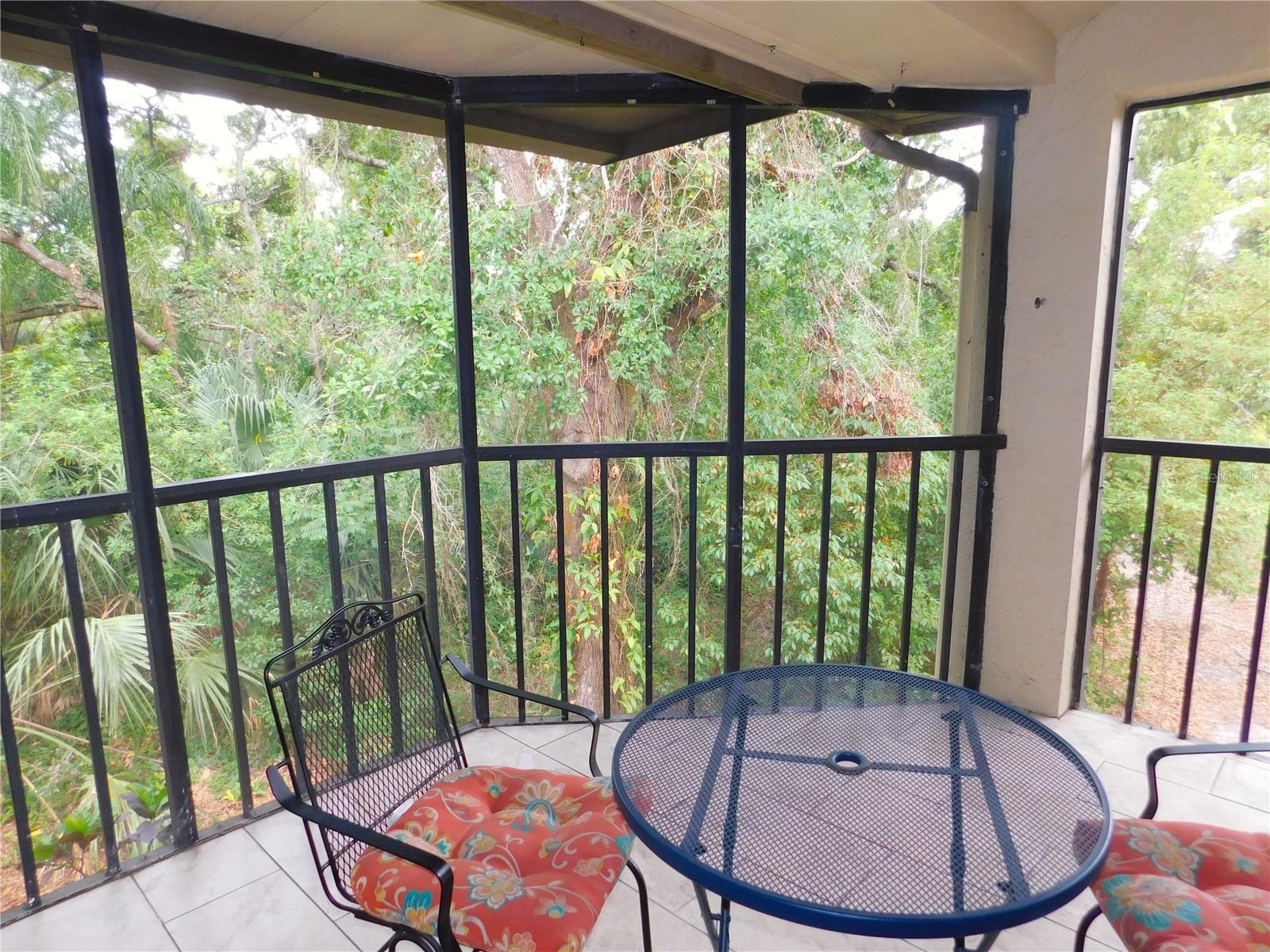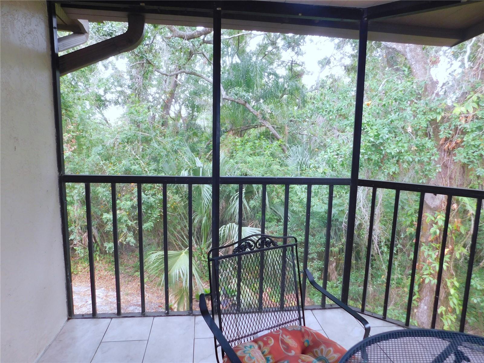 Come home every evening, relax on your screen enclosed oversized lanai overlooking your wooded lot backdrop and let the day's cares slip away! This second floor end unit condo with vaulted ceilings is waiting for you, well maintained condition and complete with all furnishings! Foyer entrance with hall closet takes you into the living/dining combination showcased with beautiful natural light from the clearview windows along the vaulted ceilings to the sliding glass doors on either end of the living space. The open floor design of the living area is met with a breakfast bar into the kitchen with sliders out to the screen enclosed lanai in the front of the condo where the washer & dryer are located in the utility closet. This condo offers a split bedroom plan. The primary suite gives you two closets, king size bed, sliders out to your private lanai and primary bathroom with tub/shower combination, oversized vanity and large linen closet. The guest bedroom also has sliders out to the front screen enclosed lanai, along with wall closet and twin (single) beds. The guest bath with another linen closet has a walk in shower. If you are ready to explore, the location of the condo is fantastic - starting with the nearby community heated pools (two of them) or visit/join Ardea Country Club that offers two 18 hole golf courses, their own pools, tennis, pickleball, fitness center, Clubhouse, restaurants and activities. Your condo is an easy commute to Westfield Countryside Mall, area shopping, various restaurants and entertainment plus the sandy beaches of Honeymoon Island along with local parks and walking trails for your low stress lifestyle. More dining and shopping in the surrounding downtown areas of Tarpon Springs, Dunedin and Safety Harbor. As a convenience to the sellers, the condo is being offered fully furnished and the condo is located in Woodlake Run area of the gated community of East Lake Woodlands Country Club. New a/c in 2023, new hw heater and dishwasher in 2024.
