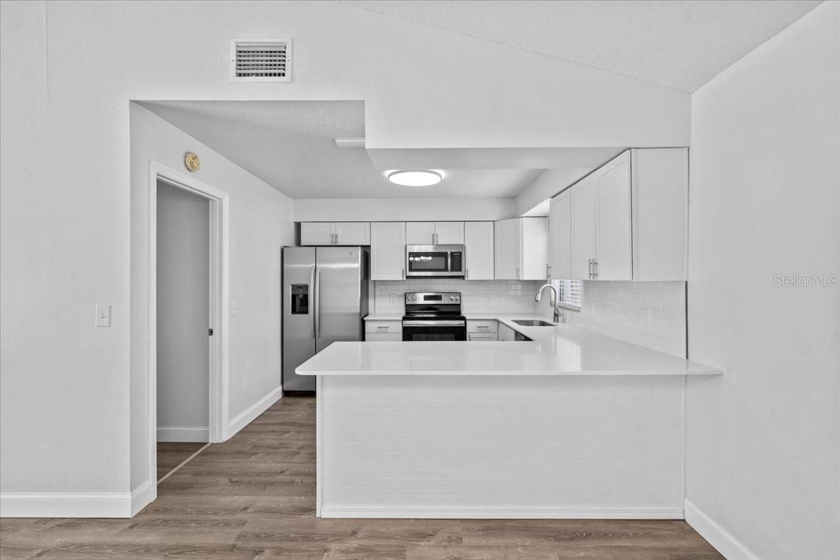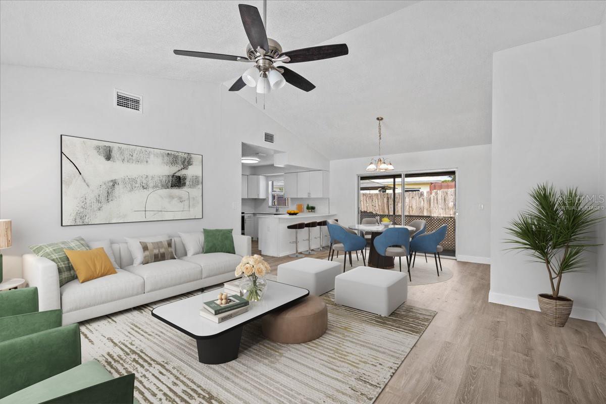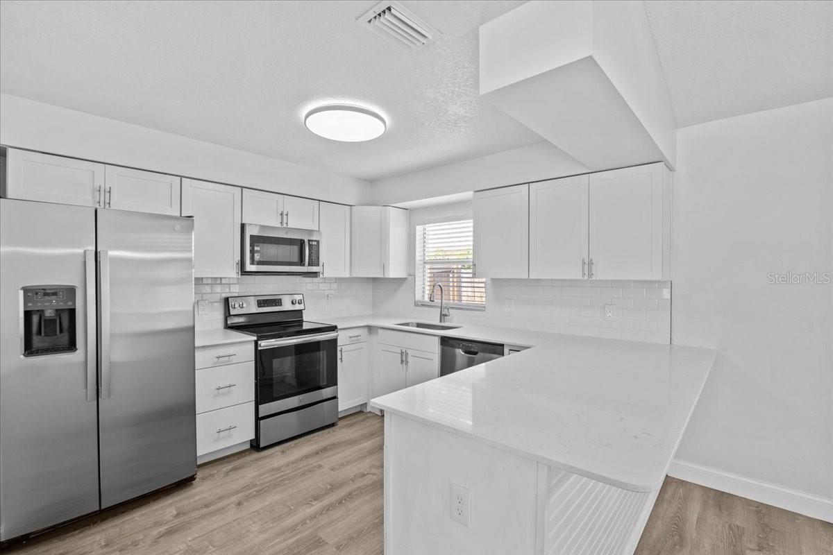 One or more photo(s) has been virtually staged. Price Improvement!!! Immaculately remodeled 3 bed 2 bath home located on a cul de sac street for added privacy in the heart of Oldsmar, FL. Step foot into this modern home greeted by beautiful vaulted ceiliings leading into the new quartz kitchen featuring a peninsula design with wood shaker cabinets, quartz countertops, tile backsplash and stainless steel appliances. New luxury vinyl plank flooring with updated baseboards throughout, new light fixtures, ceiling fans and a newer 2023 HVAC unit. Spacious primary bedroom, ensuite bathroom feauturing a split bedroom layout, indoor laundry with modern stackable washer and dryer included. Rear screen porch and a brick pavered back yard surrounded by a wood privacy fence. This home sits in a convenient location steps from Sheffield Park that features many amenities such as a hiking/running trail, tennis and basketball courts, playground and covered pavillion for events. Quick drive to new shopping centers, restaurants, downtown Tampa, international airport, clearwater beaches and St Pete! Turnkey home with NO HOA, NO hurricane damage and NO flood history. Easy to show, book your showing today!