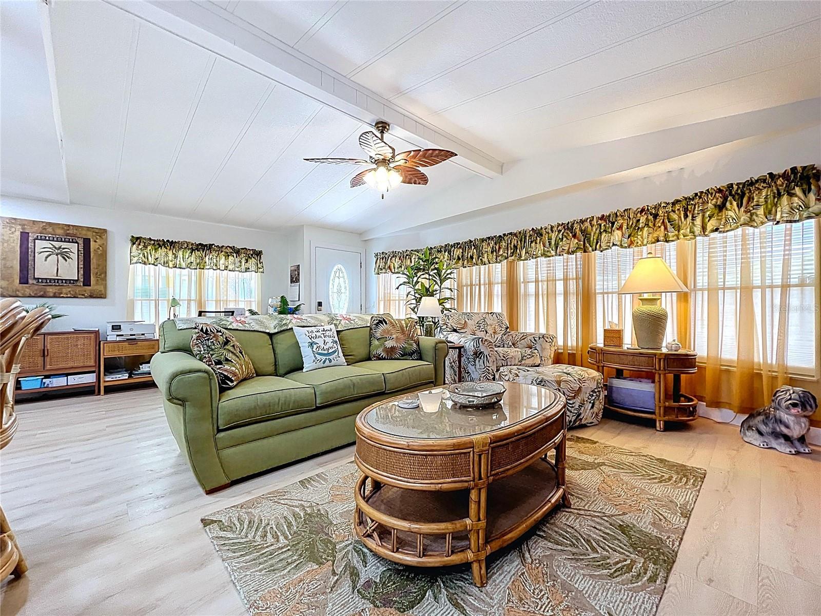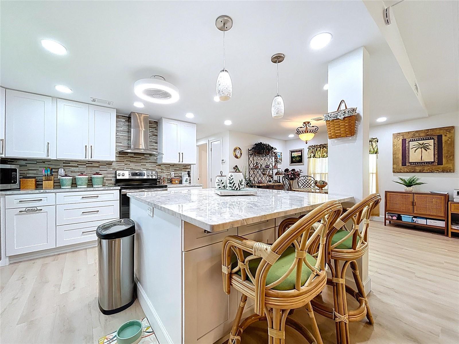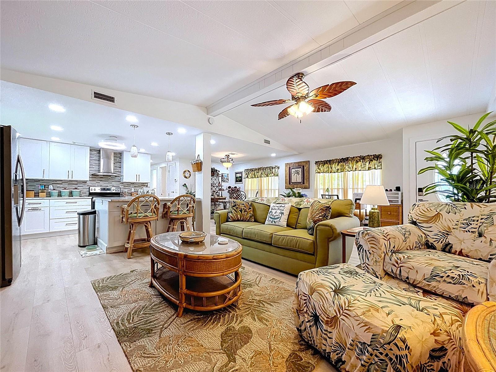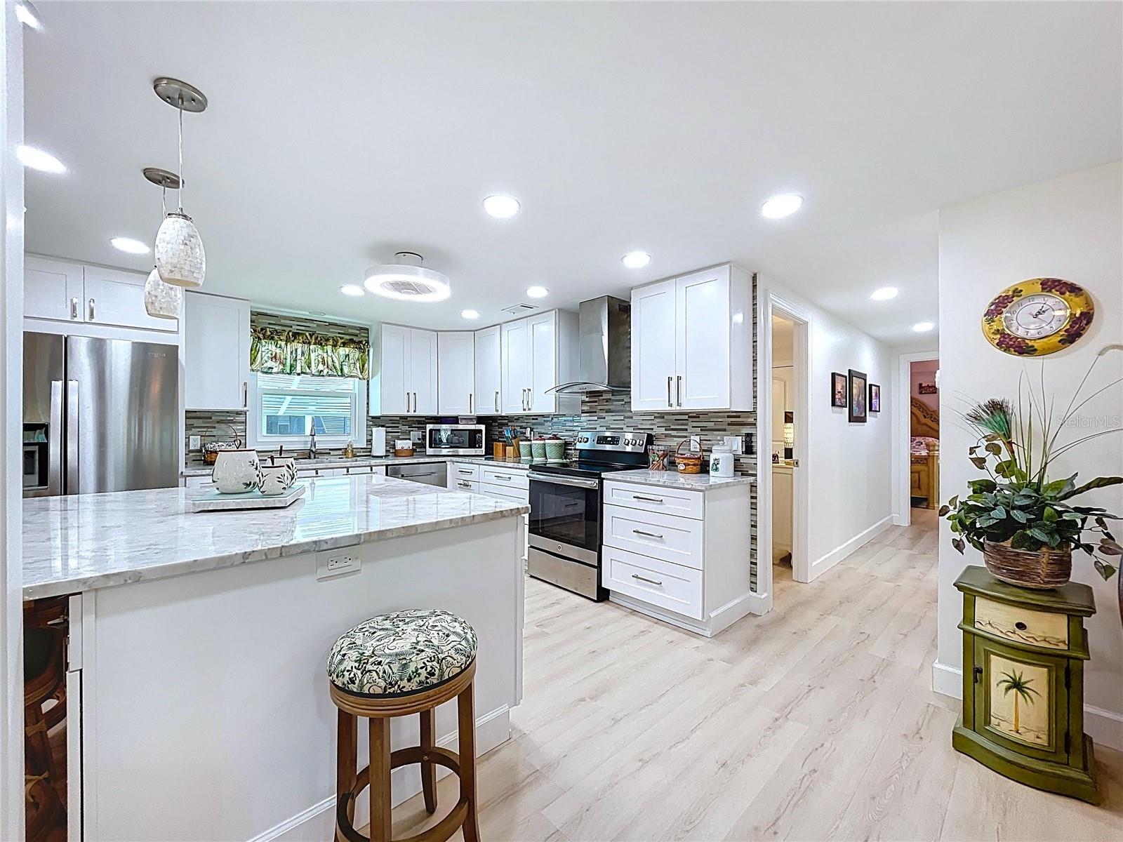 Beautifully renovated home in Gull Aire Village, a 55+ deed-restricted community where residents own their land and enjoy low HOA fees and an active social lifestyle. This move-in-ready home features a new electrical panel, tankless water heater, and new front and storm doors. Inside, enjoy LVP flooring throughout, fresh paint, new baseboards, and updated lighting. The living room has new drywall and 2-way blinds. The kitchen is fully redesigned with soft-close white shaker cabinets, Quartz counters, tile backsplash, new sink, fixtures, hood, and a large island with pendant lighting. Dining area features updated lighting and removed buffet for open flow. Laundry room has new doors, cabinets, and paint. Hallway bedroom offers new closet doors, fan, and blinds. Bathrooms boast tiled showers with multiple heads, Quartz vanities, lighted mirrors, updated toilets, and enlarged doorways. The primary suite includes a walk-in closet, sliding door, and upgraded bath with porcelain flooring. Enjoy the enclosed Florida room with mini split HVAC, fresh paint, and new fan. Close to shopping, beaches, dining, and cultural events in the heart of Oldsmar! Seller spared no expenses in this lovely renovated home
