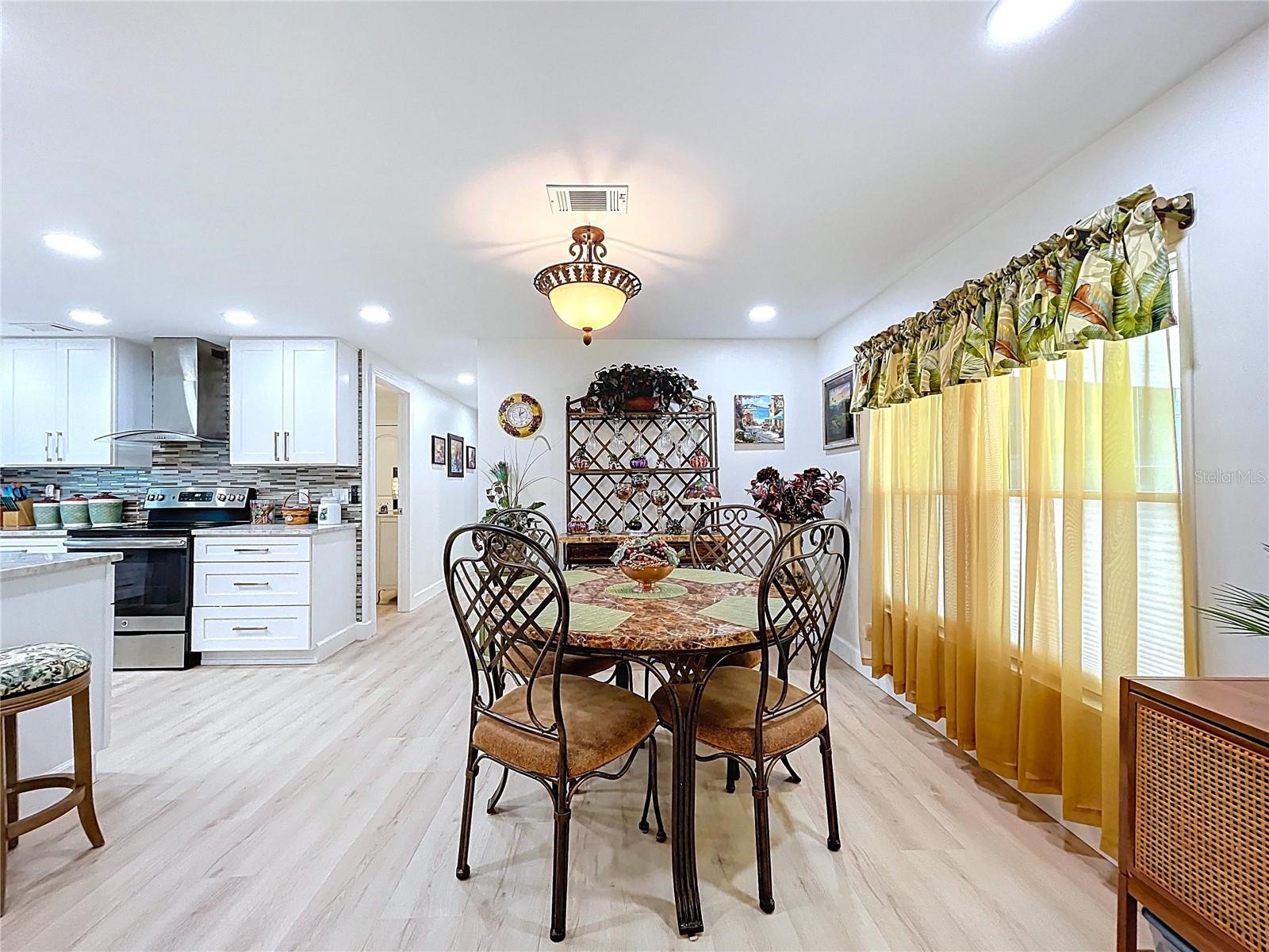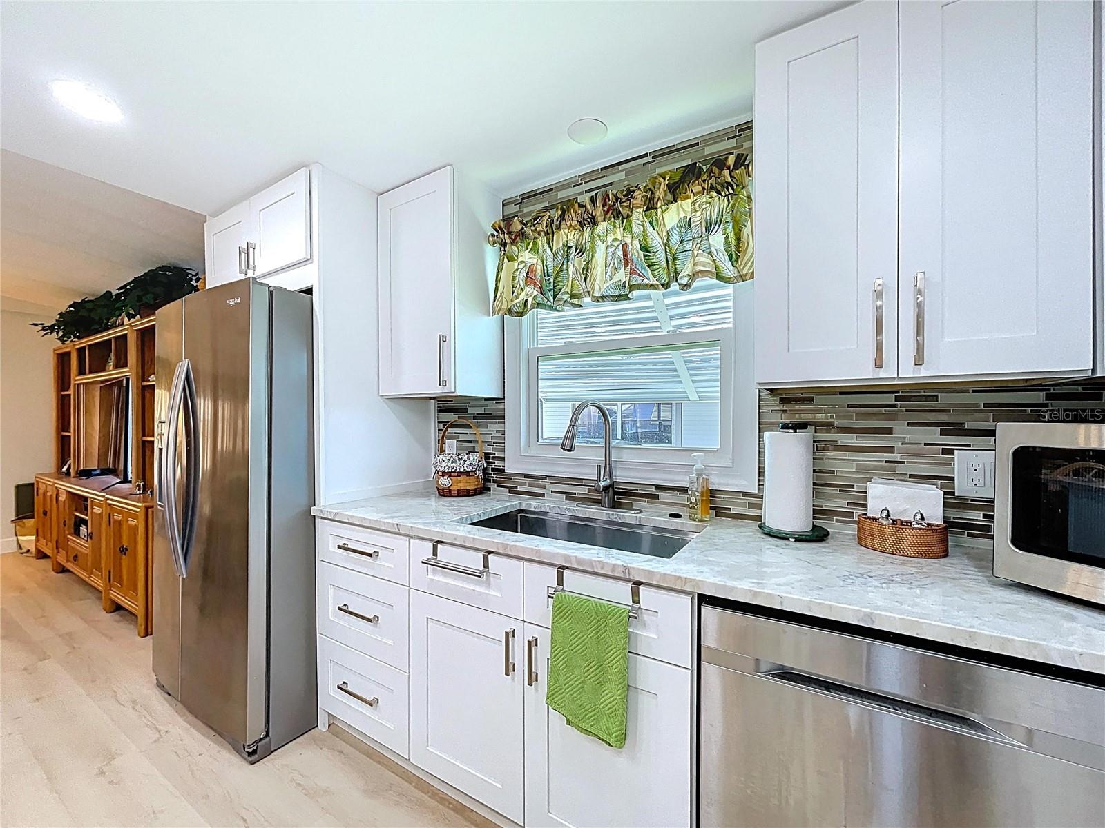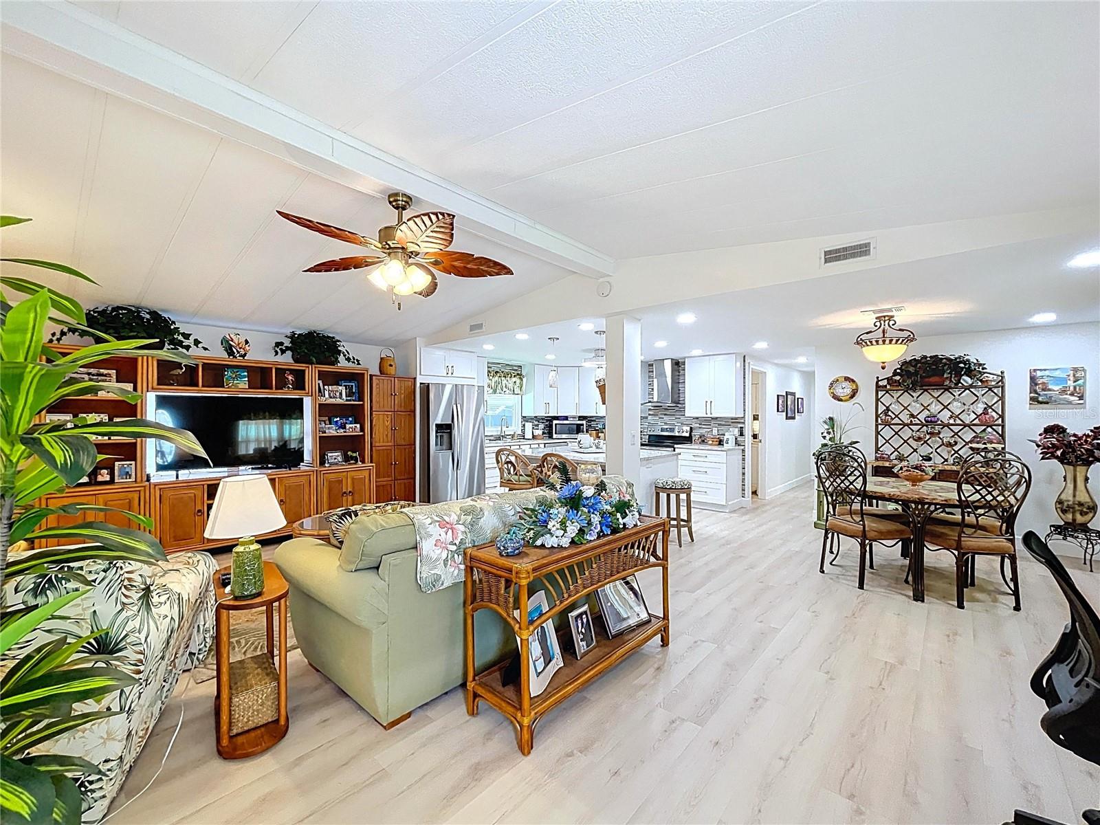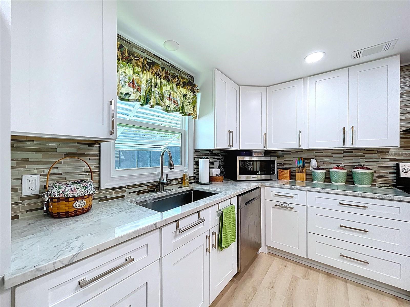 Beautifully renovated home in Gull Aire Village, a 55+ deed-restricted community where residents own their land and enjoy low HOA fees and an active social lifestyle. This move-in-ready home features a new electrical panel, tankless water heater, and new front and storm doors. Inside, enjoy LVP flooring throughout, fresh paint, new baseboards, and updated lighting. The living room has new drywall and 2-way blinds. The kitchen is fully redesigned with soft-close white shaker cabinets, Quartz counters, tile backsplash, new sink, fixtures, hood, and a large island with pendant lighting. Dining area features updated lighting and removed buffet for open flow. Laundry room has new doors, cabinets, and paint. Hallway bedroom offers new closet doors, fan, and blinds. Bathrooms boast tiled showers with multiple heads, Quartz vanities, lighted mirrors, updated toilets, and enlarged doorways. The primary suite includes a walk-in closet, sliding door, and upgraded bath with porcelain flooring. Enjoy the enclosed Florida room with mini split HVAC, fresh paint, and new fan. Close to shopping, beaches, dining, and cultural events in the heart of Oldsmar! Seller spared no expenses in this lovely renovated home
