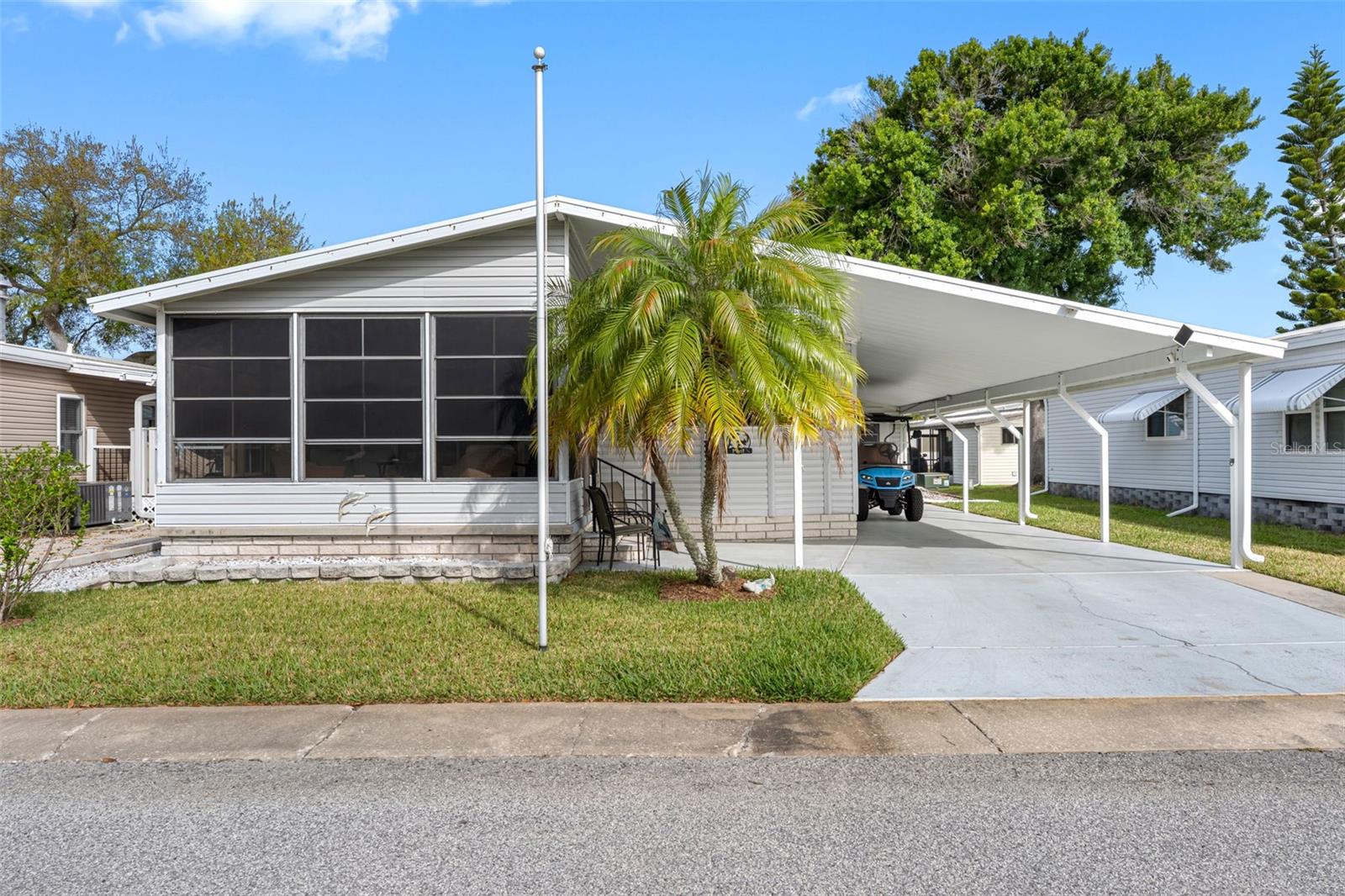 Welcome to this spacious, updated and well-maintained 1992 home offering comfortable living in the peaceful, friendly, desirable 55+ Gull-Aire Village community. Step inside to a bright and inviting living room and dining area, highlighted by abundant windows and soaring cathedral ceilings that create a wonderful sense of openness. The home features newer luxury vinyl plank flooring throughout for a clean, modern look. An updated kitchen with ample cabinets and counters provides the perfect space for those that love to cook and entertain. The large guest bedroom and primary suite make this home easy to live in and comfortable for guests. A large, screened lanai—complete with vinyl windows, updated LVP flooring, and its own window A/C unit—provides the perfect spot for morning coffee or evening relaxation. A convenient utility room offers ample storage for bikes, tools, and outdoor gear. New LG ThinQ washer and dryer (2024) in the indoor entrance-way laundry room add value and comfort to this home. Recent upgrades include luxury vinyl floors, subfloor, vapor barrier (2023), AC (2023), water heater (2023), re-piped (2023), fresh paint (2023), appliances (2023), kitchen sink (2025), and a new roof-over and sky lights (2022) and new carport (2022), ensuring peace of mind for years to come. Gull-Aire Village residents enjoy exceptional amenities, including a vibrant clubhouse, library, billiards, shuffleboard, bocce ball, and a large, heated pool and spa. If you like to bicycle, run or walk, the Oldsmar Trail is a very short walk away where you can get your steps in alongside the Tarpon Lake Canal. This golf-cart-friendly neighborhood offers a full calendar of activities, fostering an active and welcoming lifestyle. With an HOA fee of only $70/month, the value is unbeatable. Pet owners will appreciate that one pet of any size is welcome. Best of all, in this community, you own the land that your home resides on. Convenience is unmatched: located directly across from AMC Theatres, Beall’s, Marshall’s, PetSmart, Dollar Store and a wide variety of restaurants including Craft Street Kitchen, Country Pizza Italian Grill and many more. Essential shopping and services such as Super Walmart, Publix, and Countryside Hospital are just minutes away. Easy access to the Gulf beaches, Tampa and St. Pete airports, local sports venues, and vibrant downtown areas makes this an ideal central location. If you are interested in simply unpacking your clothes and getting started with your fun in the sun, furniture and home essentials are negotiable, as well as the lithium battery golf cart. Start living your Florida lifestyle dream today in this affordable and charming piece of paradise.
