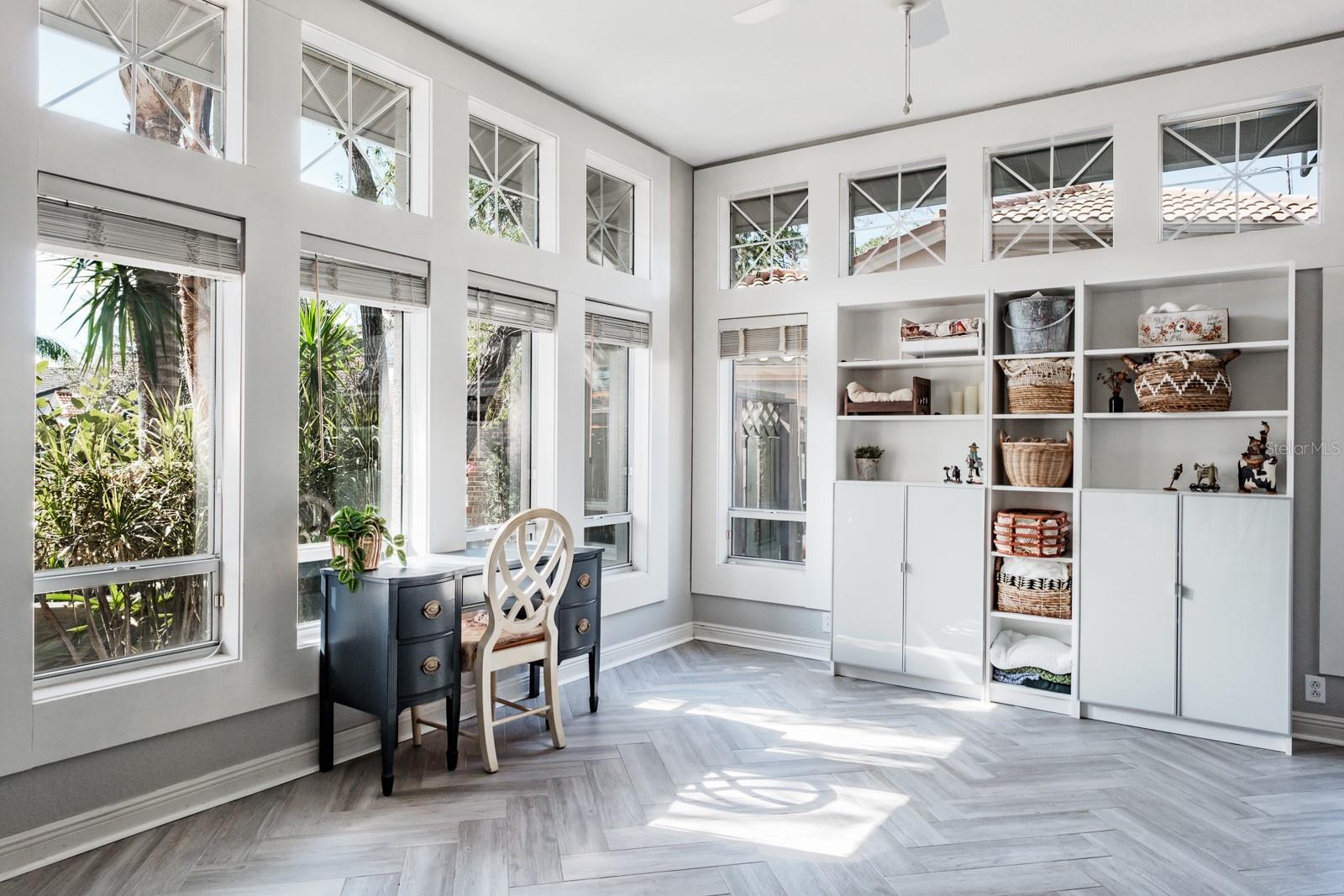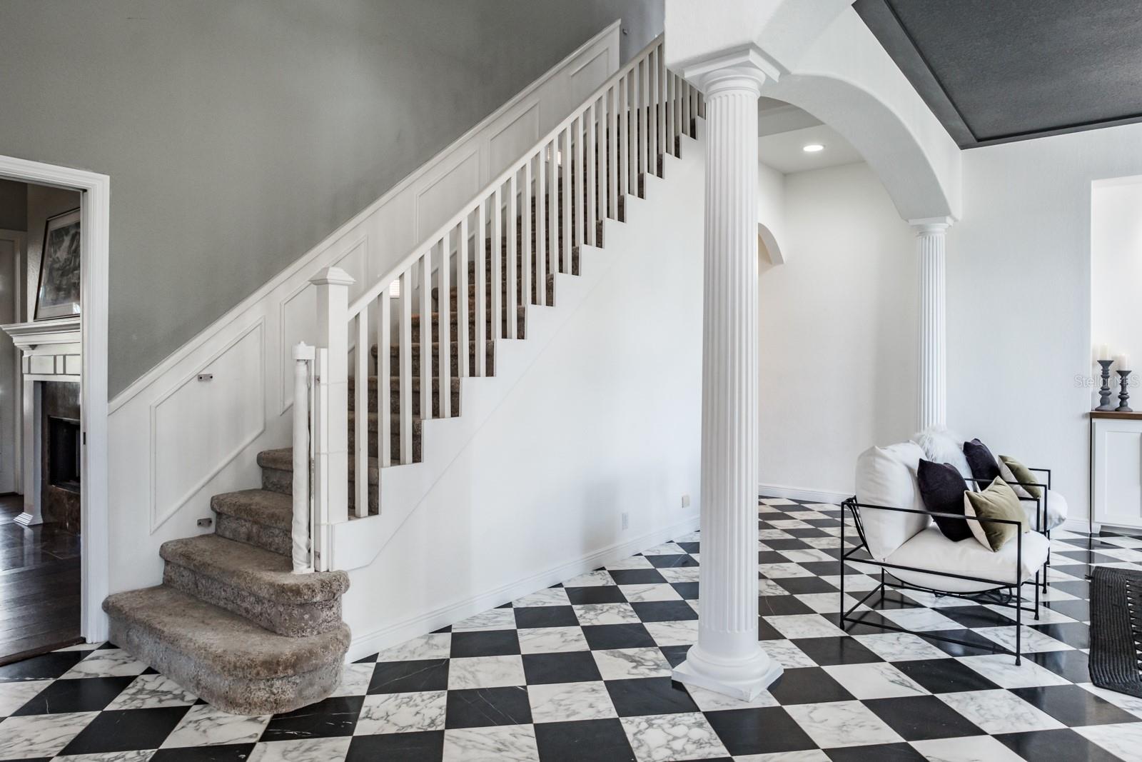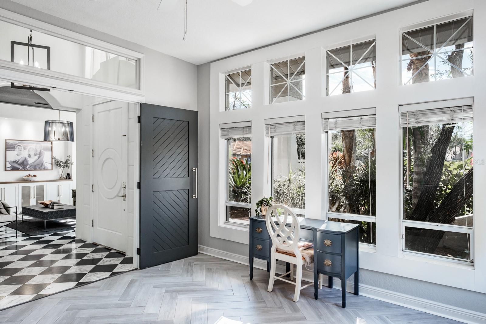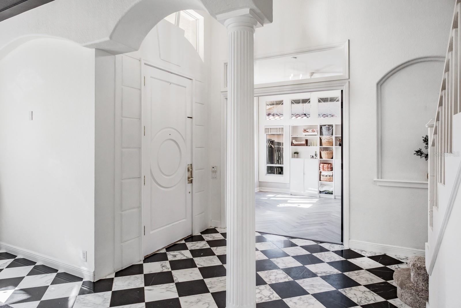Exquisite Estate Home in the Prestigious Aberdeen Enclave of East Lake Woodlands...Located within the highly sought-after, gated community of East Lake Woodlands and the exclusive Aberdeen enclave, this beautifully appointed residence offers refined living in one of the area’s most desirable neighborhoods. Positioned on an oversized 0.33-acre cul-de-sac lot, this approximately 3,300-square-foot home blends timeless elegance, quality craftsmanship, and thoughtful design. The home welcomes you with a dramatic two-story foyer featuring a sweeping volute staircase with wood spindles. Elegant black and white Carrera marble harlequin tile flooring enhances the entry and formal dining room, while rich 8-inch distressed hickory flooring flows through the kitchen and family room. The spacious layout offers 4 bedrooms plus a dedicated study/den, 3 full bathrooms, and 1 half bath. Oversized upstairs bedrooms provide comfortable accommodations for family and guests. For added protection and efficiency, the home also features 12 newly installed impact windows across the front of the home and in all three upstairs bedrooms, providing enhanced storm protection, energy efficiency, and peace of mind. At the center of the home is a gourmet kitchen designed for both everyday living and entertaining. Features include granite countertops, a solid wood center island, custom Ash wood cabinetry, stainless steel appliances, and a Monogram four-burner gas range with griddle and vent hood. A large walk-in pantry and counter-height breakfast bar add convenience, while a stylish built-in mini bar with a wine cooler enhances the home’s entertaining appeal. A two-sided gas fireplace connects the kitchen and family room, creating a warm and inviting atmosphere. The luxurious primary suite serves as a private retreat with sliding doors opening to the patio. A grand gas fireplace with a custom mantel adds character, while the spa-inspired bathroom features dual vanities, a private water closet, a walk-in shower with dual showerheads, and a stunning clawfoot soaking tub positioned in a bay window beneath a chandelier. Expansive walk-in closets with custom built-ins complete the suite. Outdoor living is equally impressive. The backyard showcases an oversized pool with automation, solar heating, and a spillover spa with optional propane heating. Travertine pavers surround the pool area, and the covered screened patio provides multiple seating and entertaining spaces. Mature landscaping and decorative accent planters create a private resort-style setting. The irrigation system utilizes reclaimed water. Additional highlights include a barrel tile roof (2013), brick-paver driveway, oversized three-car garage, large laundry and mudroom, updated HVAC systems with UV lights (2016 and 2019), a water softener system, and a 100-gallon propane tank serving the pool, spa, and range. Most solar panels have been replaced within the past four years, and the exterior was freshly painted in 2017. This exceptional property offers a rare combination of elegance, space, and modern updates in a premier gated community. Conveniently located near top-rated schools, golf, shopping, and dining, it provides the ideal setting for both everyday living and entertaining. Schedule your private showing and experience everything this remarkable East Lake Woodlands home has to offer.