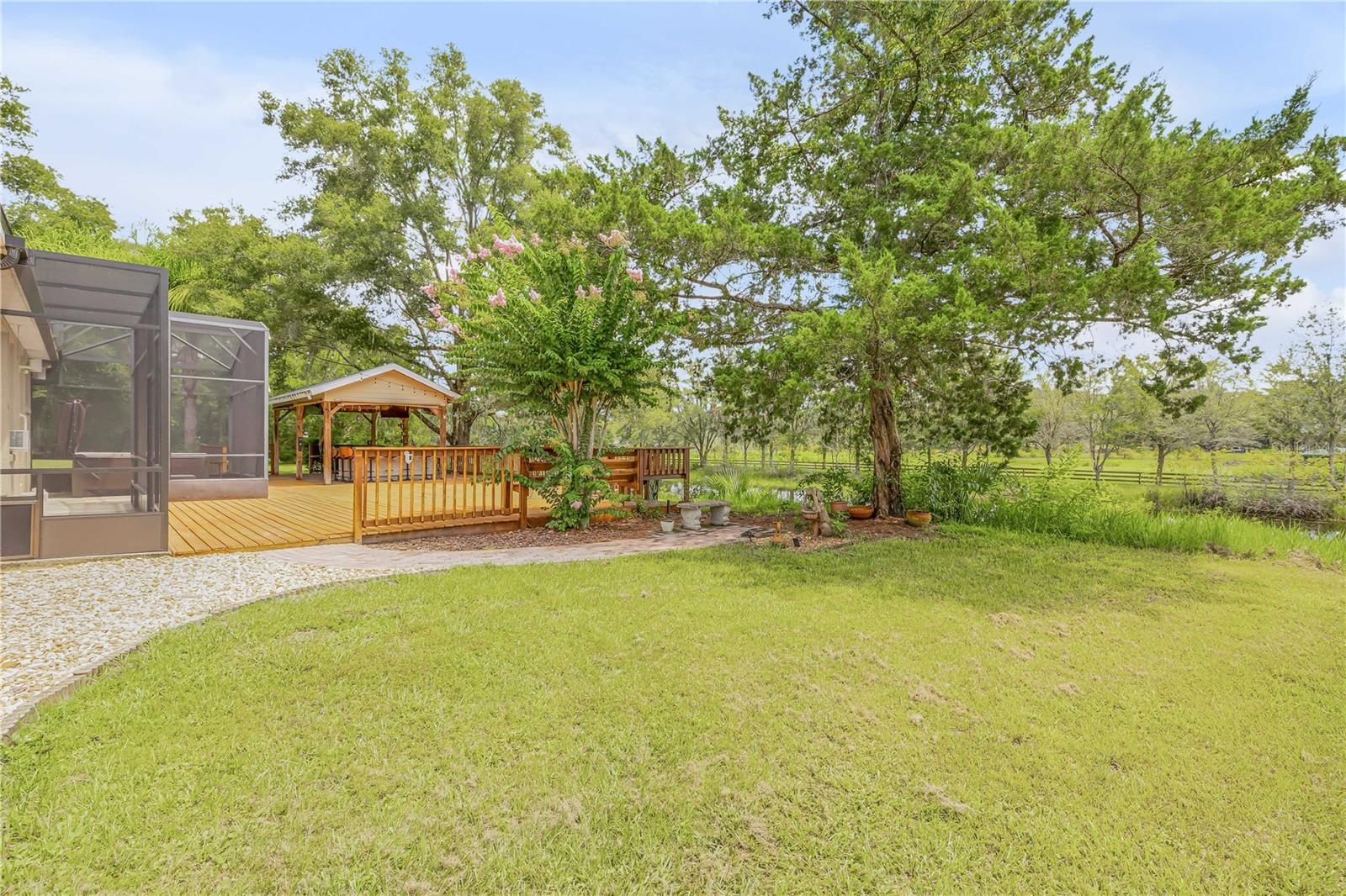 Welcome to your dream home, nestled on a private 3.5-acre lot with breathtaking water views. Imagine waking up every day to the tranquility of nature, while still enjoying the convenience of being just minutes away from the vibrant heart of downtown DeLand. This stunning residence offers a perfect blend of privacy and accessibility, catering to those who value seclusion without sacrificing proximity to city amenities. As you enter, you're greeted by a light-filled, open floor plan with soaring ceilings that make the space feel even more expansive. The formal living room and family room provide ample space for both intimate gatherings and lively get-togethers. The large, open kitchen flows seamlessly into a versatile dining/flex room, making it ideal for both casual family meals and elegant dinner parties. Each of the three spacious bedrooms is designed with comfort and storage in mind, while the primary suite features a luxurious screened-in hot tub, offering a private retreat within your own home. Step outside to your expansive deck, complete with a covered patio and bar – the perfect setting for entertaining friends and family while enjoying the pond views. This property is equipped with a well and septic system, including a salt system water softener, ensuring low utility bills and superior water quality. The roof is less than one year old, adding to the home's excellent maintenance record. This property offers the rare combination of a secluded, tucked-away location with easy access to city conveniences. Don't miss out on this exceptional opportunity to embrace a lifestyle of peace, privacy, and modern convenience. Schedule a private tour today and take the first step toward making this your new home. Your serene oasis awaits – call now to experience it for yourself! Don't miss the 3D walk through tour online.