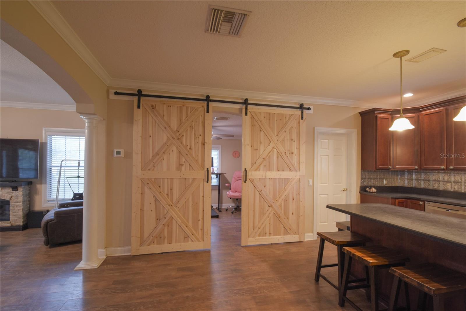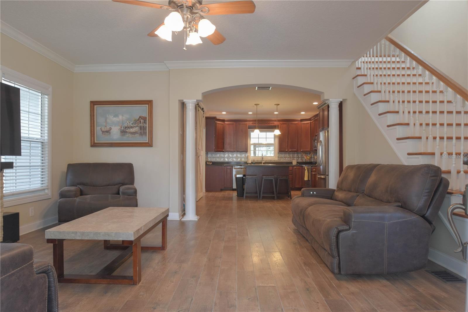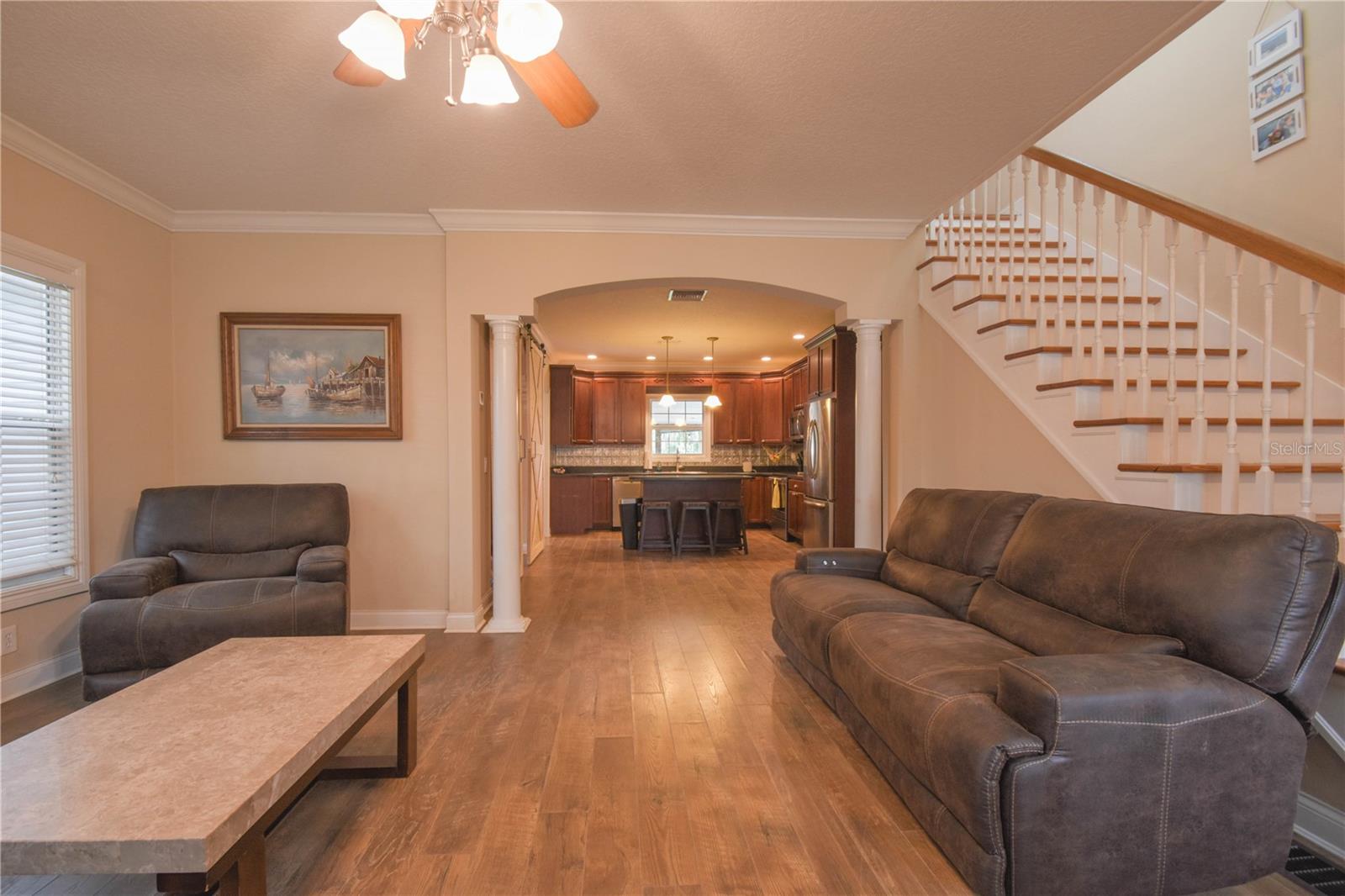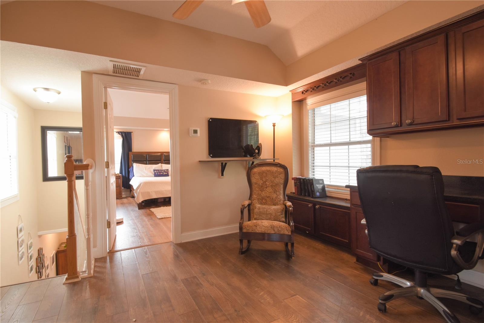 Amazing opportunity in HISTORIC ORANGE CITY! Check out this charming, Craftsman Style, two-story beauty sitting on 0.76 acres! This home features 3 bedrooms and 2 full bathrooms, an office loft, plus a bonus room! Upon entry you will be amazed at the space and layout. Downstairs features laminate wood floors, a large family room, bonus room with sliding barn doors (prior formal dining room), two secondary bedrooms, and a full bathroom. The kitchen features solid wood cabinets, a large island with breakfast bar seating, and stainless appliances. Just off the kitchen you'll find the utility room with laundry and extra storage. Upstairs is entirely dedicated to the Primary/Master Suite. At the top of the stairs landing you'll find a built in desk - perfect for a home office, a large walk-in closet, Primary/Master bathroom, and the huge Primary/Master bedroom. NEW HVAC 2025! Fully fenced back yard - vinyl fence installed 2021. WALK to Veterans Memorial Park and Mill Lake Park to enjoy amazing events sponsored by Orange City, such as Movies in the Park, Food Truck Fridays, and many holiday events! Located just 3.2 miles from Blue Springs State Park, this home is ideally located to enjoy Central Florida to the fullest!