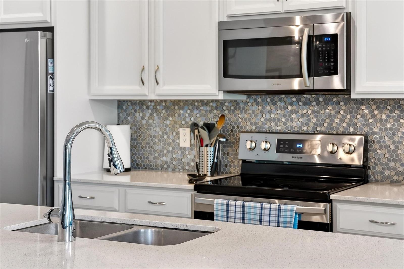 JUST APPRAISED - WELCOME TO YOUR NEW HOME IN THE TRANQUIL COMMUNITY OF COMPASS LANDING! This must-see home, built in 2021, offers 3 bedrooms and 2 bathrooms and has been meticulously maintained. Step inside to an open, bright floor plan with wood plank tile flooring throughout—for easy upkeep and a modern look. The kitchen is a chef’s dream, featuring staggered upper cabinets with crown molding, ample storage, a large island with sink and breakfast bar, and quartz countertops. Stainless steel appliances are included. The utility room off the kitchen includes a sink, custom cabinetry, and newer washer and dryer. The spacious primary suite features a large walk-in closet with custom shelving and a bathroom with double sinks and a frameless glass shower enclosure. Additional highlights include a 2-car garage and a fully vinyl fenced backyard with two 5-foot gates. Ceiling fans, a 16 SEER A/C system, double-pane windows, and energy-efficient solar panels help reduce electricity costs. Enjoy outdoor living under the covered lanai with extended brick pavers—perfect for relaxing or entertaining. The neighborhood features a central park and playground and is conveniently located near local schools within walking distance. Blue Spring State Park is just a short drive. With easy access to I-4 and AdventHealth Fish Memorial Hospital, commuting, shopping, dining, and beaches are a breeze. A nearby Sun Rail station adds convenience. Don’t miss this move-in-ready home!