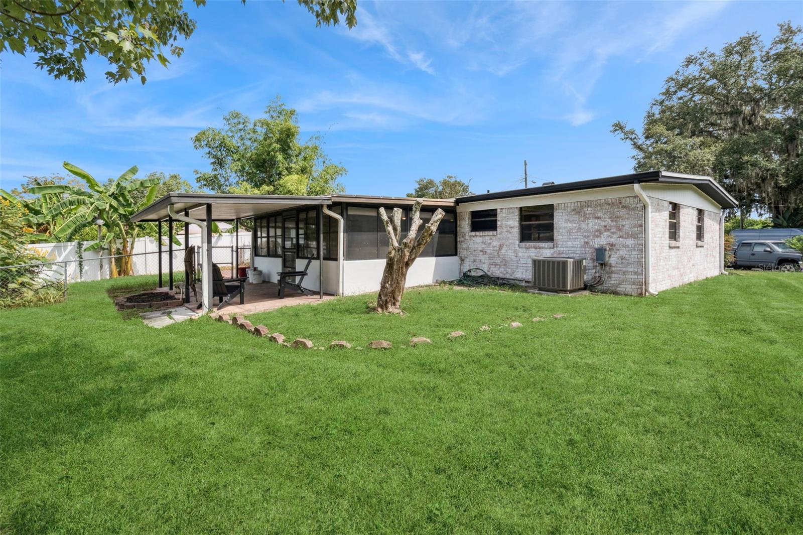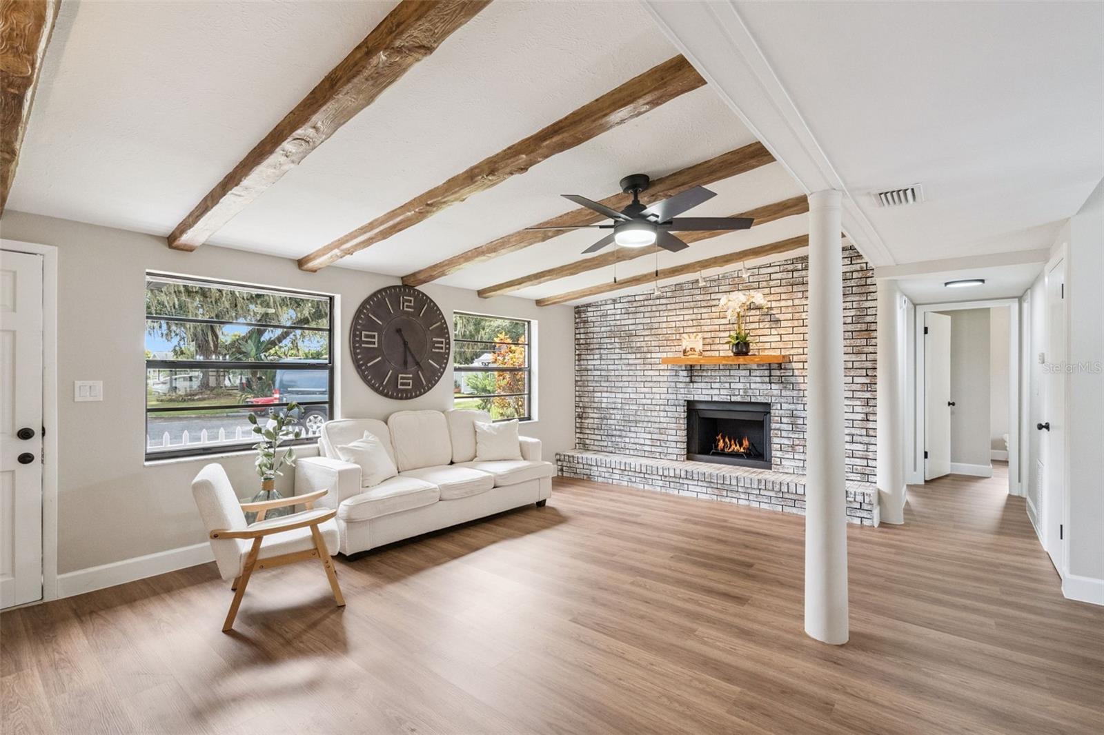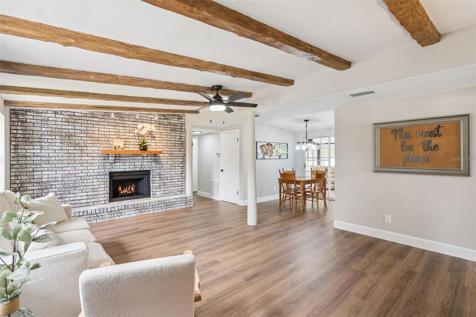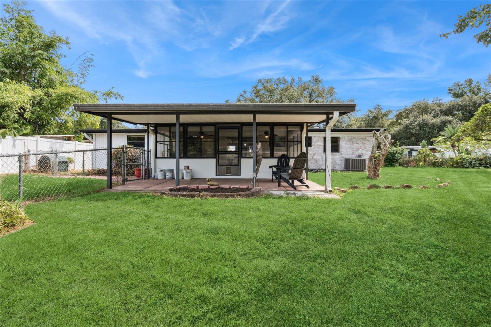One or more photo(s) has been virtually staged. Embrace the charm of this Mid-Century Modern home that features 3 bedrooms and 1 and a half bathrooms. With a new roof installed in 2025 and numerous updates, this inviting space welcomes you. Step into the living room, where a striking floor-to-ceiling fireplace and decorative ceiling beams create a warm atmosphere. The kitchen shines with new solid surface countertops and brand new stainless steel appliances (to be delivered soon), set to elevate your culinary experiences. The spacious primary bedroom offers a peaceful retreat, while the split floor plan ensures privacy throughout the home. At the back, the bright Florida room invites you to unwind or entertain in comfort. The generously sized laundry room provides versatility for an office or craft space, catering to your creativity. Nestled on an oversized lot in a cul-de-sac, this property provides abundant outdoor space and two storage sheds for your needs. This home is a remarkable opportunity—schedule a showing today!