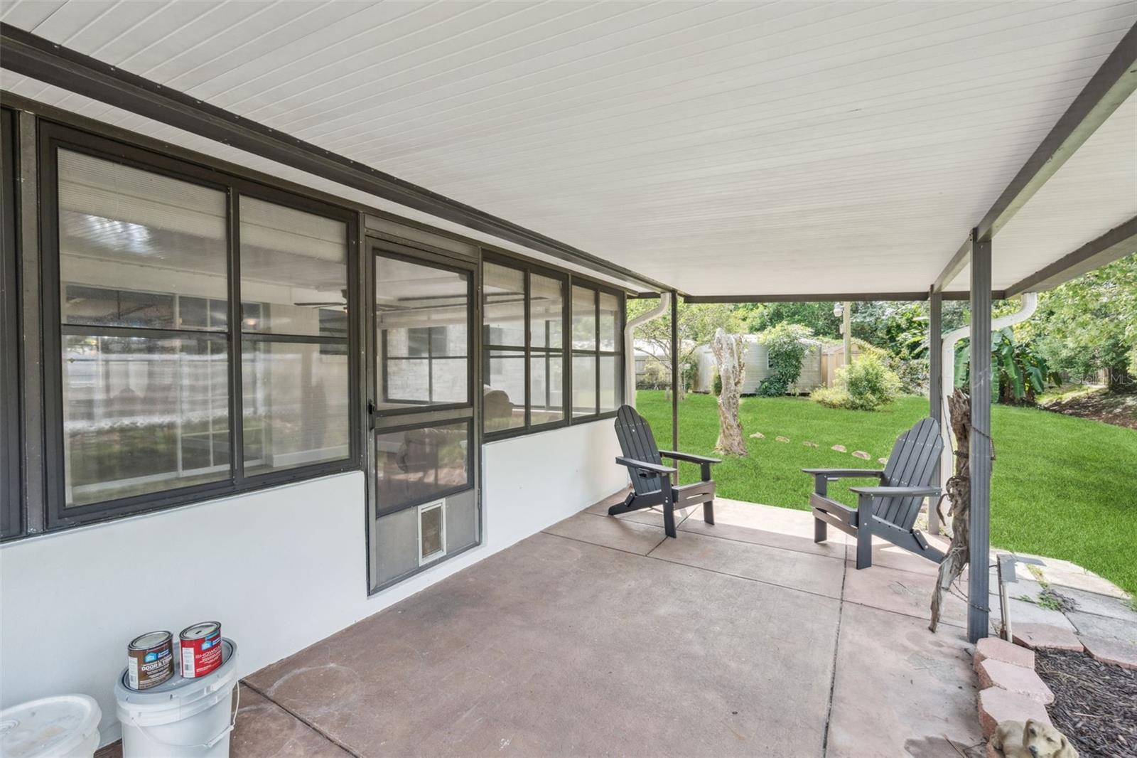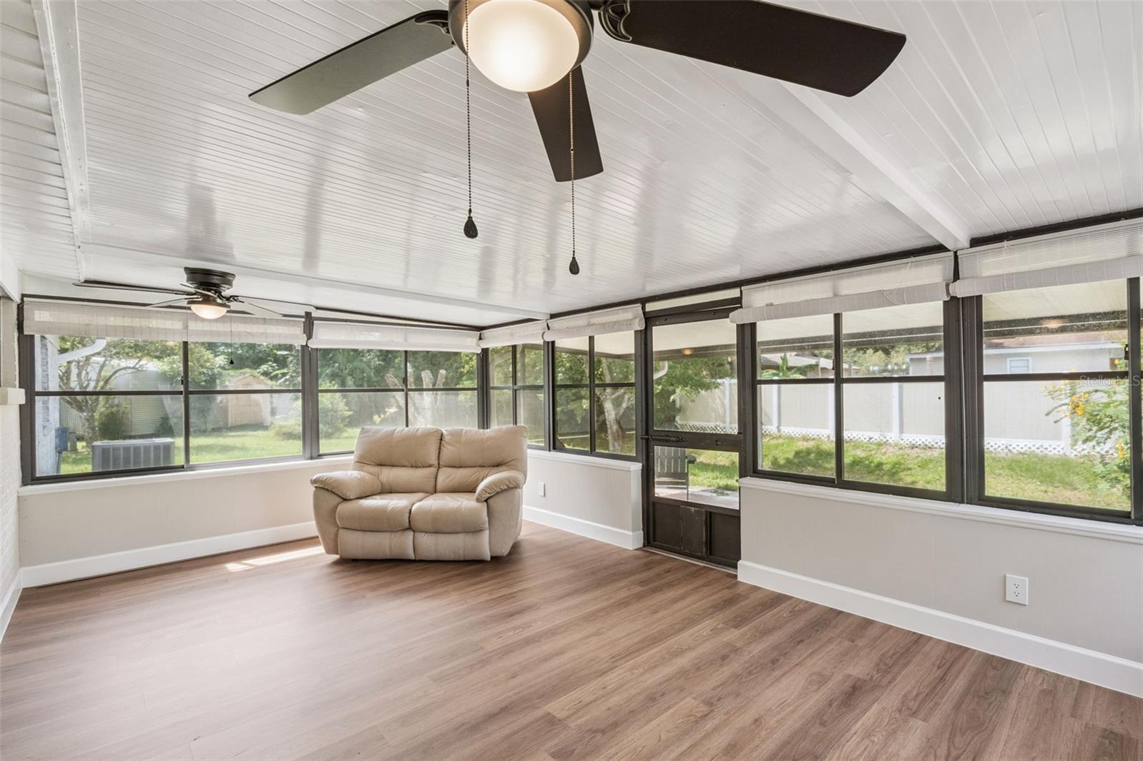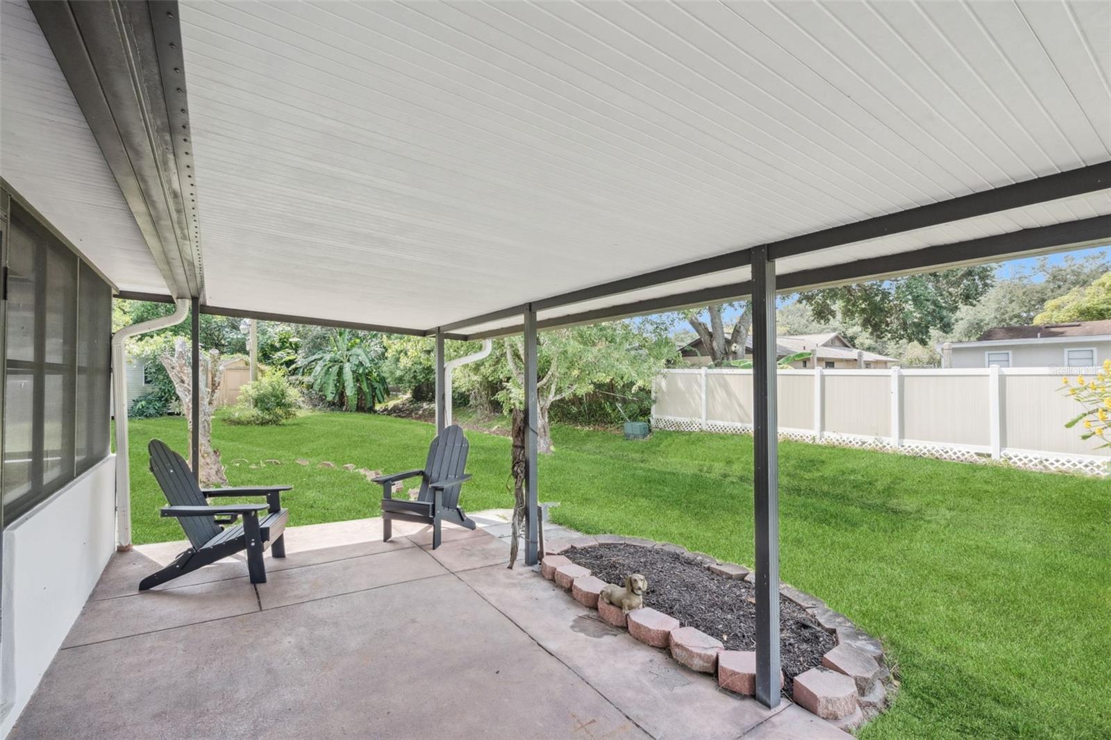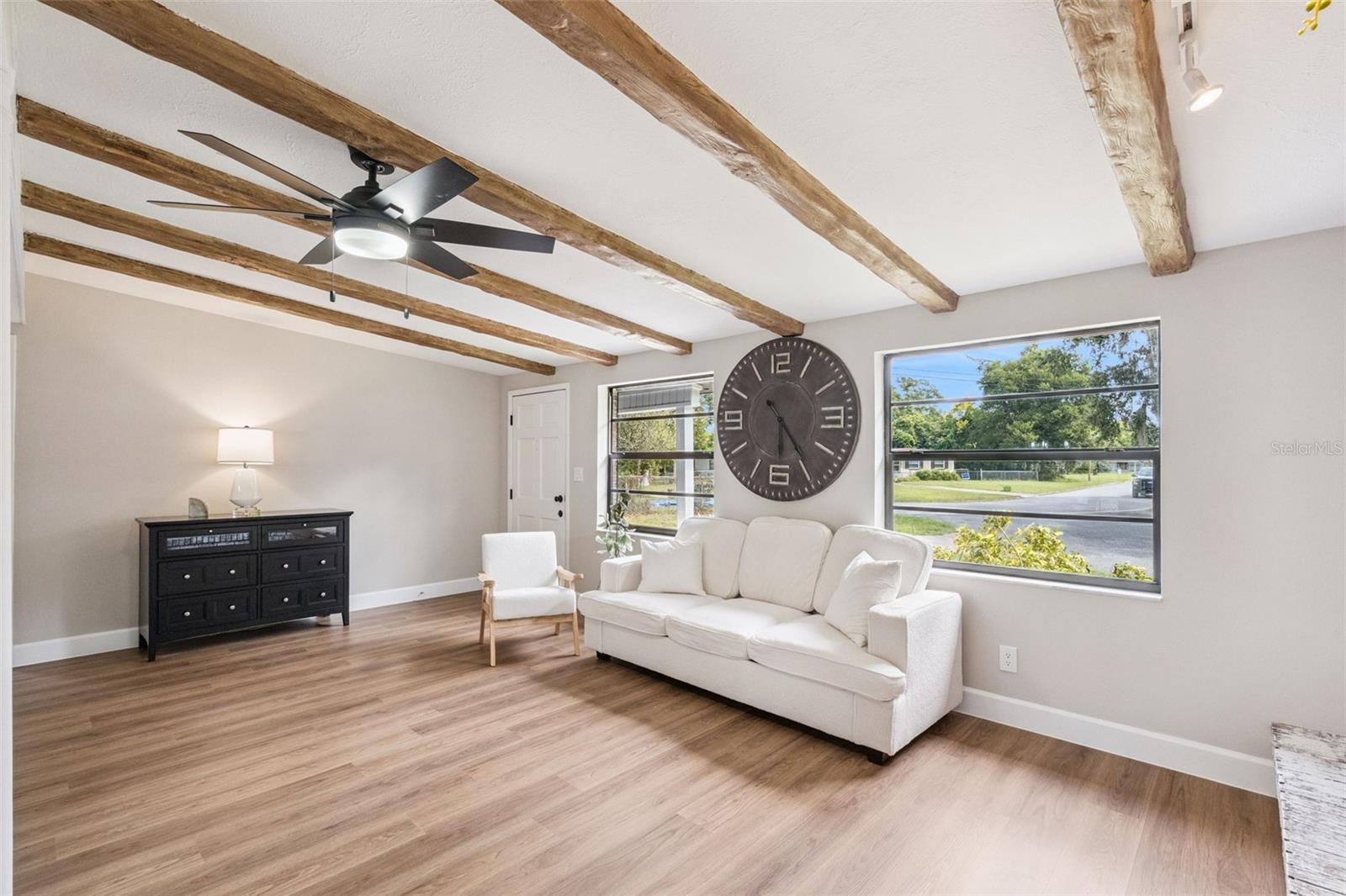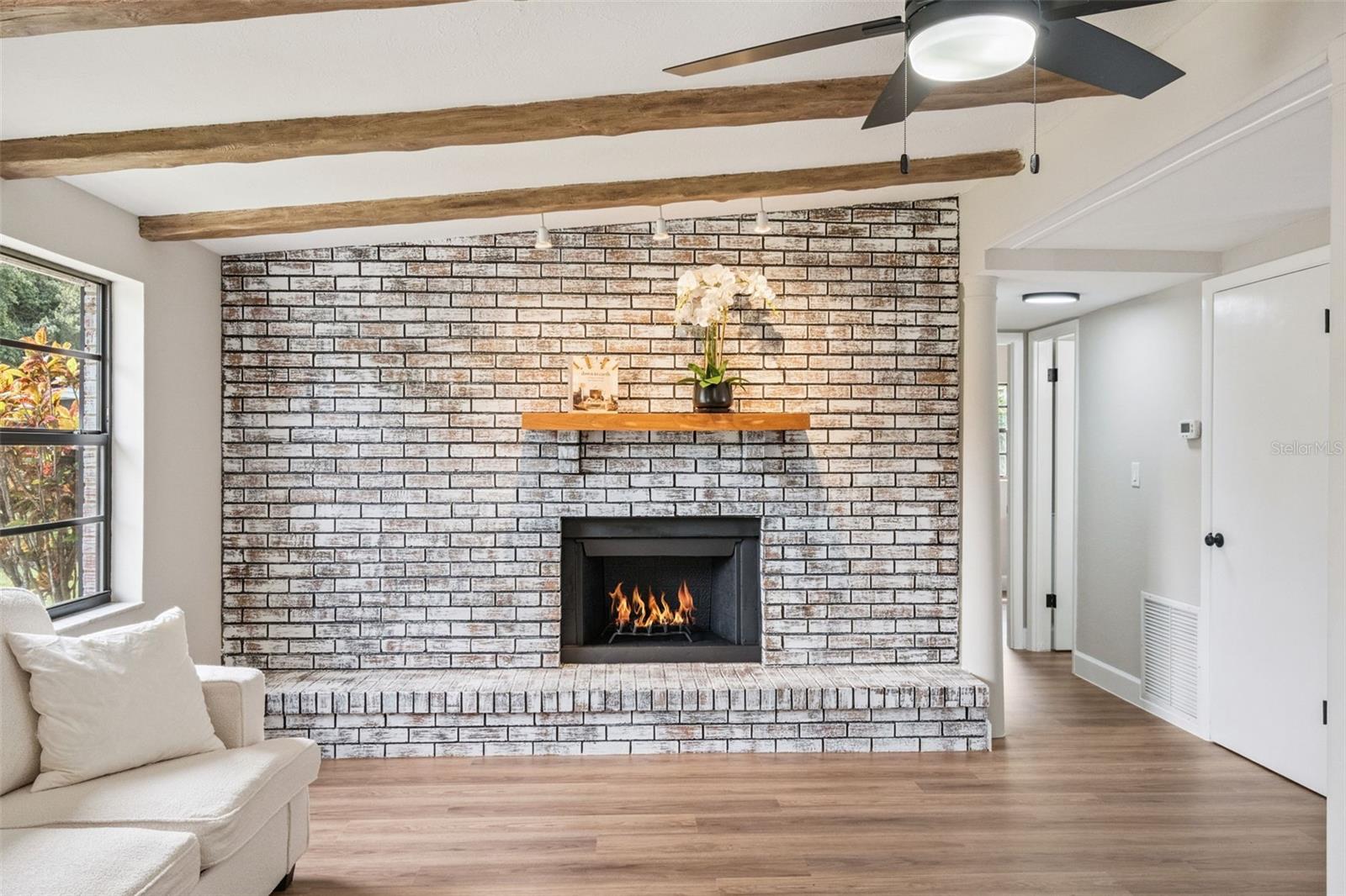 One or more photo(s) has been virtually staged. Embrace the charm of this Mid-Century Modern home that features 3 bedrooms and 1 and a half bathrooms. With a new roof installed in 2025 and numerous updates, this inviting space welcomes you. Step into the living room, where a striking floor-to-ceiling fireplace and decorative ceiling beams create a warm atmosphere. The kitchen shines with new solid surface countertops and brand new stainless steel appliances (to be delivered soon), set to elevate your culinary experiences. The spacious primary bedroom offers a peaceful retreat, while the split floor plan ensures privacy throughout the home. At the back, the bright Florida room invites you to unwind or entertain in comfort. The generously sized laundry room provides versatility for an office or craft space, catering to your creativity. Nestled on an oversized lot in a cul-de-sac, this property provides abundant outdoor space and two storage sheds for your needs. This home is a remarkable opportunity—schedule a showing today!