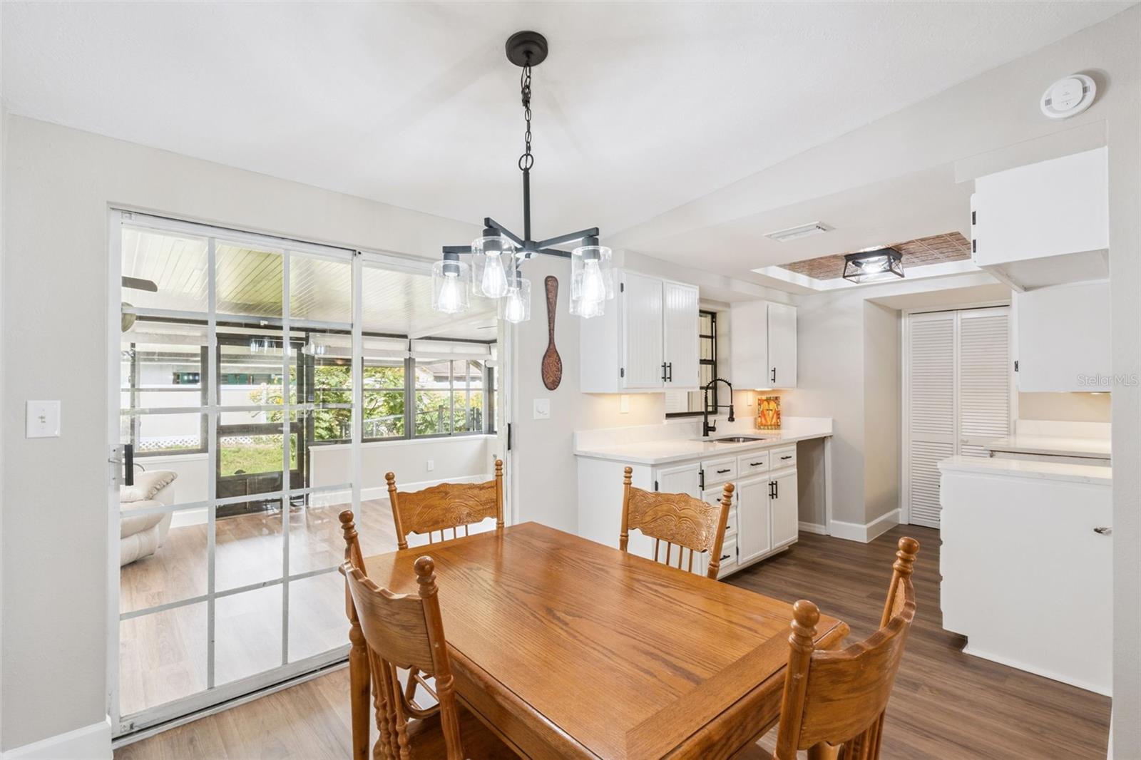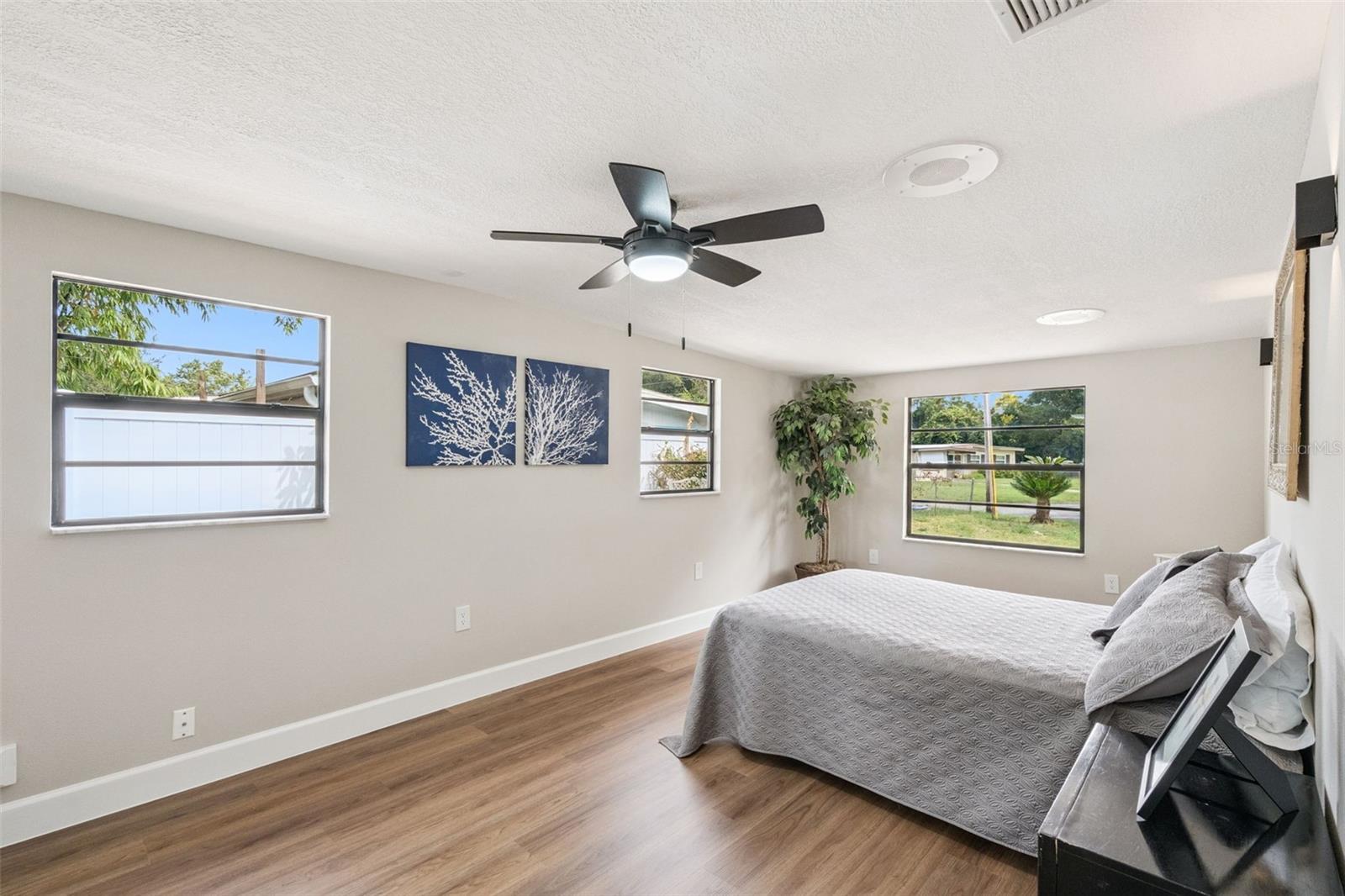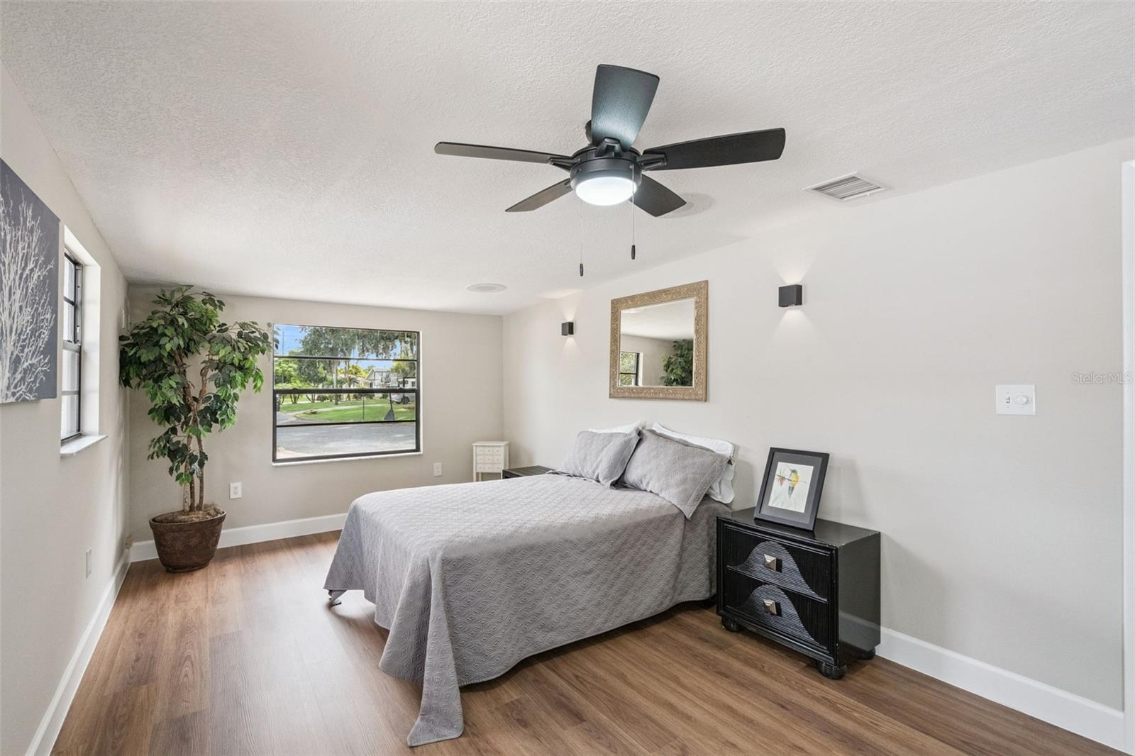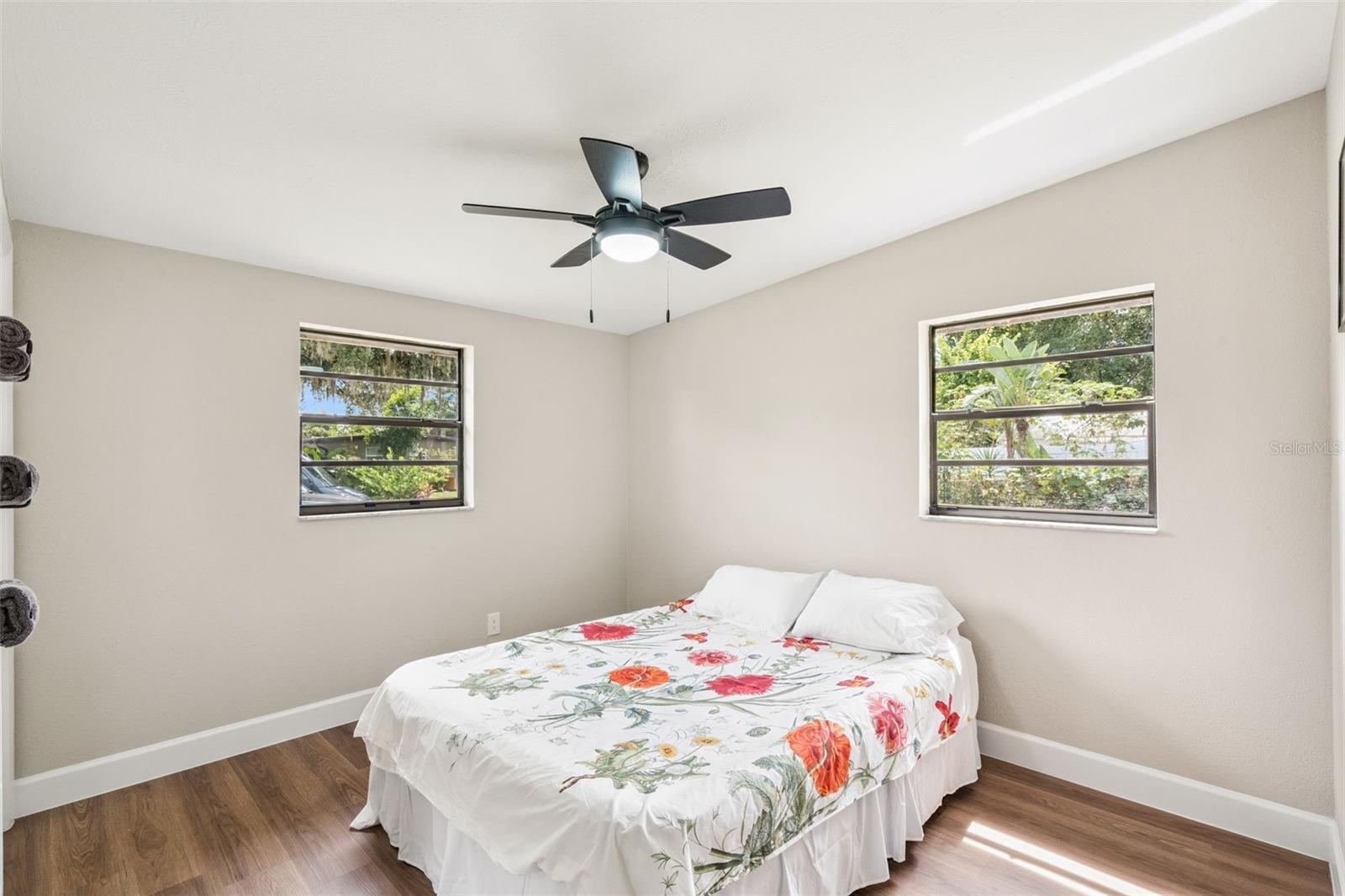 One or more photo(s) has been virtually staged. Embrace the charm of this Mid-Century Modern home that features 3 bedrooms and 1 and a half bathrooms. With a new roof installed in 2025 and numerous updates, this inviting space welcomes you. Step into the living room, where a striking floor-to-ceiling fireplace and decorative ceiling beams create a warm atmosphere. The kitchen shines with new solid surface countertops and brand new stainless steel appliances (to be delivered soon), set to elevate your culinary experiences. The spacious primary bedroom offers a peaceful retreat, while the split floor plan ensures privacy throughout the home. At the back, the bright Florida room invites you to unwind or entertain in comfort. The generously sized laundry room provides versatility for an office or craft space, catering to your creativity. Nestled on an oversized lot in a cul-de-sac, this property provides abundant outdoor space and two storage sheds for your needs. This home is a remarkable opportunity—schedule a showing today!